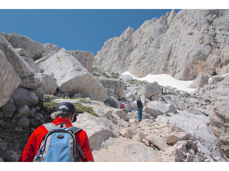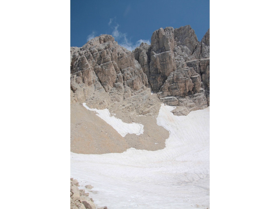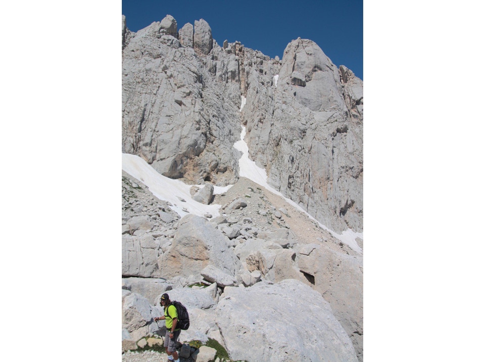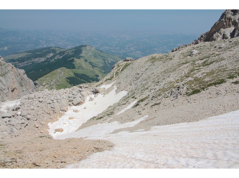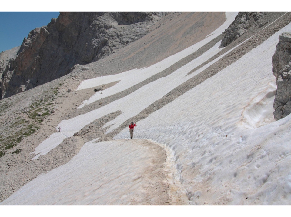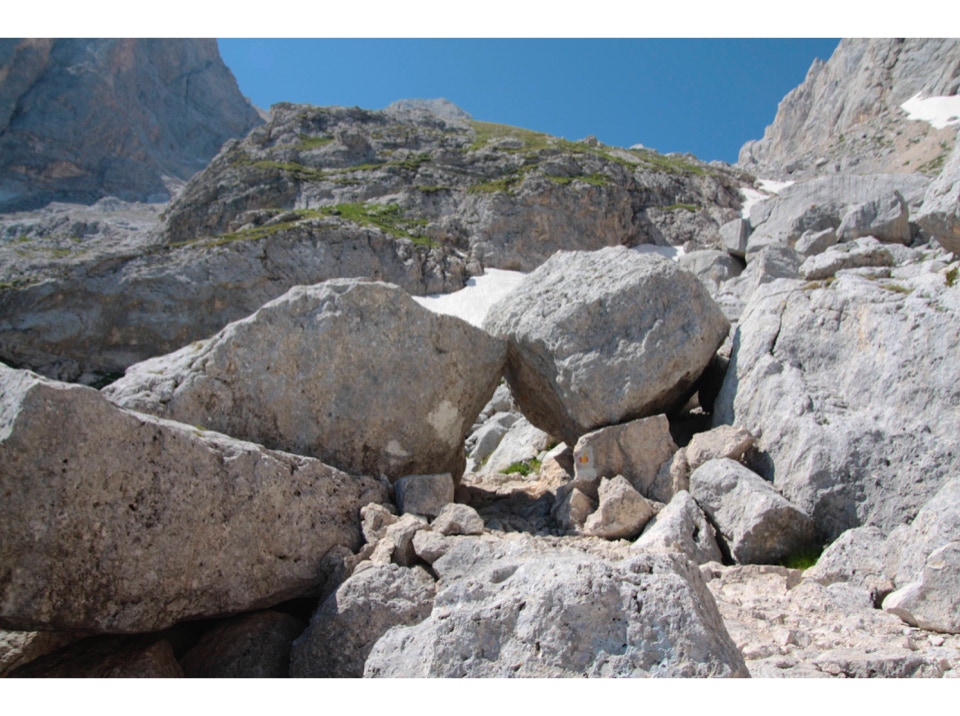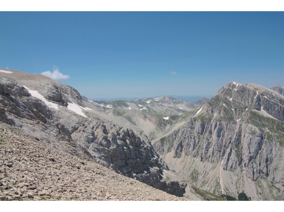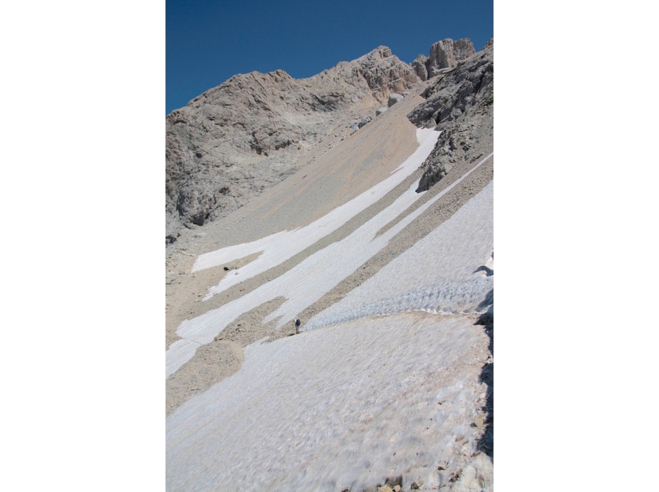 Attraversato il Passo delle Scalette (2100 mt) il sentiero si snoda tra grossi massi (caratteristico l'arco formato tra due di questi) fino a raggiungere, verso sinistra lo sperone roccioso che divide in due la valle. Un breve tratto più impegnativo (esposto, corda fissa) permette di superarlo. Si continua con tornanti e tra massi fino ad obliquare a sinistra al rifugio Franchetti (2433 mt). Dopo una doverosa sosta al rifugio si riprende, a destra, il sentiero che rapidamente permette di raggiungere la Sella dei Due Corni (2547 mt). Bella vista sulla Val Maone, i pilastri di Pizzo Intermesoli e le vicinissime Fiamme di Pietra. Si continua su ghiaie in direzione del passo del Cannone (2679 mt) fino al bivio che, a sinistra in saliscendi, permette di raggiungere l'ampia conca alla base del ghiacciaio del Calderone. L'anfiteatro, dominato dalle vette del Corno Grande, è splendido!