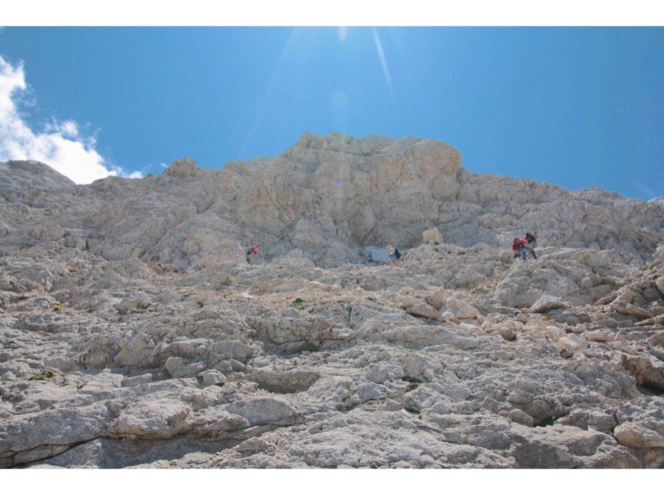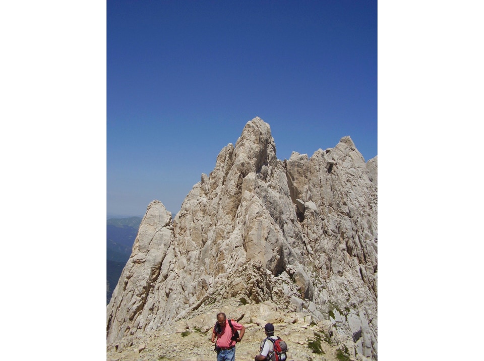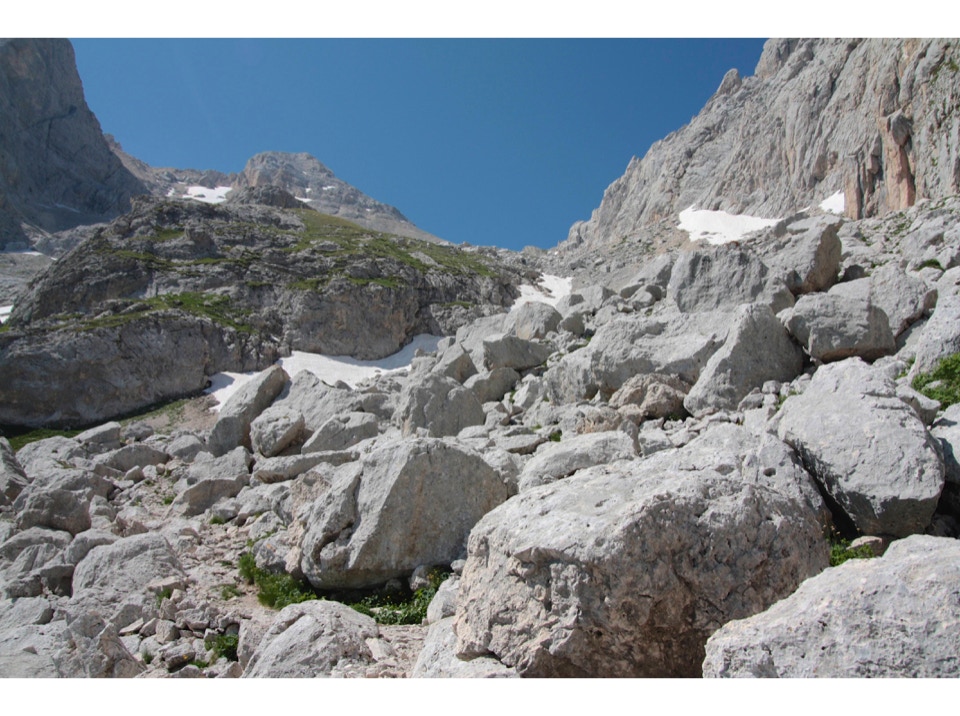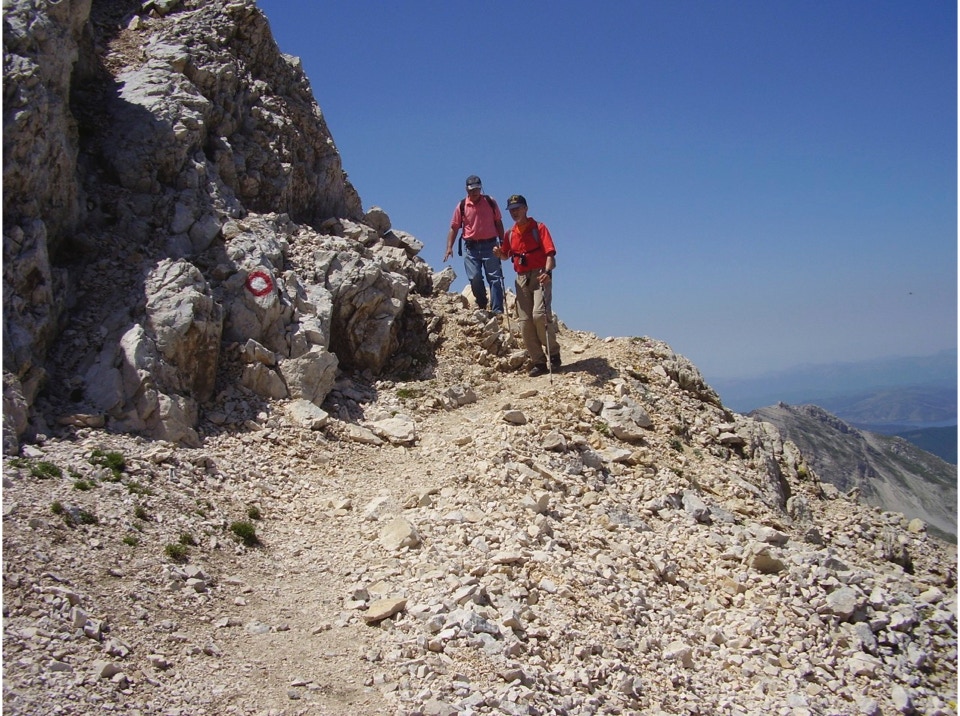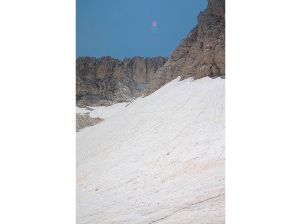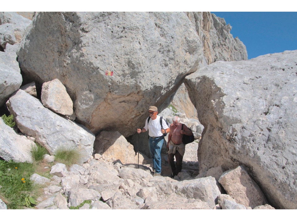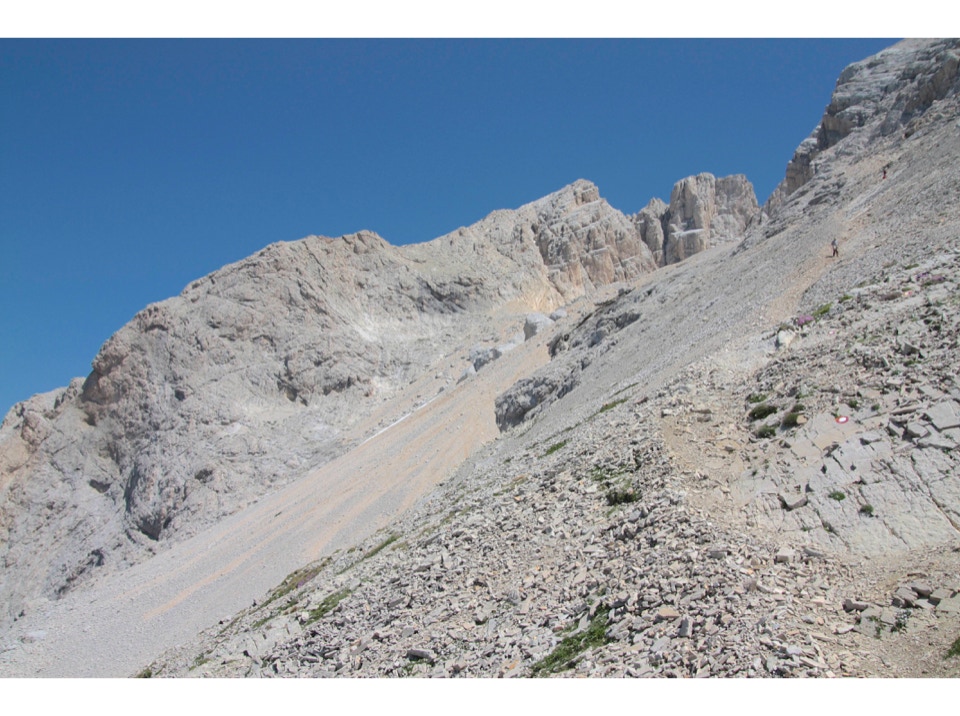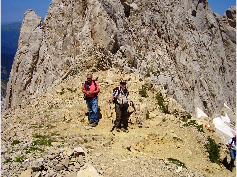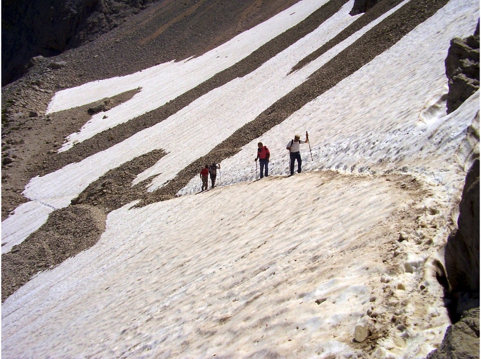Attraversato il Passo delle Scalette (2100 mt) il sentiero si snoda tra grossi massi (caratteristico l'arco formato tra due di questi) fino a raggiungere, verso sinistra lo sperone roccioso che divide in due la valle. Un breve tratto più impegnativo (esposto, corda fissa) permette di superarlo. Si continua con tornanti e tra massi fino ad obliquare a sinistra al rifugio Franchetti (2433 mt). Dopo una doverosa sosta al rifugio si riprende, a destra, il sentiero che rapidamente permette di raggiungere la Sella dei Due Corni (2547 mt). Bella vista sulla Val Maone, i pilastri di Pizzo Intermesoli e le vicinissime Fiamme di Pietra. Si continua su ghiaie in direzione del passo del Cannone (2679 mt) fino al bivio che, a sinistra in saliscendi, permette di raggiungere l'ampia conca alla base del ghiacciaio del Calderone. L'anfiteatro, dominato dalle vette del Corno Grande, è splendido!