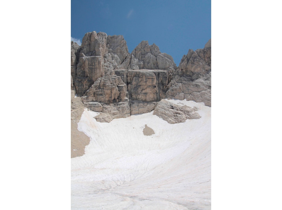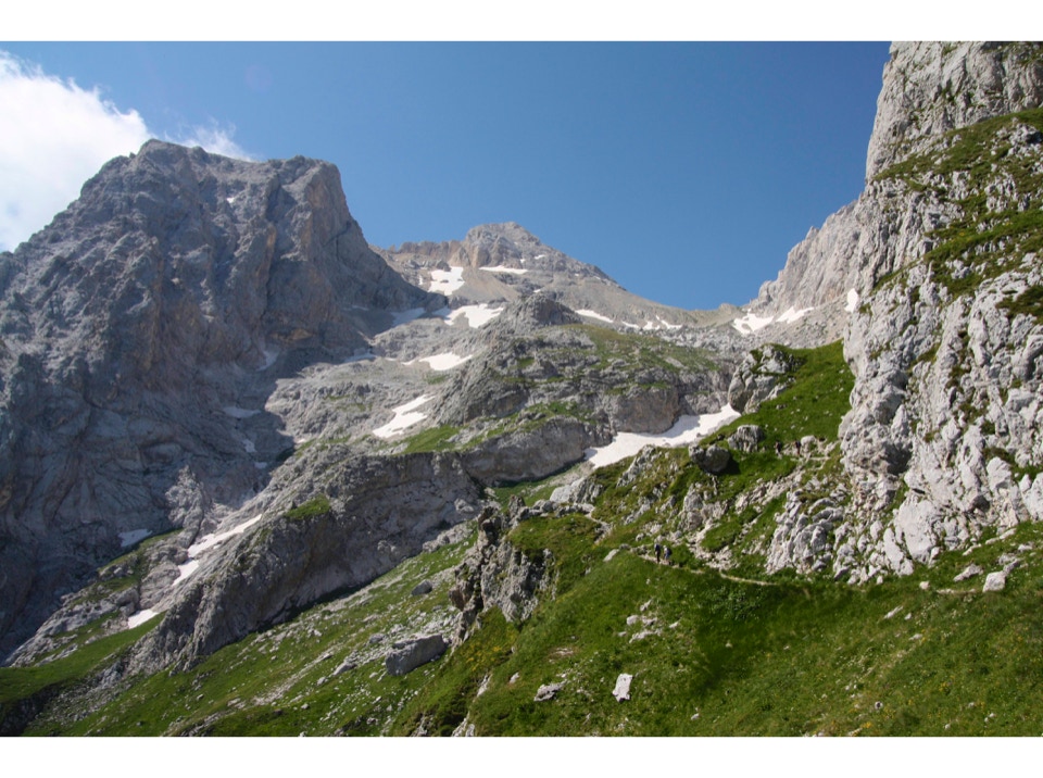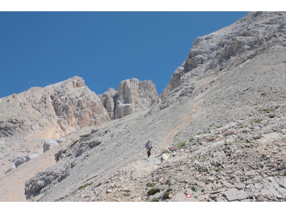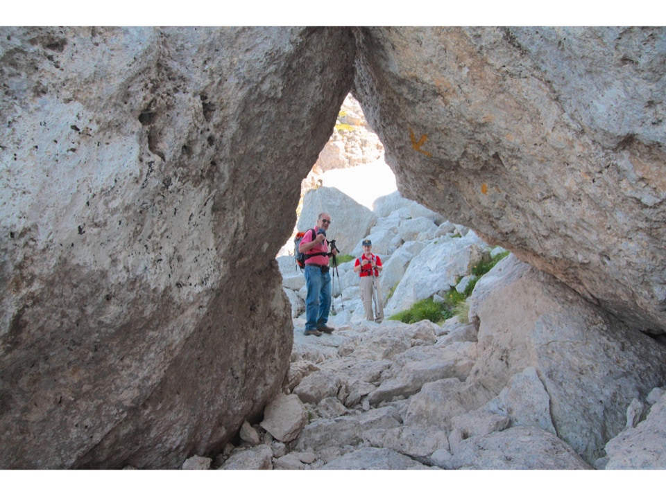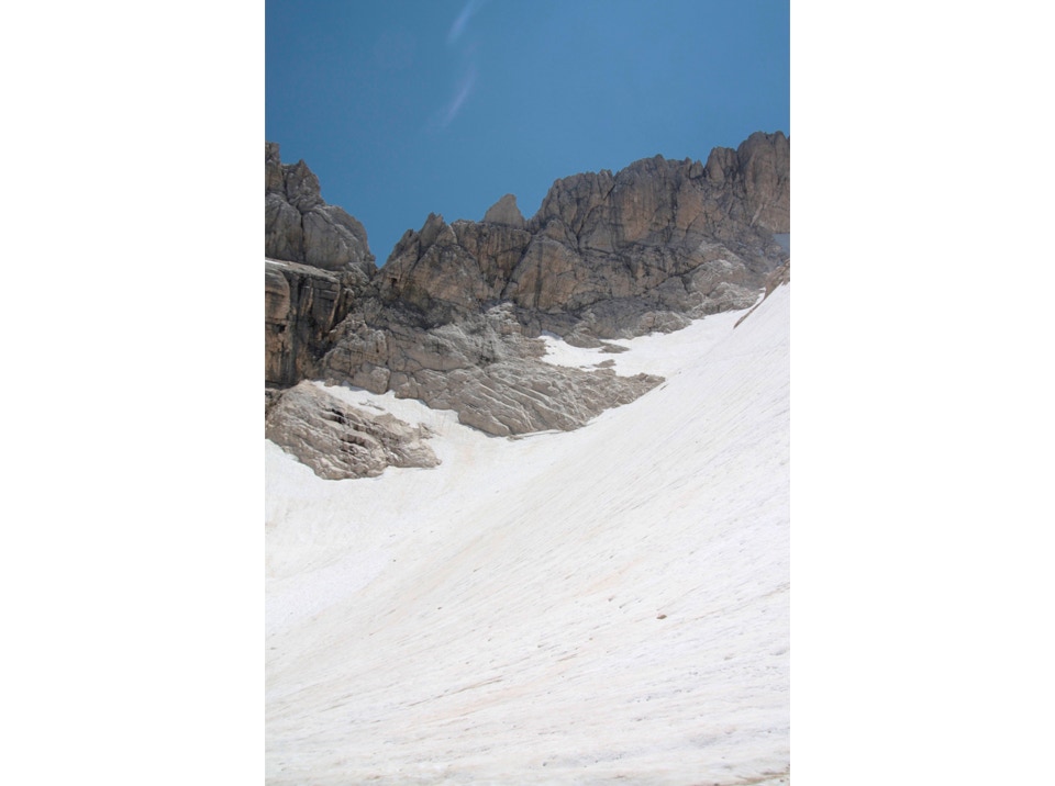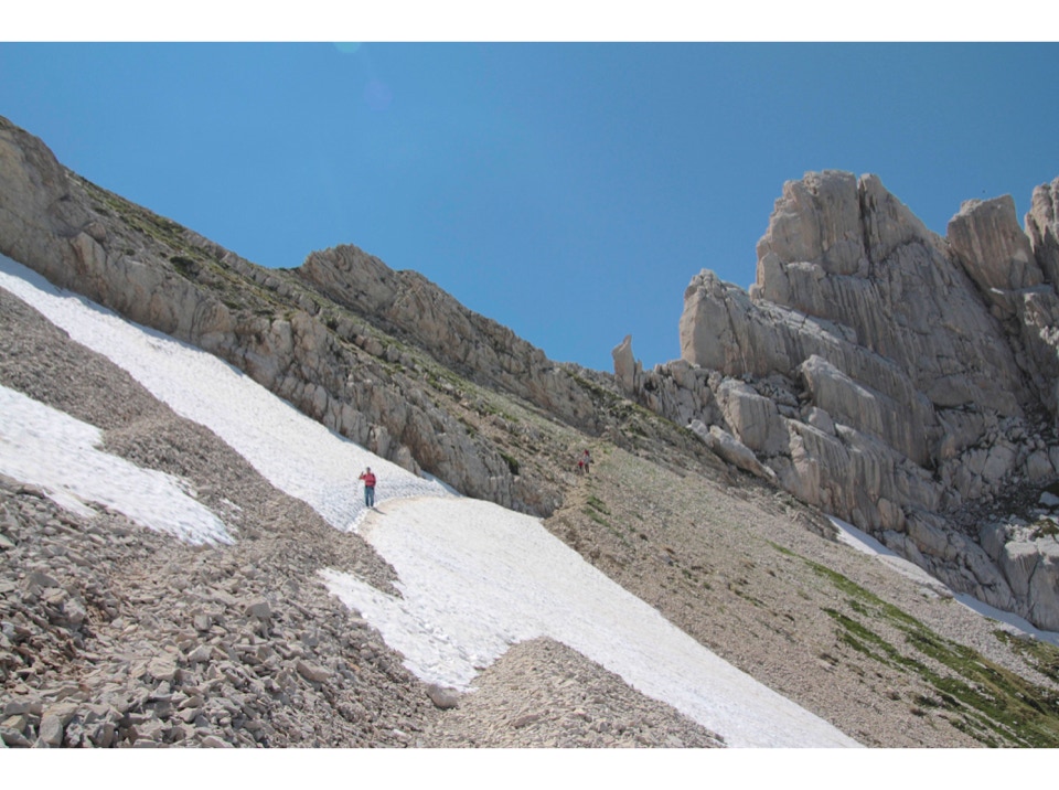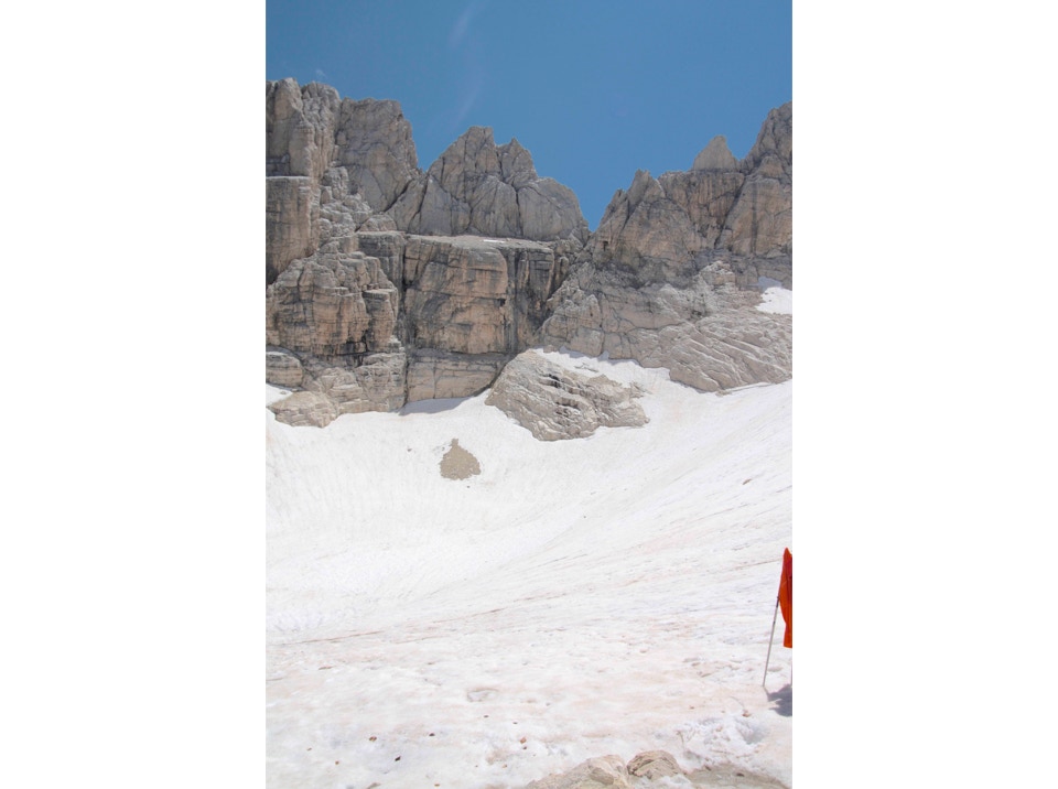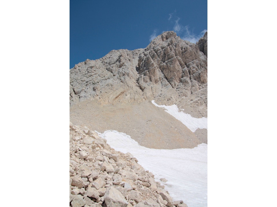 Attraversato il Passo delle Scalette (2100 mt) il sentiero si snoda tra grossi massi (caratteristico l'arco formato tra due di questi) fino a raggiungere, verso sinistra lo sperone roccioso che divide in due la valle. Un breve tratto più impegnativo (esposto, corda fissa) permette di superarlo. Si continua con tornanti e tra massi fino ad obliquare a sinistra al rifugio Franchetti (2433 mt). Dopo una doverosa sosta al rifugio si riprende, a destra, il sentiero che rapidamente permette di raggiungere la Sella dei Due Corni (2547 mt). Bella vista sulla Val Maone, i pilastri di Pizzo Intermesoli e le vicinissime Fiamme di Pietra. Si continua su ghiaie in direzione del passo del Cannone (2679 mt) fino al bivio che, a sinistra in saliscendi, permette di raggiungere l'ampia conca alla base del ghiacciaio del Calderone. L'anfiteatro, dominato dalle vette del Corno Grande, è splendido!