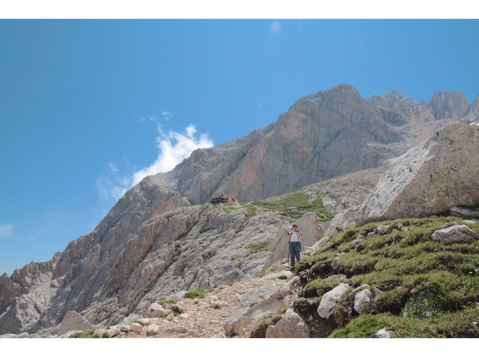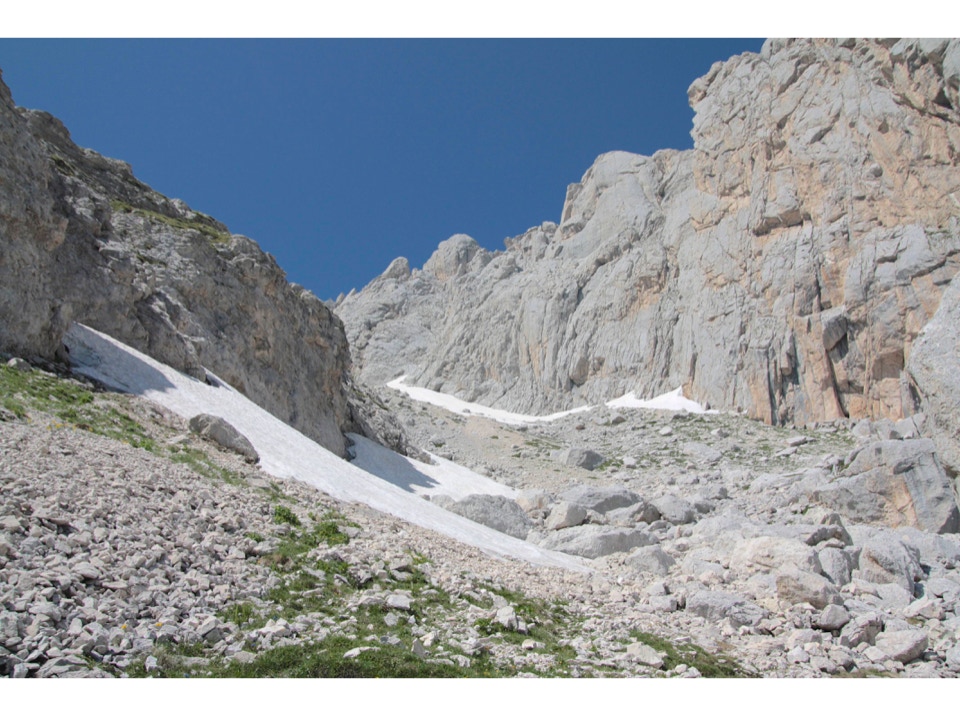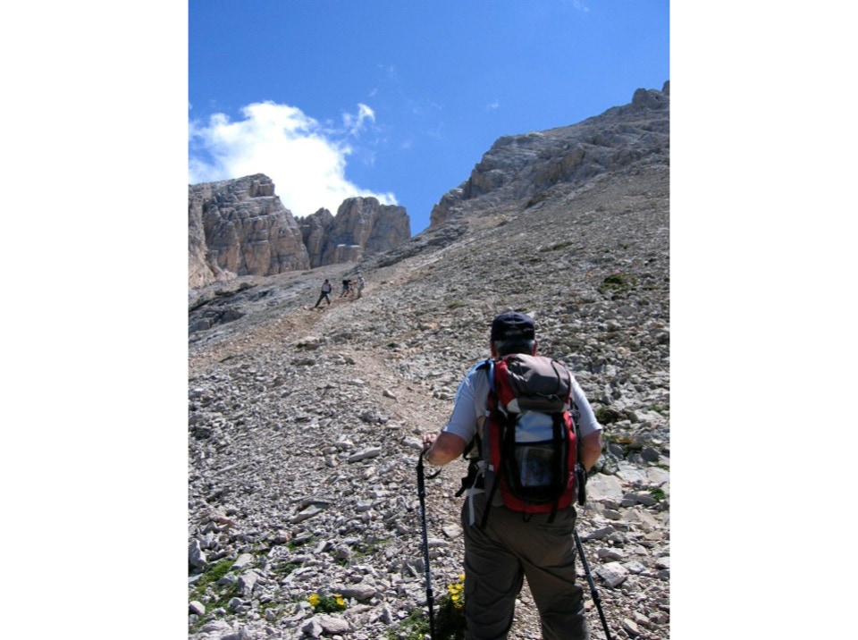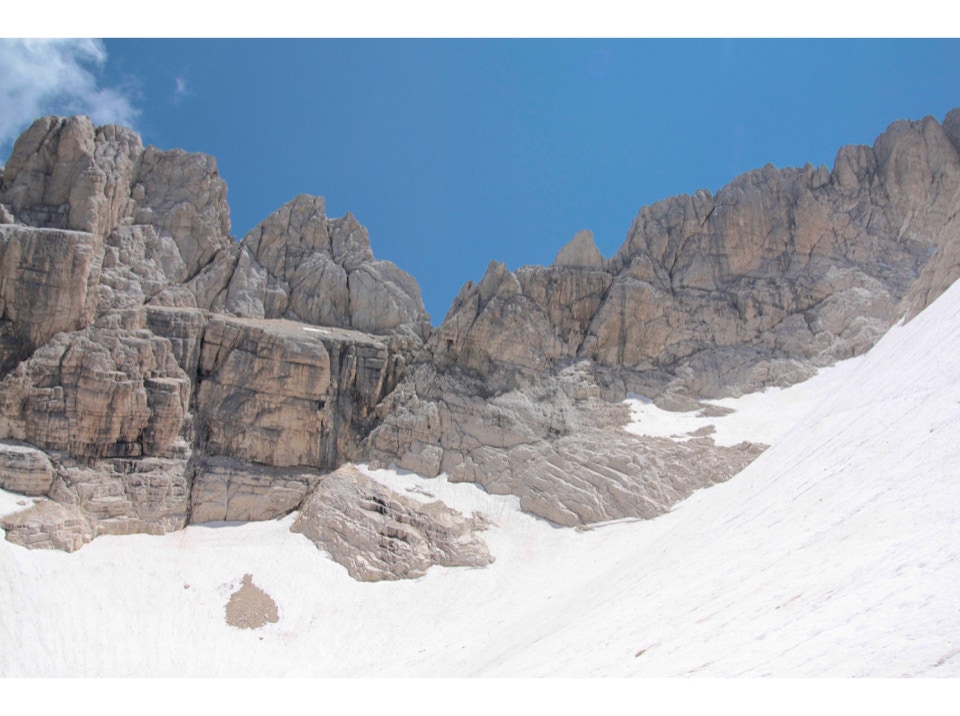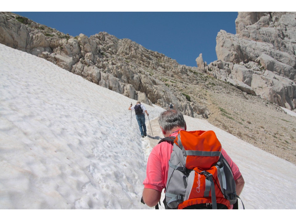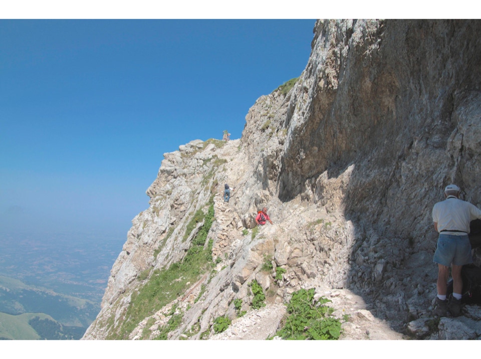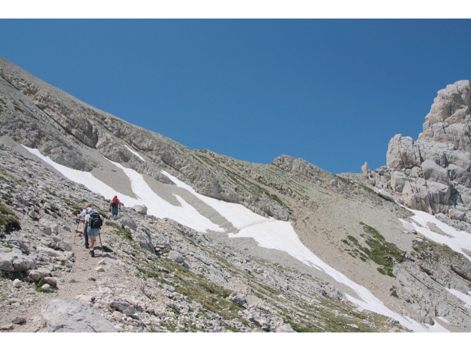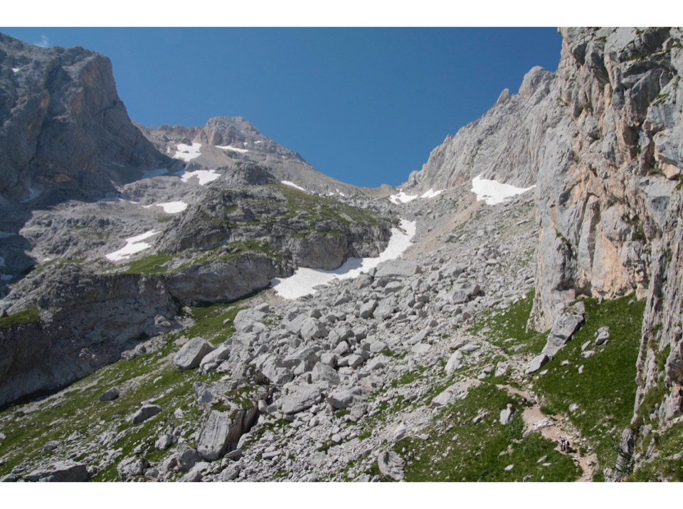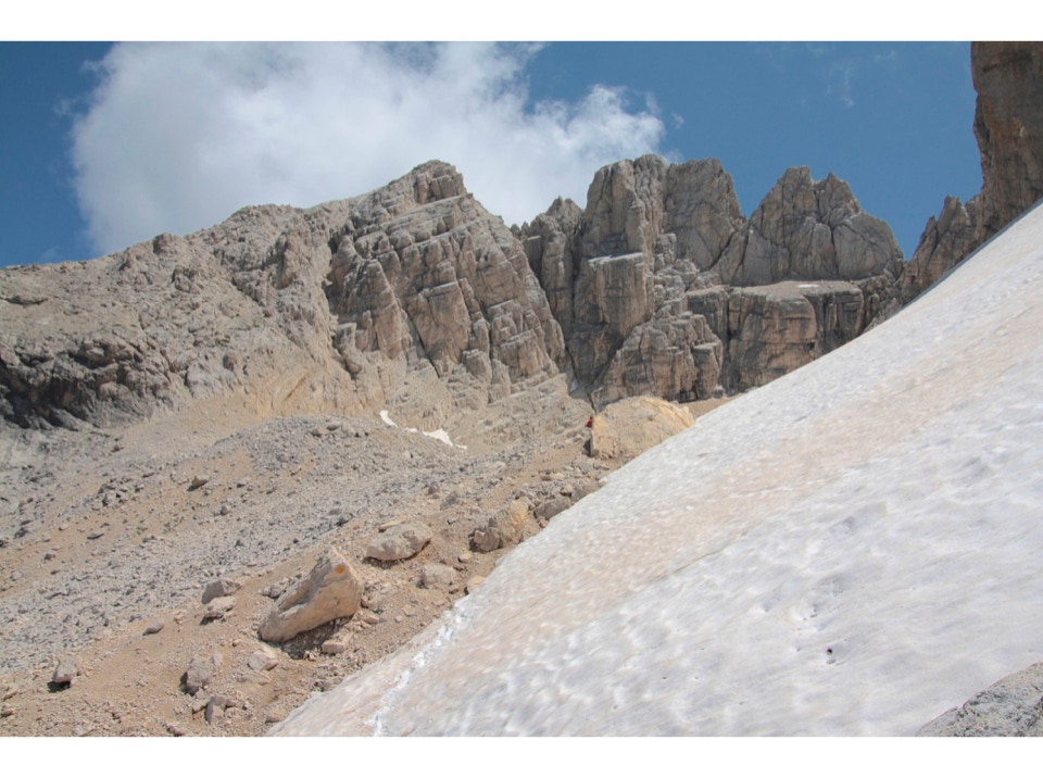 Attraversato il Passo delle Scalette (2100 mt) il sentiero si snoda tra grossi massi (caratteristico l'arco formato tra due di questi) fino a raggiungere, verso sinistra lo sperone roccioso che divide in due la valle. Un breve tratto più impegnativo (esposto, corda fissa) permette di superarlo. Si continua con tornanti e tra massi fino ad obliquare a sinistra al rifugio Franchetti (2433 mt). Dopo una doverosa sosta al rifugio si riprende, a destra, il sentiero che rapidamente permette di raggiungere la Sella dei Due Corni (2547 mt). Bella vista sulla Val Maone, i pilastri di Pizzo Intermesoli e le vicinissime Fiamme di Pietra. Si continua su ghiaie in direzione del passo del Cannone (2679 mt) fino al bivio che, a sinistra in saliscendi, permette di raggiungere l'ampia conca alla base del ghiacciaio del Calderone. L'anfiteatro, dominato dalle vette del Corno Grande, è splendido!