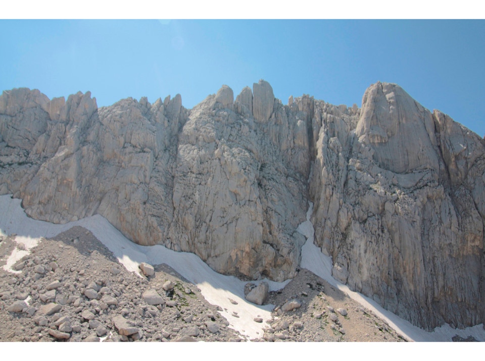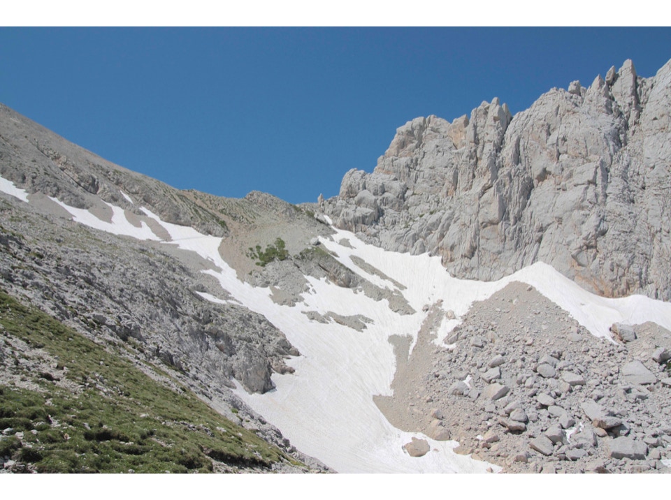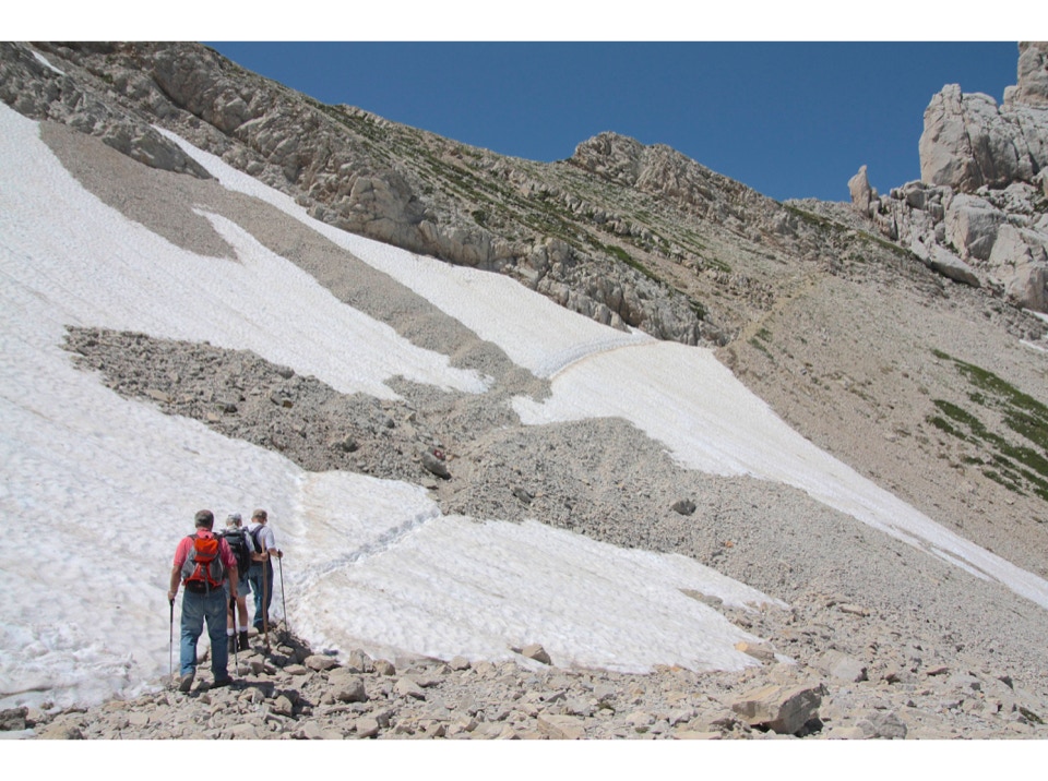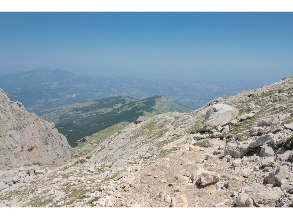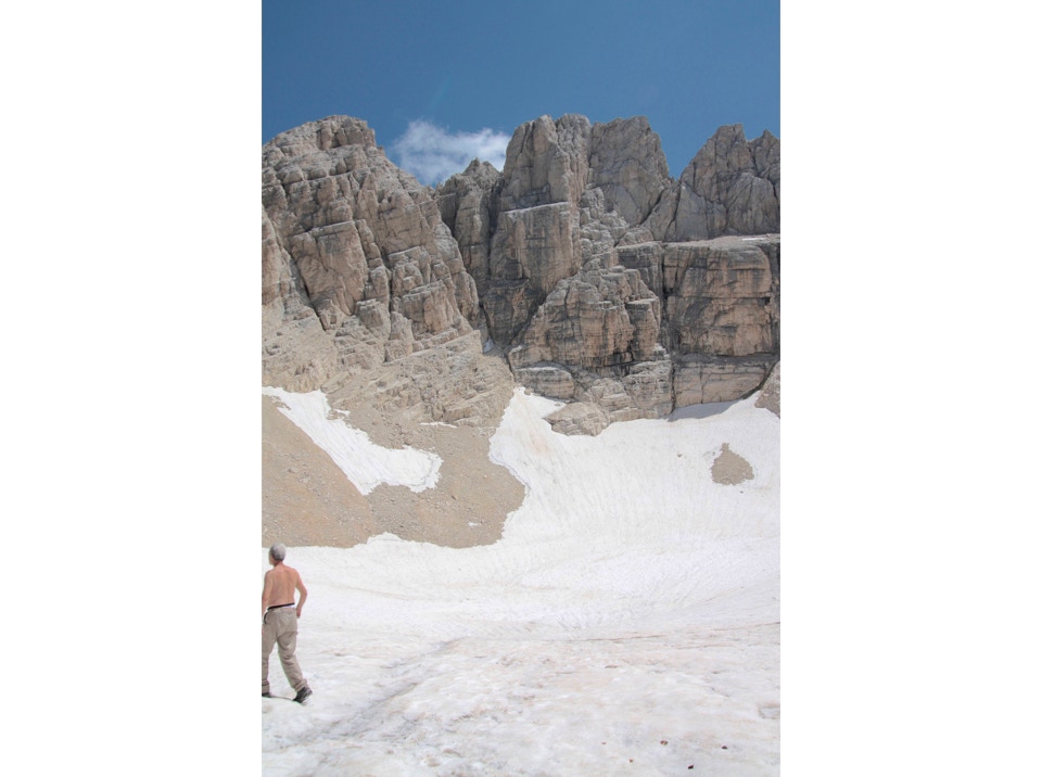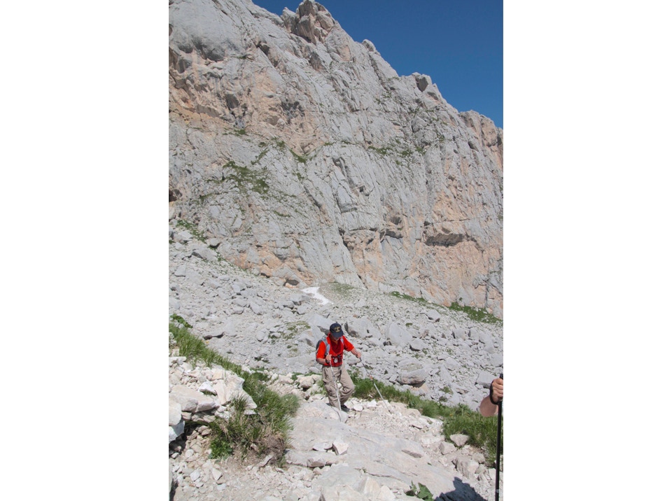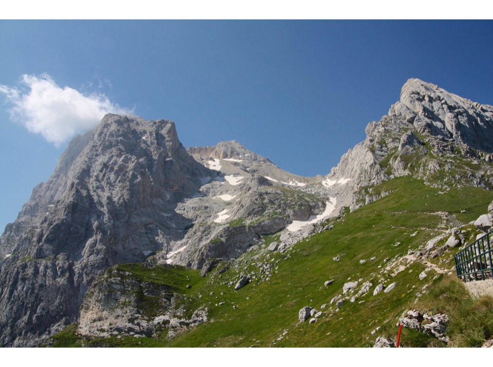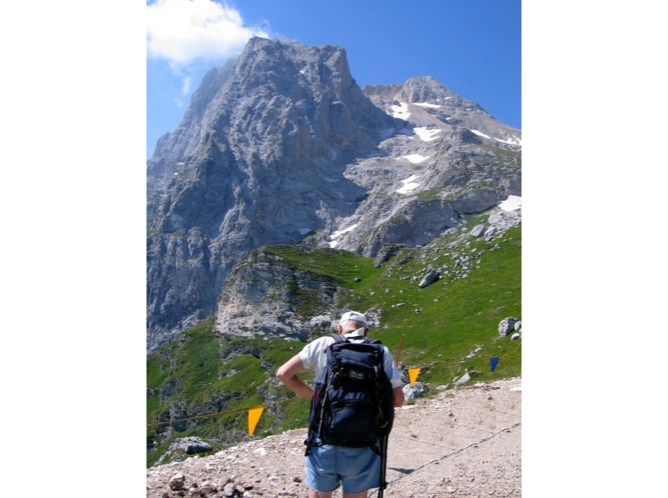 Attraversato il Passo delle Scalette (2100 mt) il sentiero si snoda tra grossi massi (caratteristico l'arco formato tra due di questi) fino a raggiungere, verso sinistra lo sperone roccioso che divide in due la valle. Un breve tratto più impegnativo (esposto, corda fissa) permette di superarlo. Si continua con tornanti e tra massi fino ad obliquare a sinistra al rifugio Franchetti (2433 mt). Dopo una doverosa sosta al rifugio si riprende, a destra, il sentiero che rapidamente permette di raggiungere la Sella dei Due Corni (2547 mt). Bella vista sulla Val Maone, i pilastri di Pizzo Intermesoli e le vicinissime Fiamme di Pietra. Si continua su ghiaie in direzione del passo del Cannone (2679 mt) fino al bivio che, a sinistra in saliscendi, permette di raggiungere l'ampia conca alla base del ghiacciaio del Calderone. L'anfiteatro, dominato dalle vette del Corno Grande, è splendido!