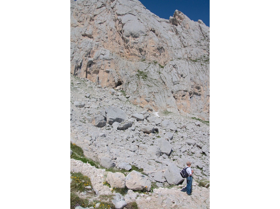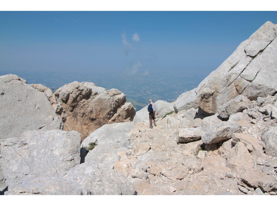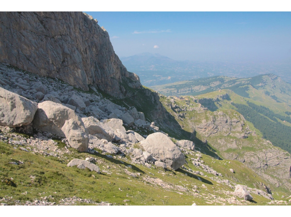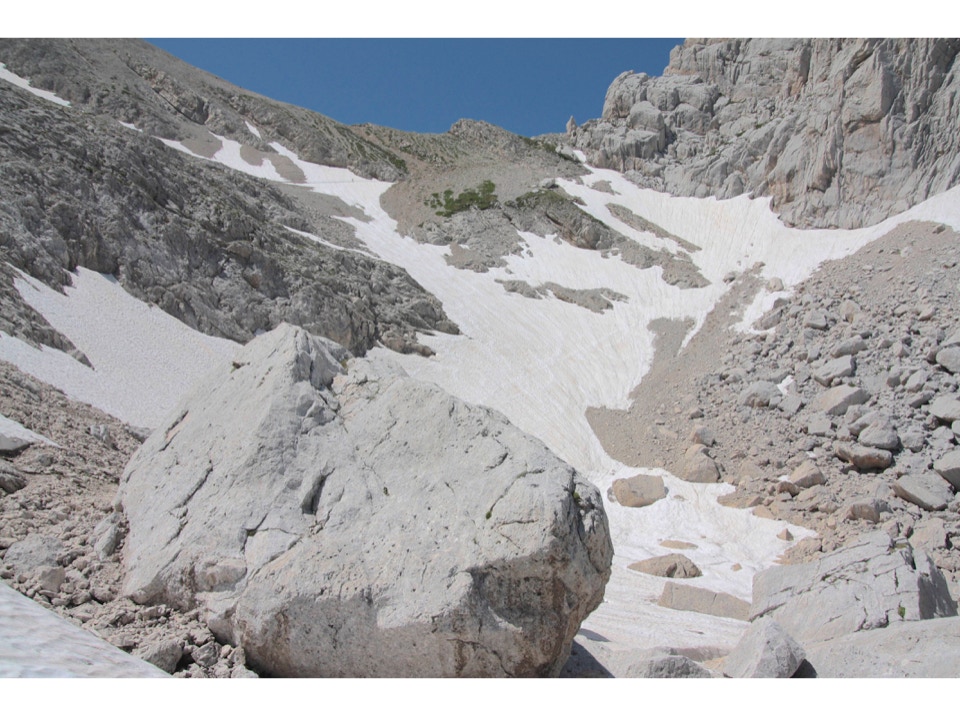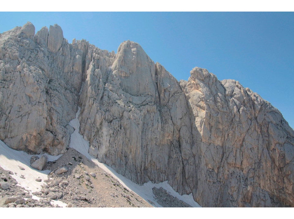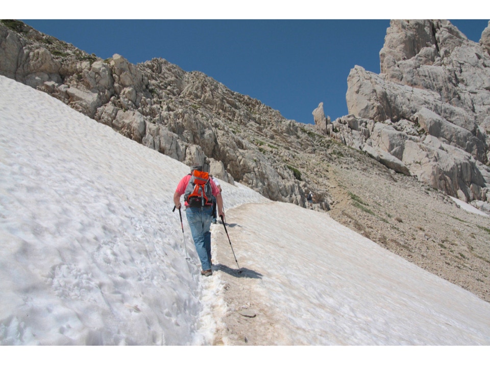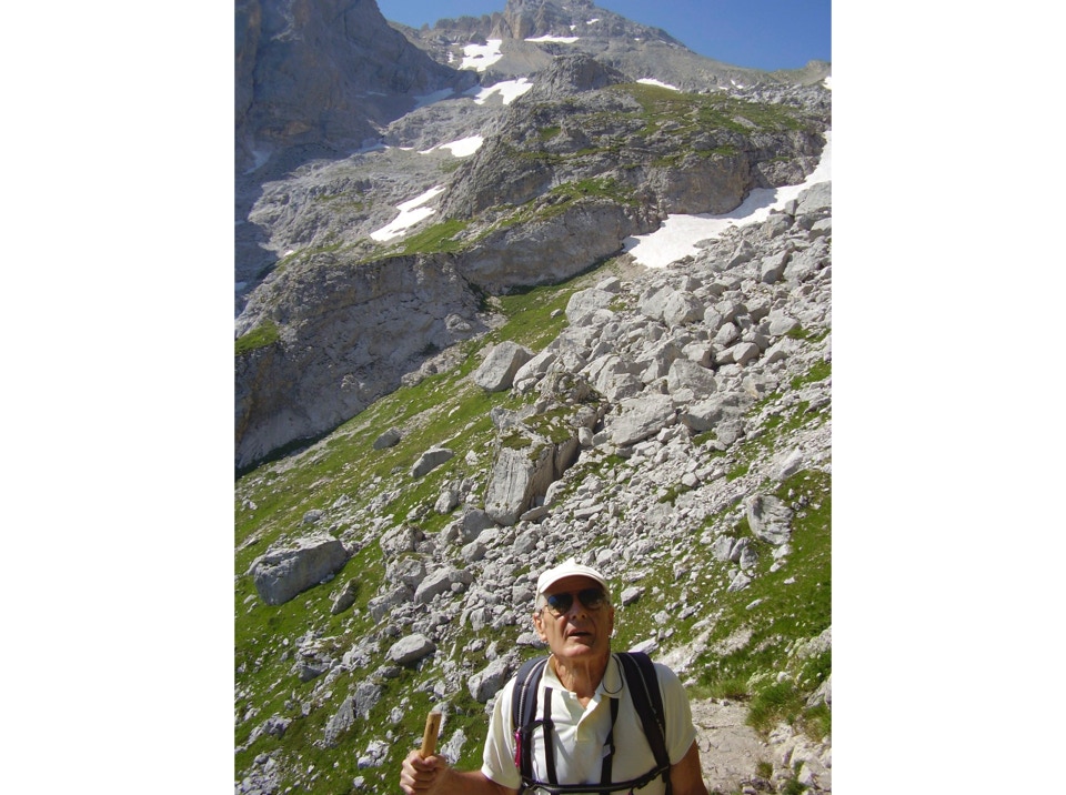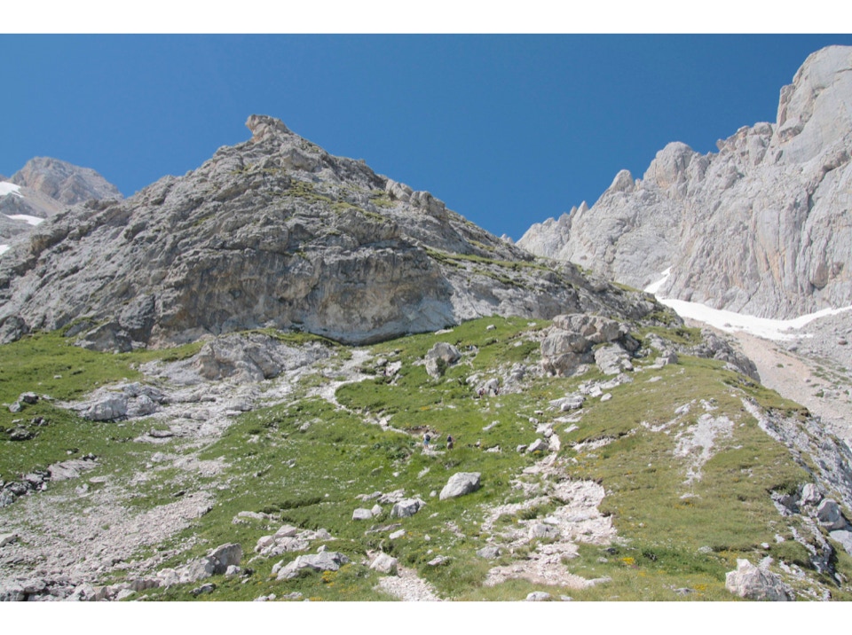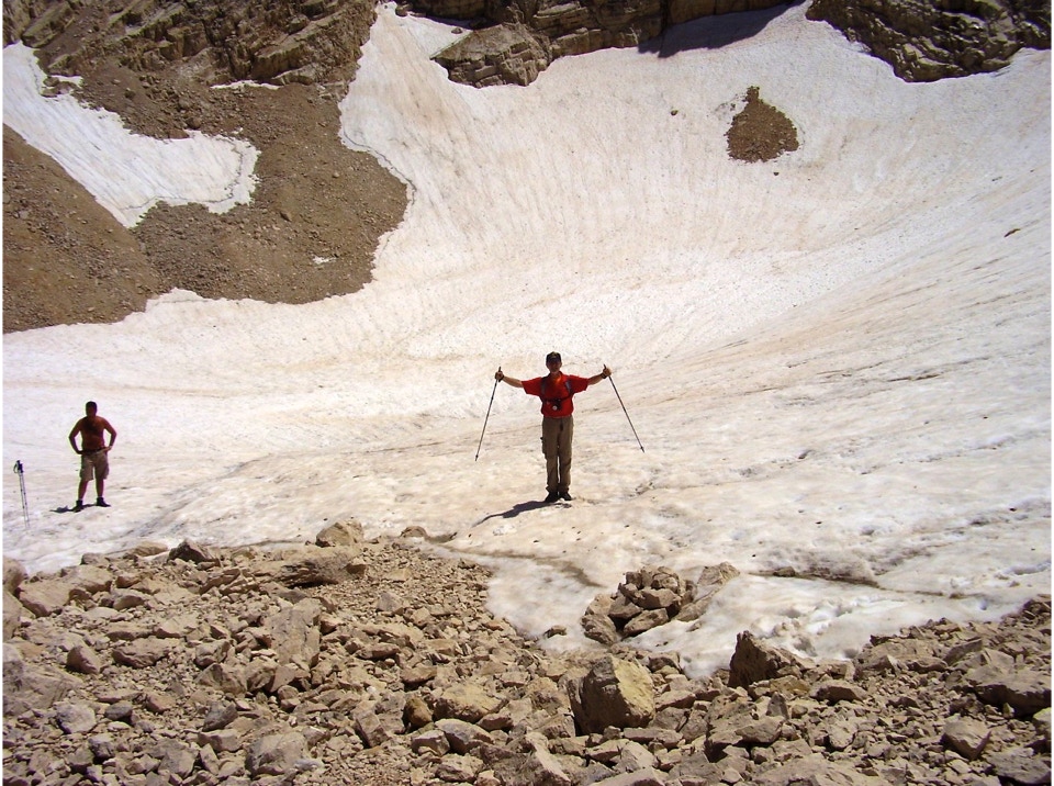 Attraversato il Passo delle Scalette (2100 mt) il sentiero si snoda tra grossi massi (caratteristico l'arco formato tra due di questi) fino a raggiungere, verso sinistra lo sperone roccioso che divide in due la valle. Un breve tratto più impegnativo (esposto, corda fissa) permette di superarlo. Si continua con tornanti e tra massi fino ad obliquare a sinistra al rifugio Franchetti (2433 mt). Dopo una doverosa sosta al rifugio si riprende, a destra, il sentiero che rapidamente permette di raggiungere la Sella dei Due Corni (2547 mt). Bella vista sulla Val Maone, i pilastri di Pizzo Intermesoli e le vicinissime Fiamme di Pietra. Si continua su ghiaie in direzione del passo del Cannone (2679 mt) fino al bivio che, a sinistra in saliscendi, permette di raggiungere l'ampia conca alla base del ghiacciaio del Calderone. L'anfiteatro, dominato dalle vette del Corno Grande, è splendido!