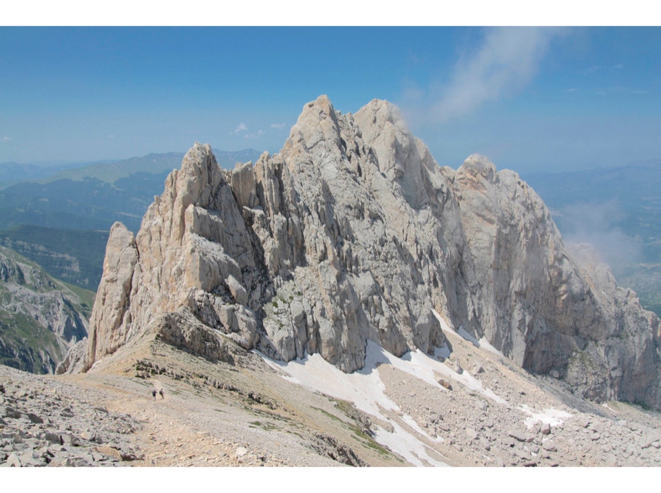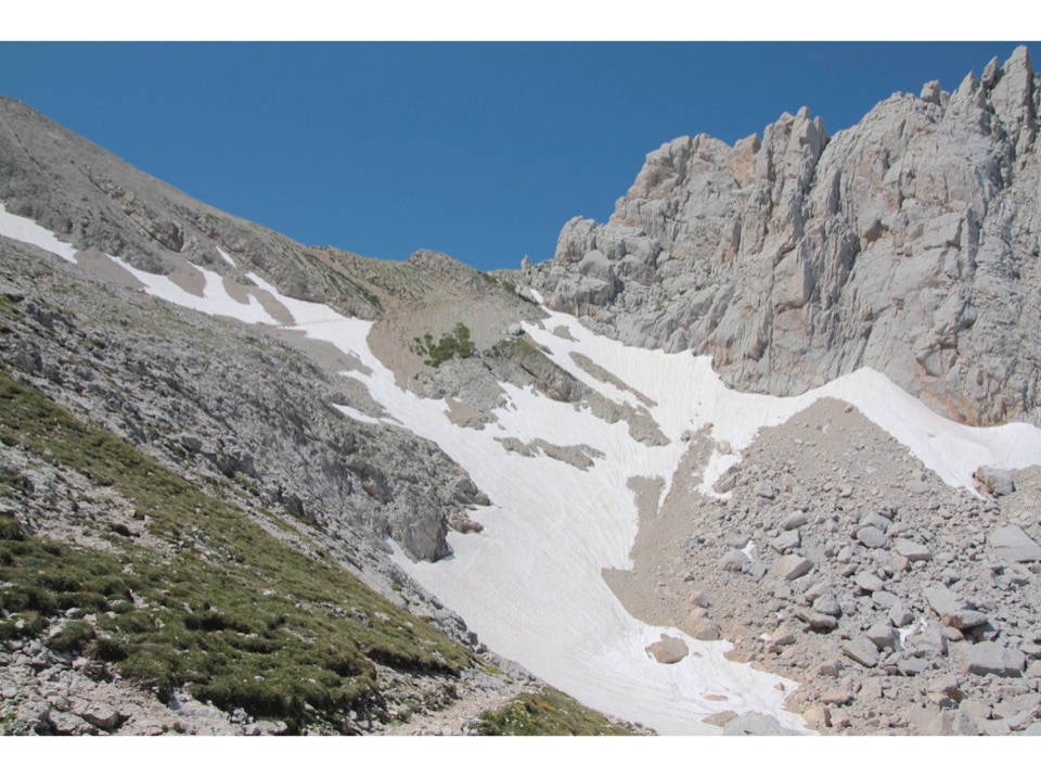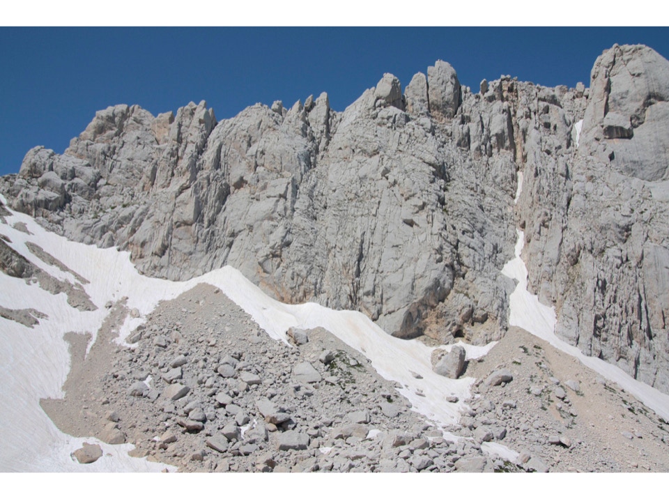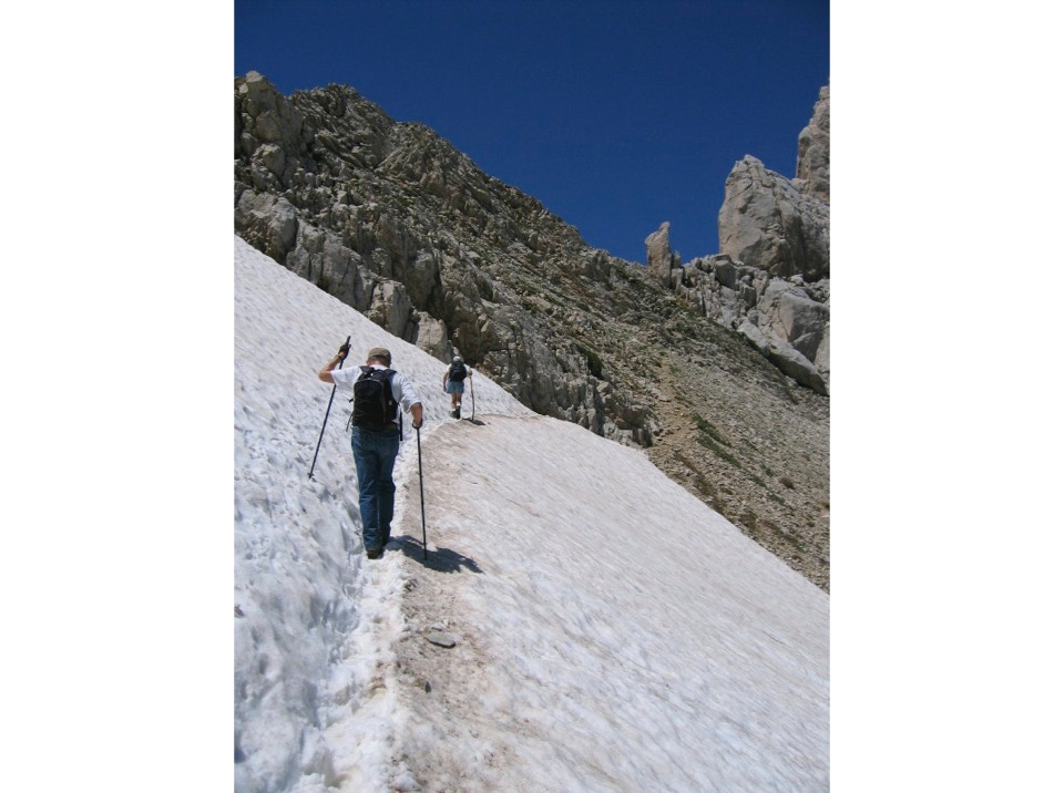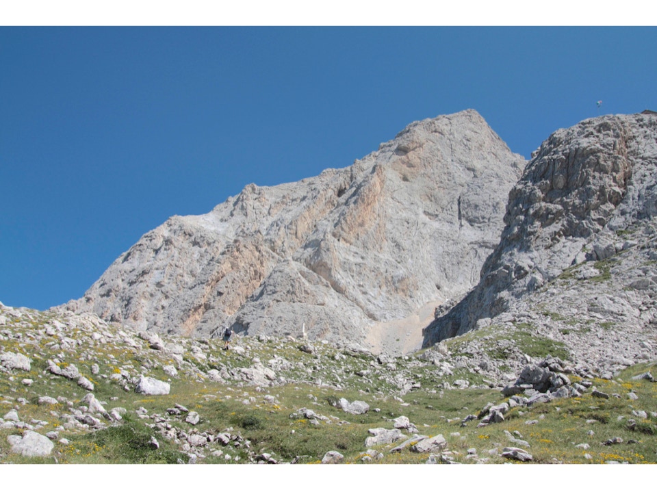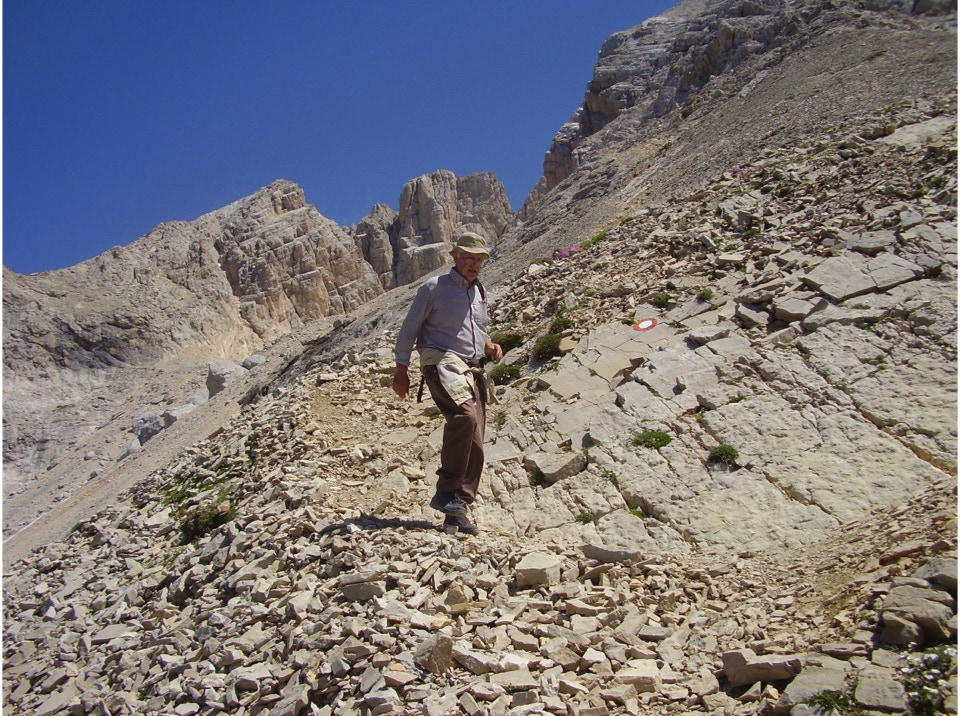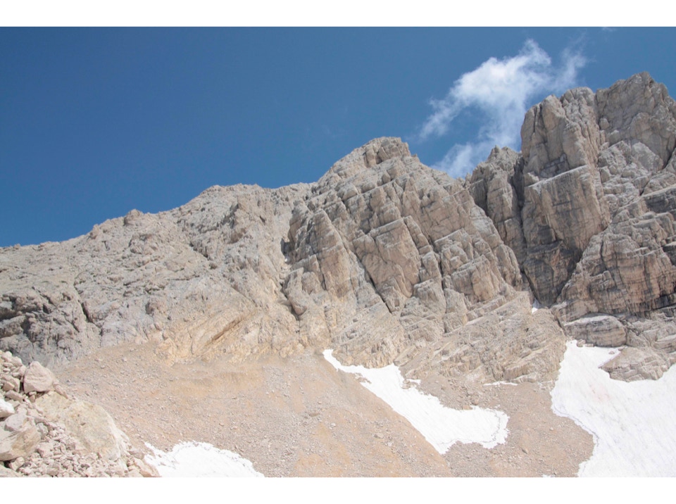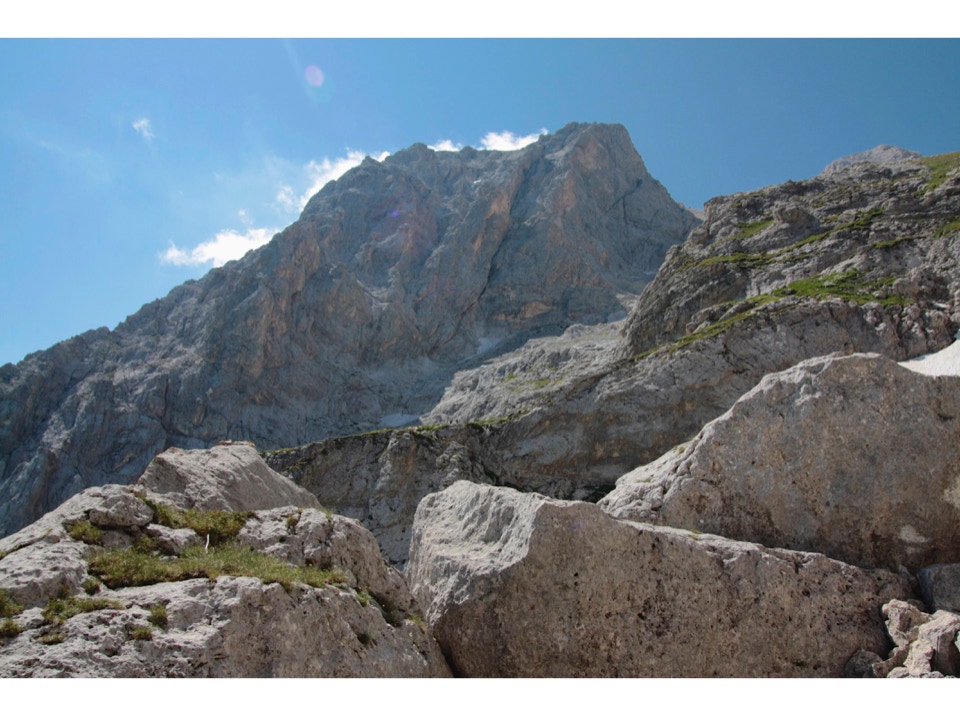 Attraversato il Passo delle Scalette (2100 mt) il sentiero si snoda tra grossi massi (caratteristico l'arco formato tra due di questi) fino a raggiungere, verso sinistra lo sperone roccioso che divide in due la valle. Un breve tratto più impegnativo (esposto, corda fissa) permette di superarlo. Si continua con tornanti e tra massi fino ad obliquare a sinistra al rifugio Franchetti (2433 mt). Dopo una doverosa sosta al rifugio si riprende, a destra, il sentiero che rapidamente permette di raggiungere la Sella dei Due Corni (2547 mt). Bella vista sulla Val Maone, i pilastri di Pizzo Intermesoli e le vicinissime Fiamme di Pietra. Si continua su ghiaie in direzione del passo del Cannone (2679 mt) fino al bivio che, a sinistra in saliscendi, permette di raggiungere l'ampia conca alla base del ghiacciaio del Calderone. L'anfiteatro, dominato dalle vette del Corno Grande, è splendido!