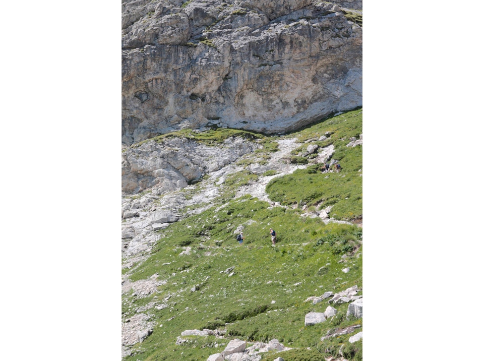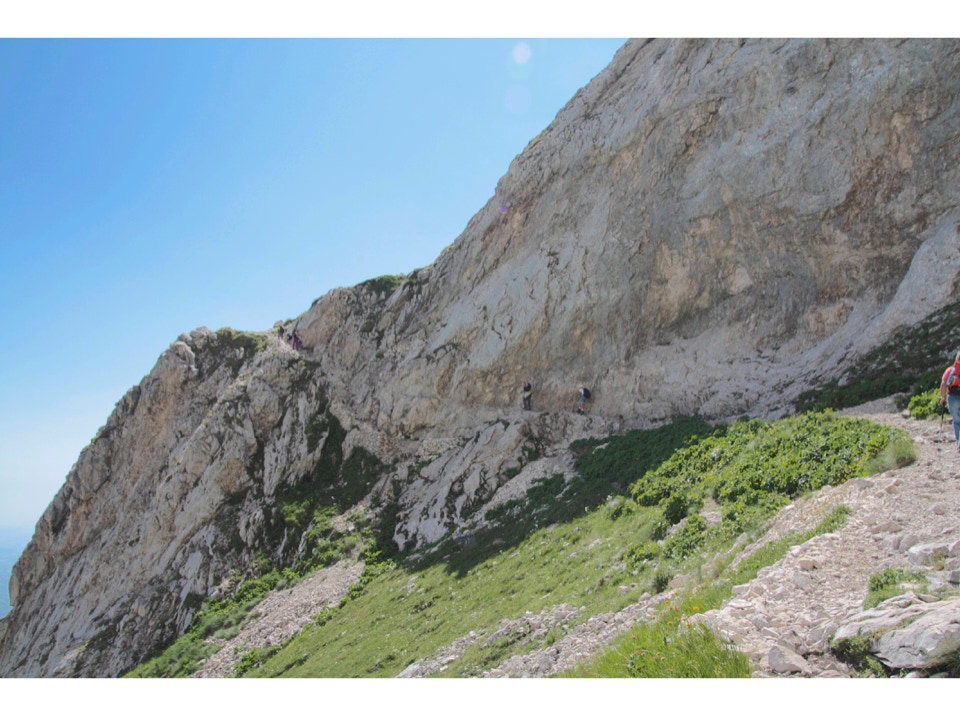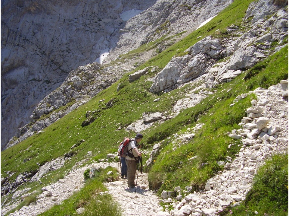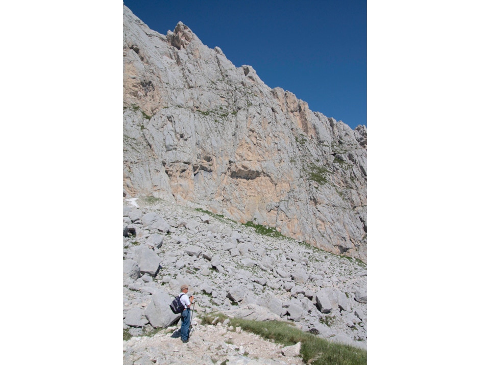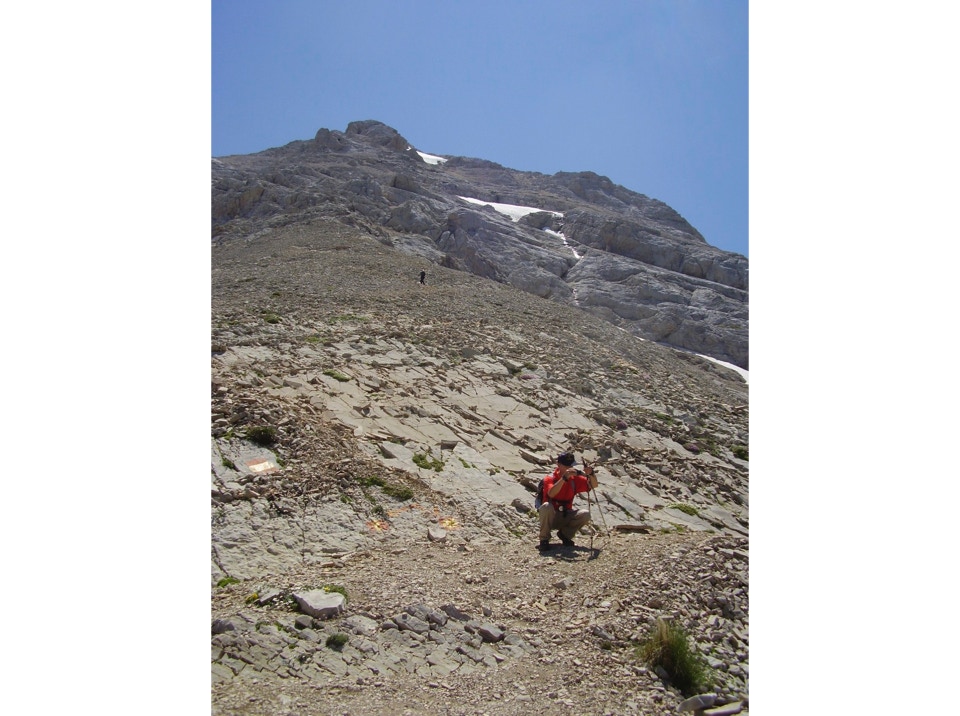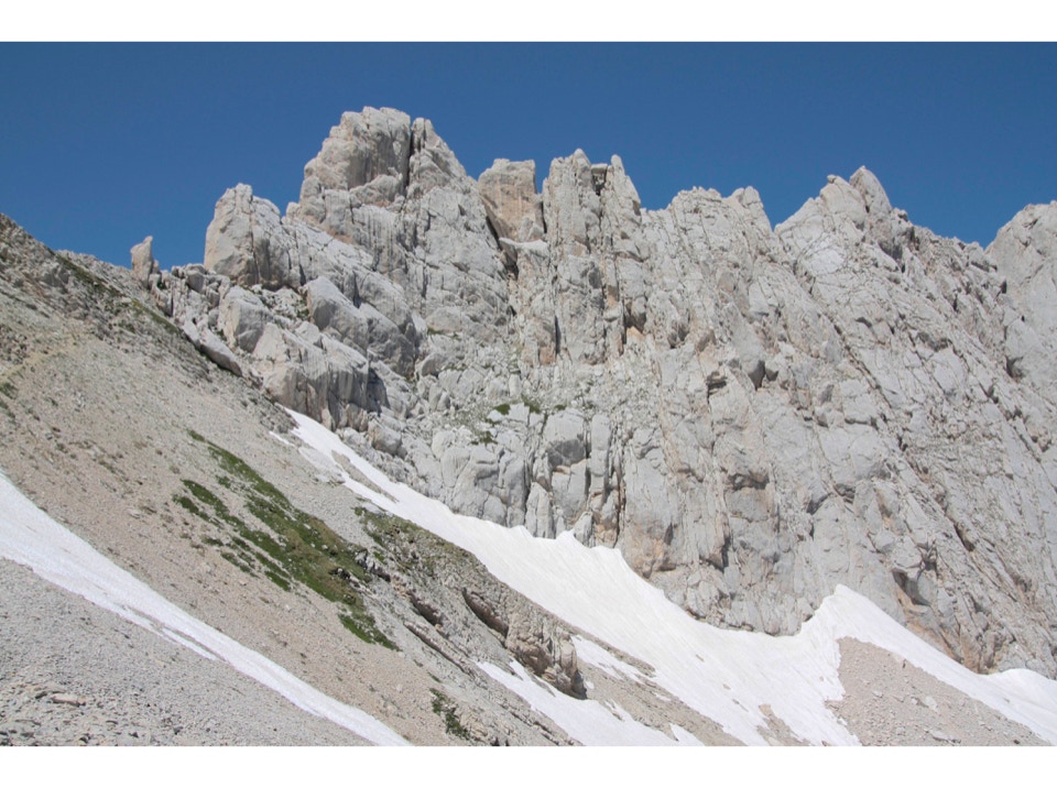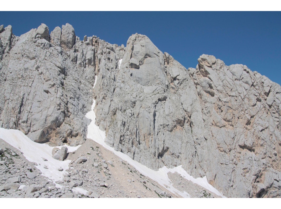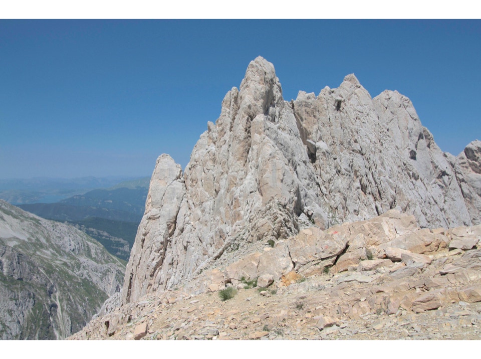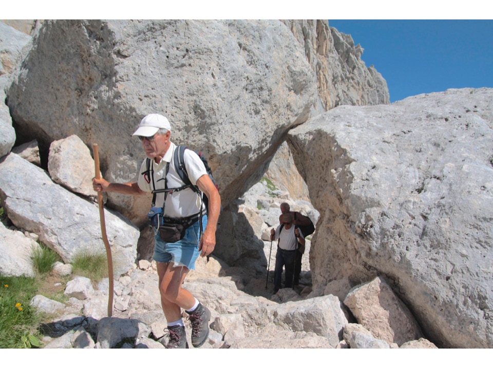 Attraversato il Passo delle Scalette (2100 mt) il sentiero si snoda tra grossi massi (caratteristico l'arco formato tra due di questi) fino a raggiungere, verso sinistra lo sperone roccioso che divide in due la valle. Un breve tratto più impegnativo (esposto, corda fissa) permette di superarlo. Si continua con tornanti e tra massi fino ad obliquare a sinistra al rifugio Franchetti (2433 mt). Dopo una doverosa sosta al rifugio si riprende, a destra, il sentiero che rapidamente permette di raggiungere la Sella dei Due Corni (2547 mt). Bella vista sulla Val Maone, i pilastri di Pizzo Intermesoli e le vicinissime Fiamme di Pietra. Si continua su ghiaie in direzione del passo del Cannone (2679 mt) fino al bivio che, a sinistra in saliscendi, permette di raggiungere l'ampia conca alla base del ghiacciaio del Calderone. L'anfiteatro, dominato dalle vette del Corno Grande, è splendido!