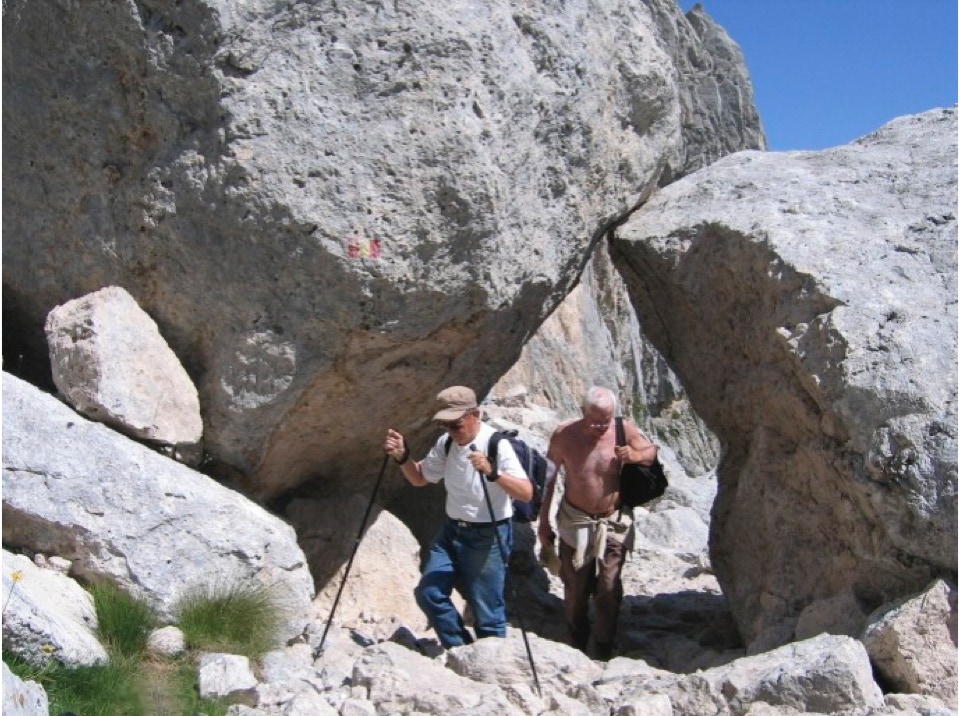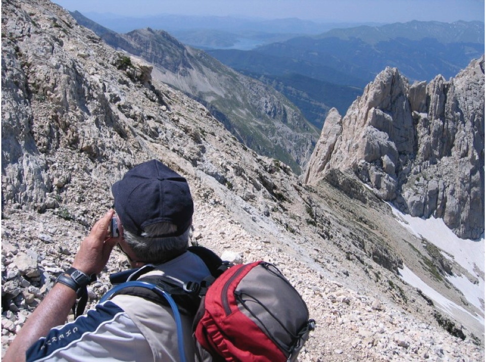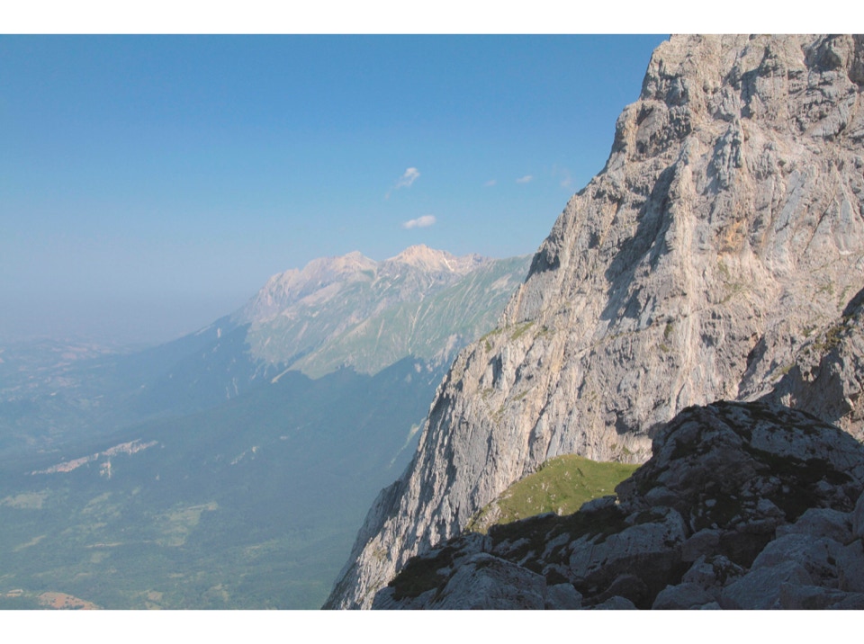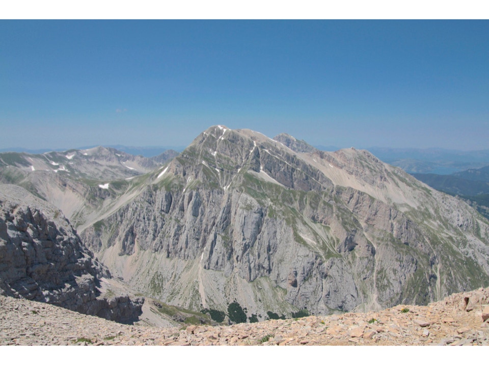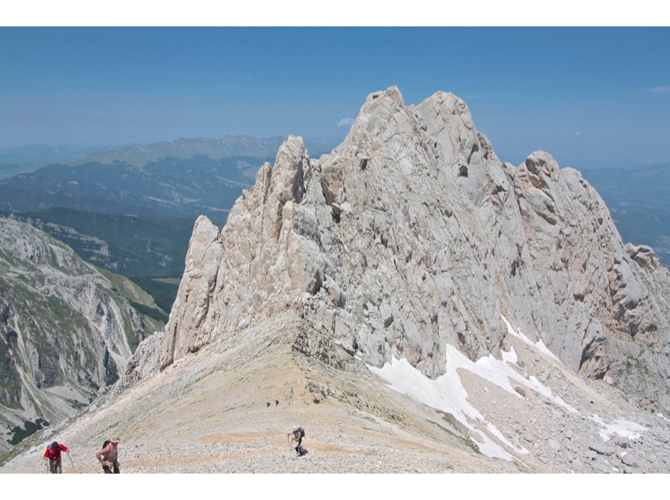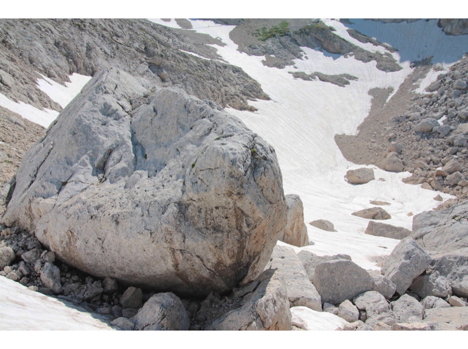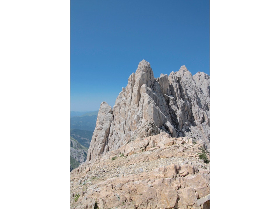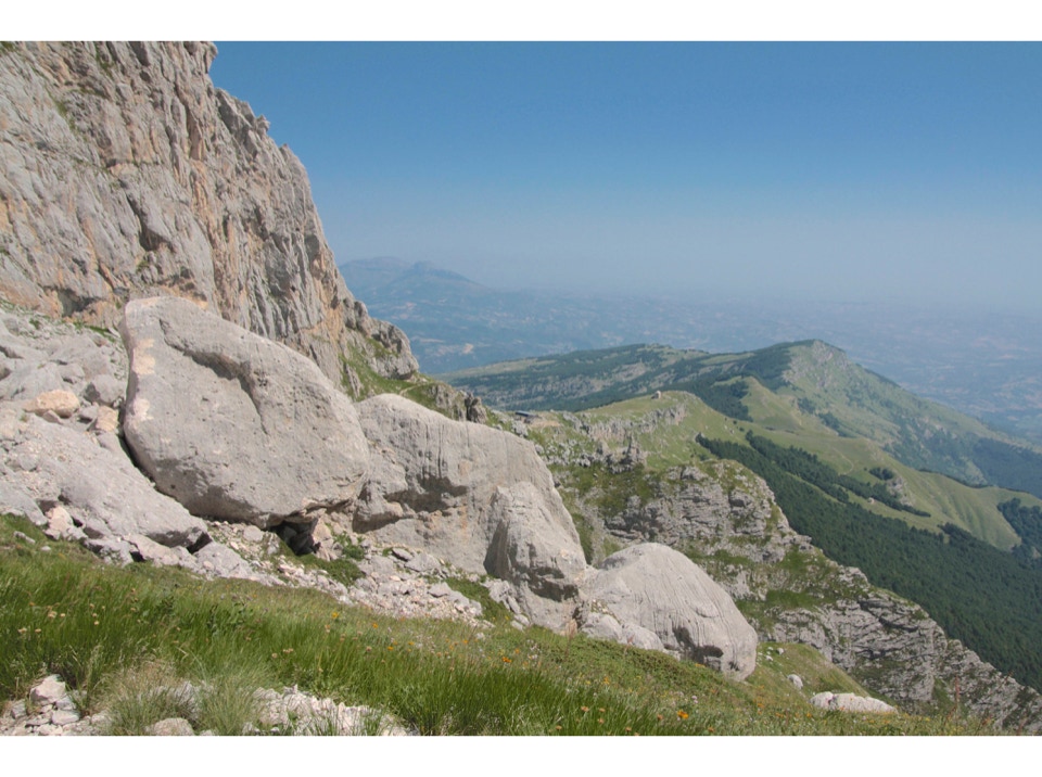Attraversato il Passo delle Scalette (2100 mt) il sentiero si snoda tra grossi massi (caratteristico l'arco formato tra due di questi) fino a raggiungere, verso sinistra lo sperone roccioso che divide in due la valle. Un breve tratto più impegnativo (esposto, corda fissa) permette di superarlo. Si continua con tornanti e tra massi fino ad obliquare a sinistra al rifugio Franchetti (2433 mt). Dopo una doverosa sosta al rifugio si riprende, a destra, il sentiero che rapidamente permette di raggiungere la Sella dei Due Corni (2547 mt). Bella vista sulla Val Maone, i pilastri di Pizzo Intermesoli e le vicinissime Fiamme di Pietra. Si continua su ghiaie in direzione del passo del Cannone (2679 mt) fino al bivio che, a sinistra in saliscendi, permette di raggiungere l'ampia conca alla base del ghiacciaio del Calderone. L'anfiteatro, dominato dalle vette del Corno Grande, è splendido!