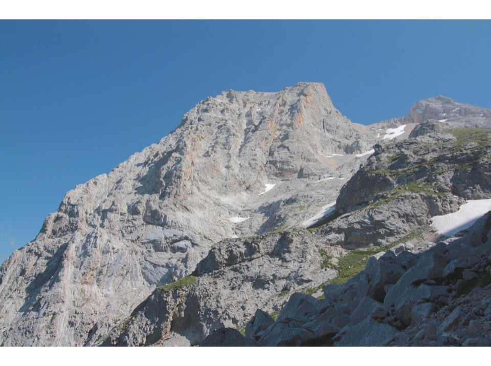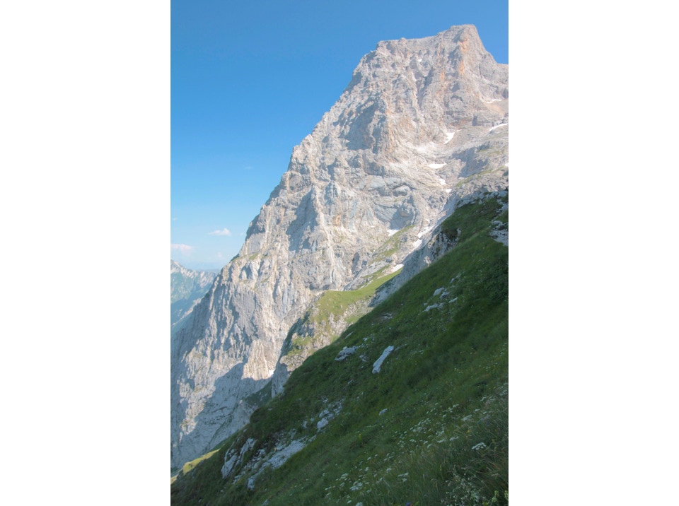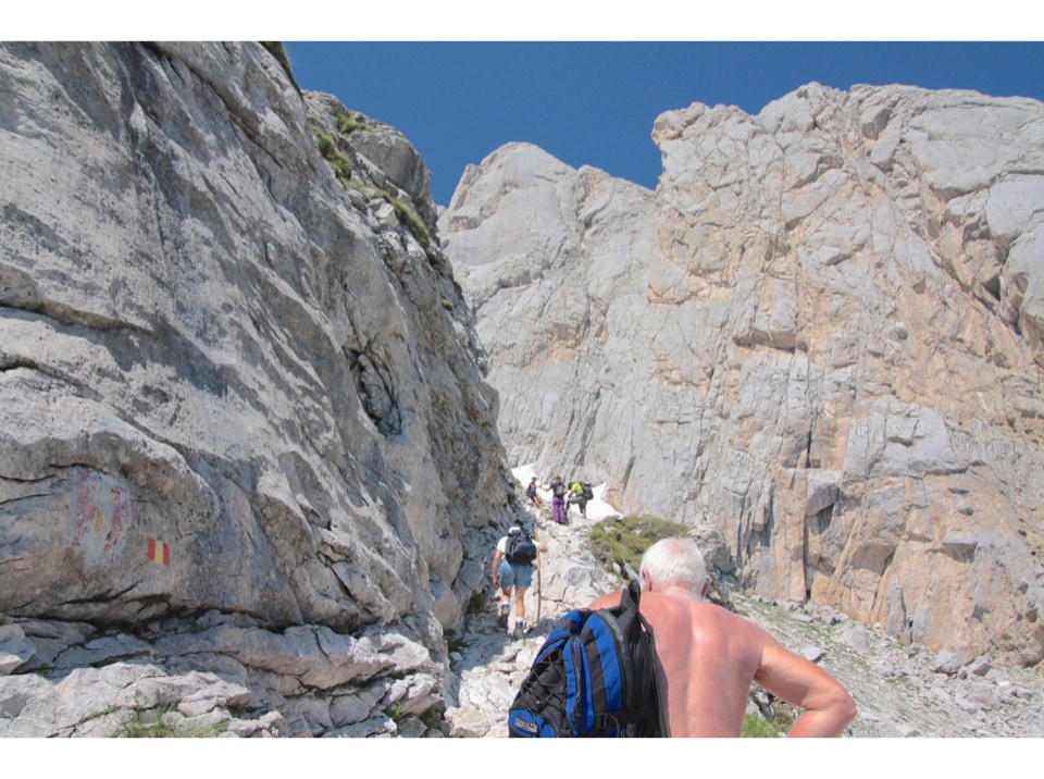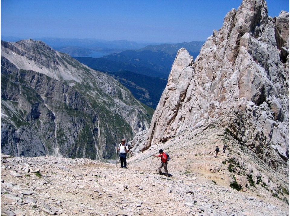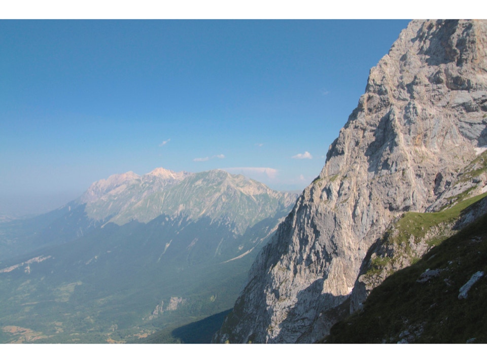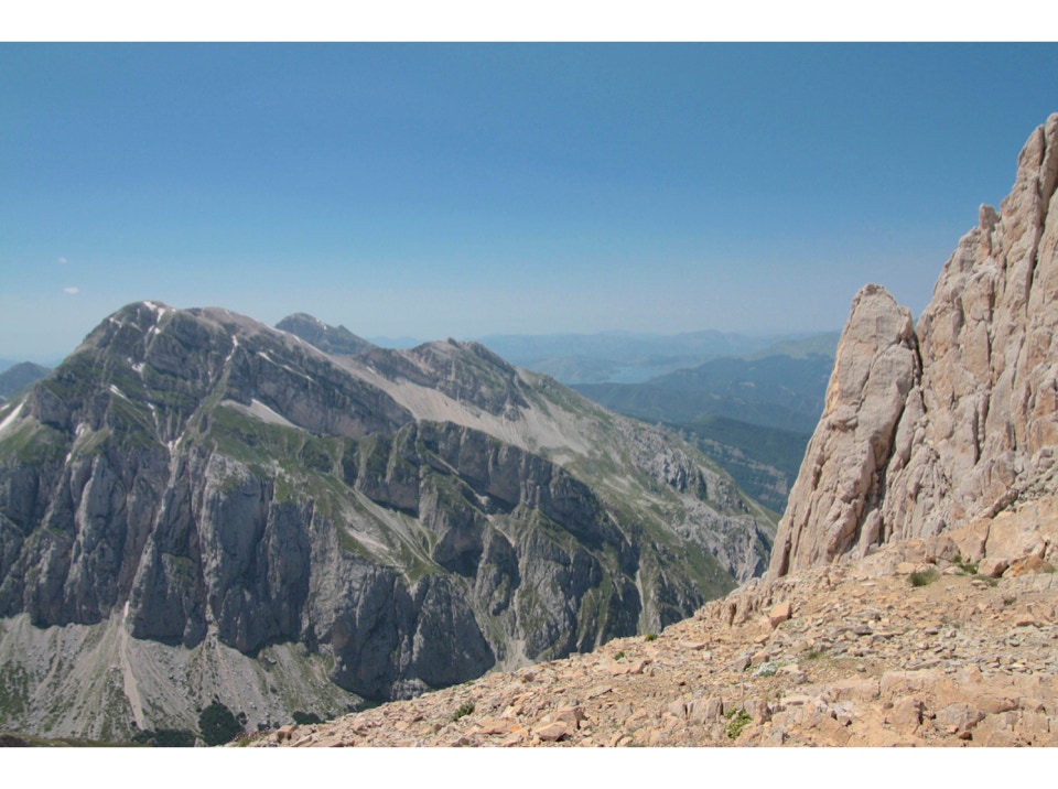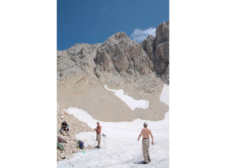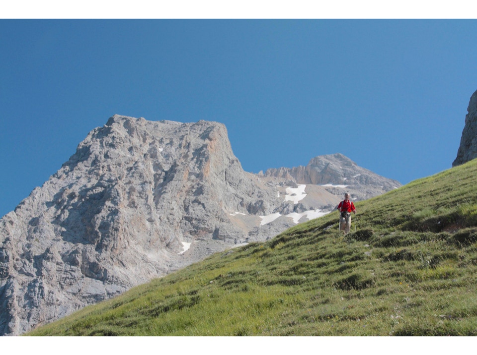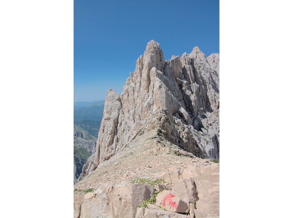 Attraversato il Passo delle Scalette (2100 mt) il sentiero si snoda tra grossi massi (caratteristico l'arco formato tra due di questi) fino a raggiungere, verso sinistra lo sperone roccioso che divide in due la valle. Un breve tratto più impegnativo (esposto, corda fissa) permette di superarlo. Si continua con tornanti e tra massi fino ad obliquare a sinistra al rifugio Franchetti (2433 mt). Dopo una doverosa sosta al rifugio si riprende, a destra, il sentiero che rapidamente permette di raggiungere la Sella dei Due Corni (2547 mt). Bella vista sulla Val Maone, i pilastri di Pizzo Intermesoli e le vicinissime Fiamme di Pietra. Si continua su ghiaie in direzione del passo del Cannone (2679 mt) fino al bivio che, a sinistra in saliscendi, permette di raggiungere l'ampia conca alla base del ghiacciaio del Calderone. L'anfiteatro, dominato dalle vette del Corno Grande, è splendido!