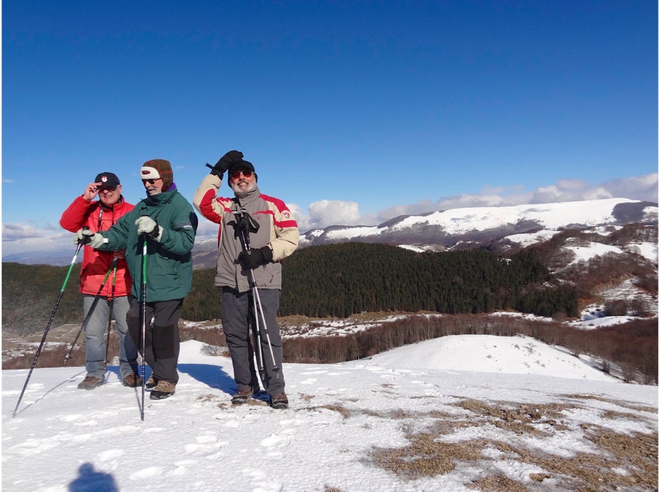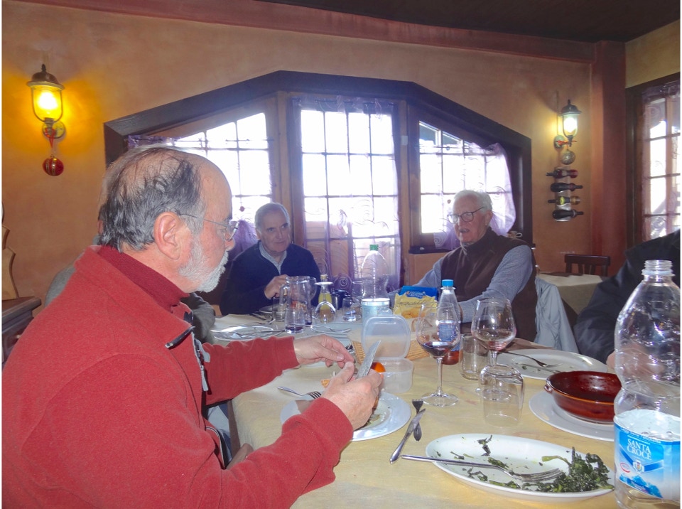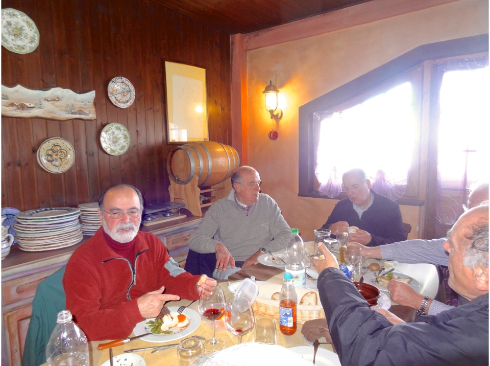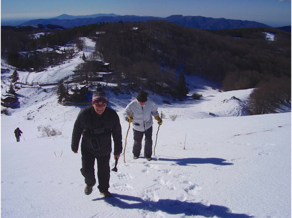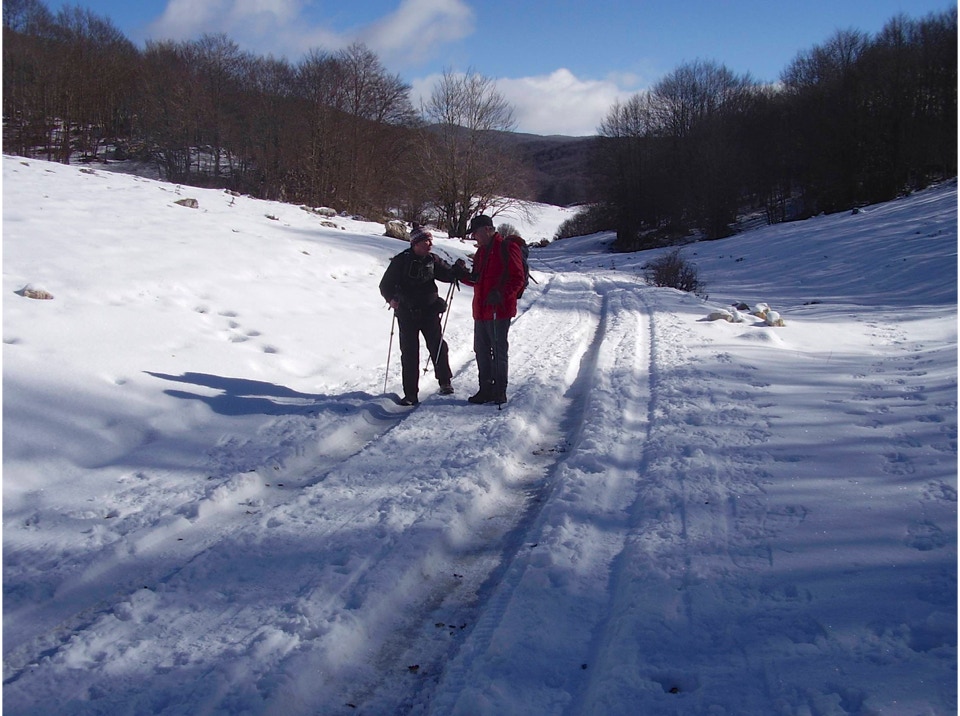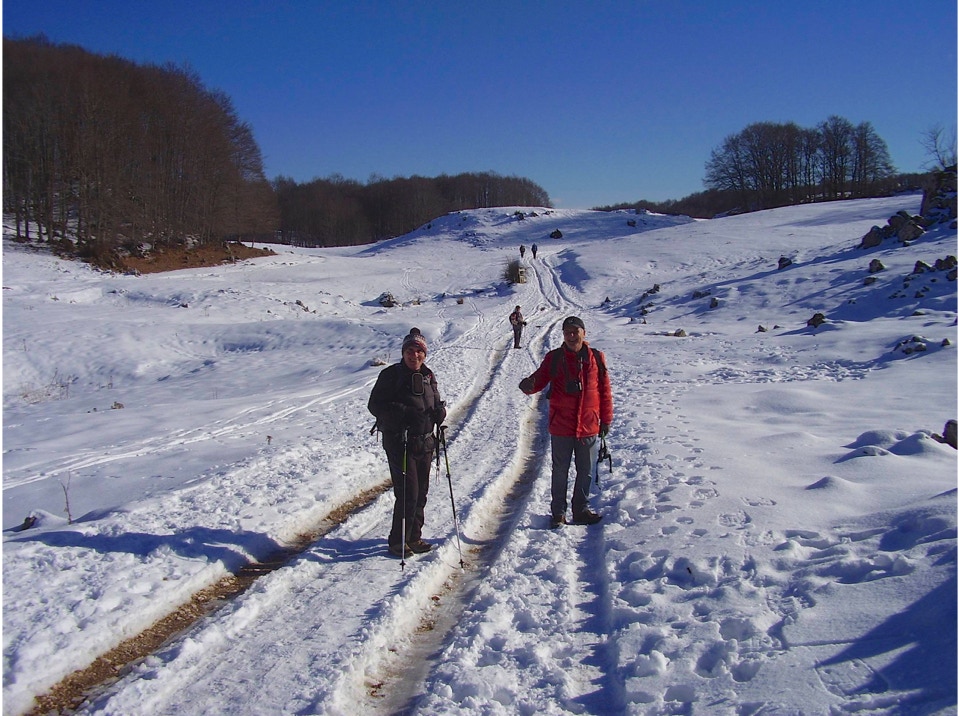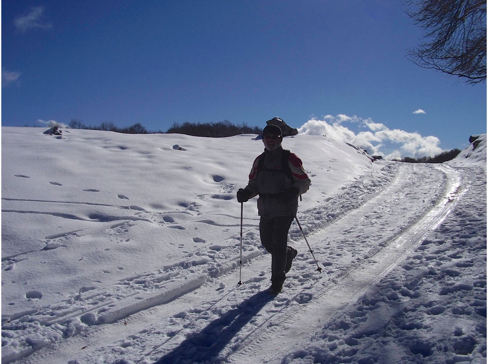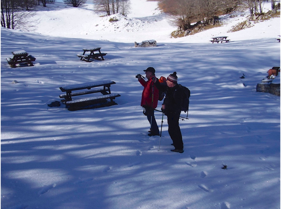 Classico percorso da ciaspole, praticamente pianeggiante, che segue la carrozzabile che congiunge Monte Livata a Campaegli. A causa, però, della scarsità del manto nevoso, si è deciso di non usare le ciaspole. Arrivati abbastanza presto a Campaegli, considerato che l’appuntamento al ristorante “Il Faggio” era per le 13,00, si è proseguito per la “vetta” casalinga (Monte Castell’Amato), dove un ventaccio di tramontana, ci ha costretti ad una frettolosa e freddolosa foto di vetta, e poi, via di corsa verso il tepore del caminetto del ristorante. Qui abbiamo consumato un ottimo pranzo, innaffiato da un buon sangiovese d’Abruzzo e dai soliti intrugli alcoolici di Achille. Il ritorno, all’inizio un po’ intirizzito e barcollante, si è svolto sullo stesso percorso all’andata.
