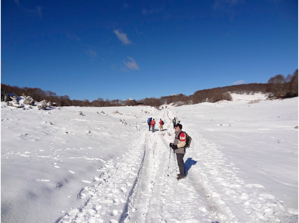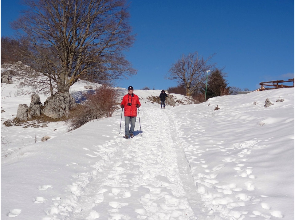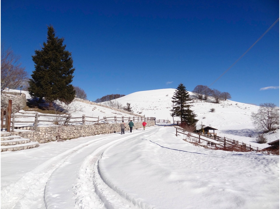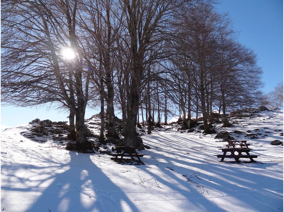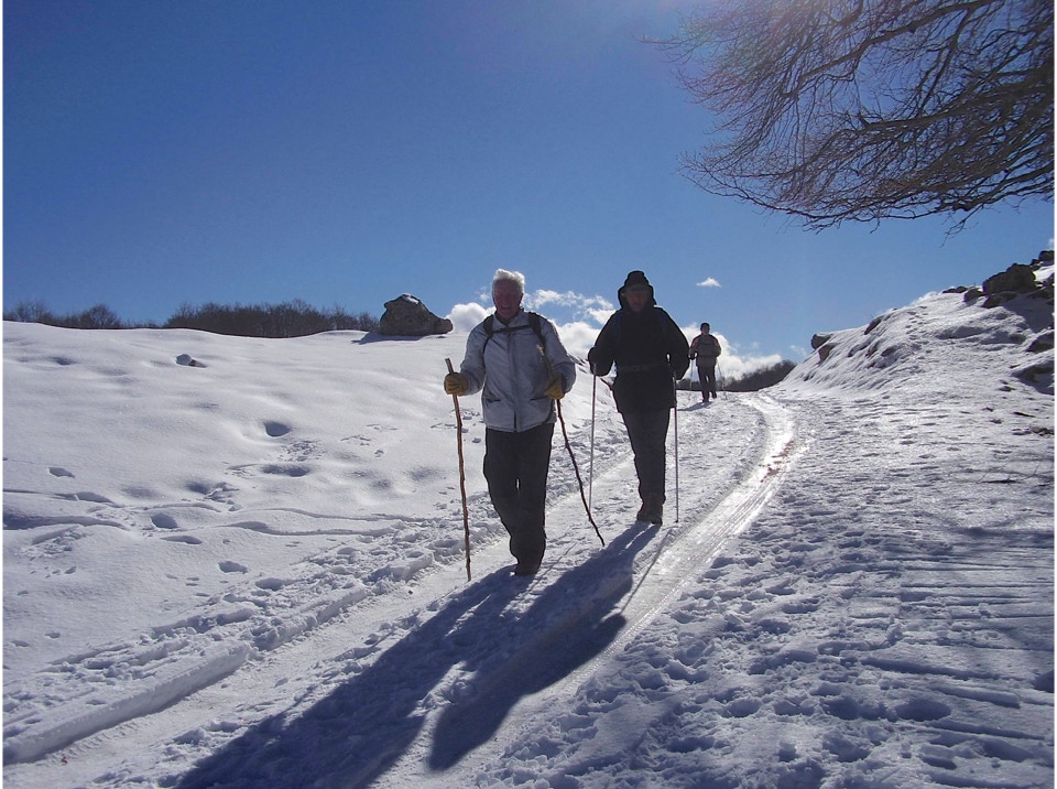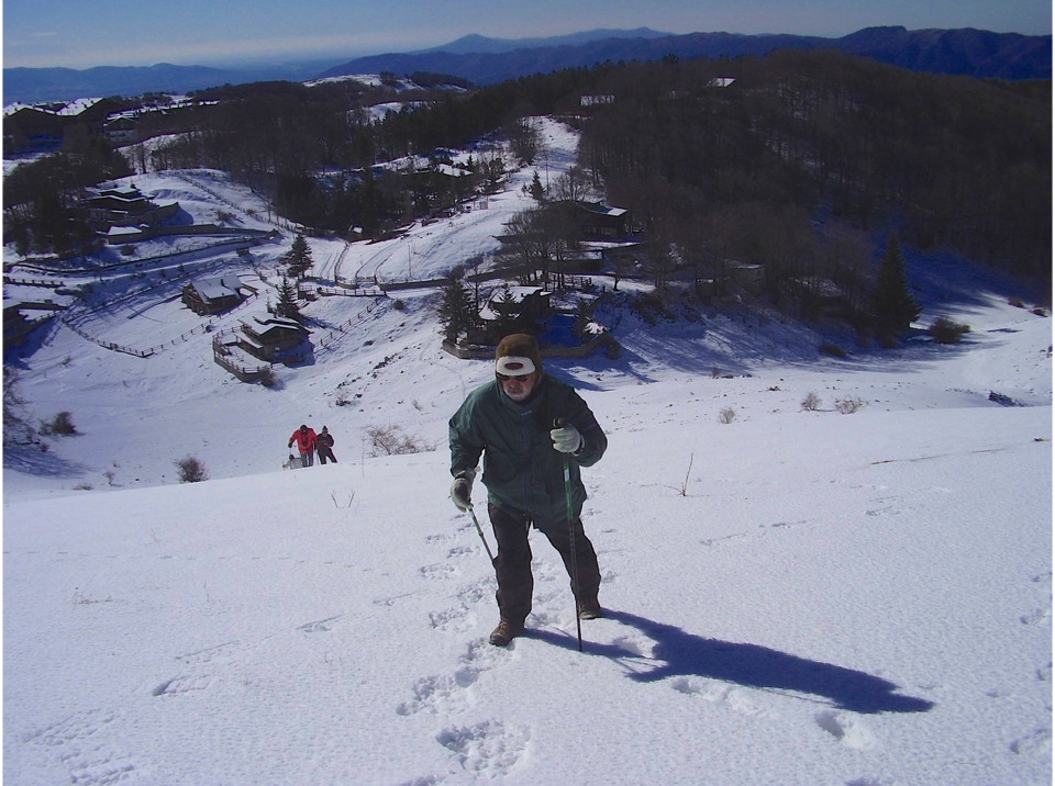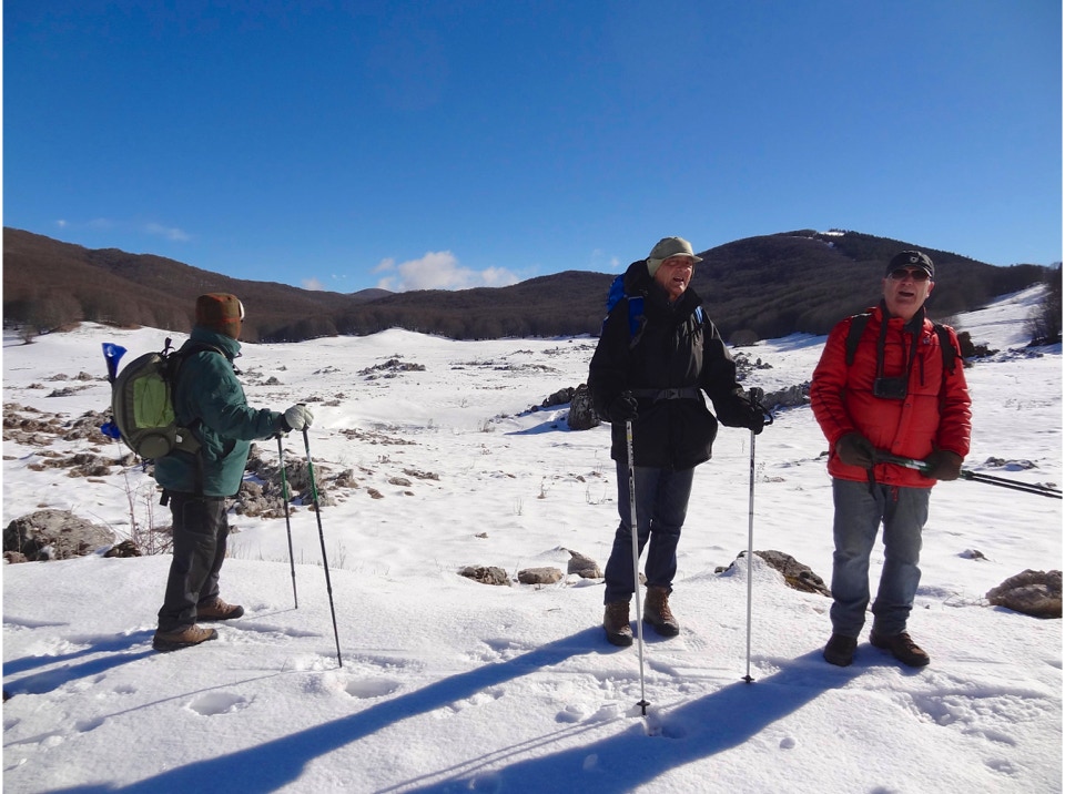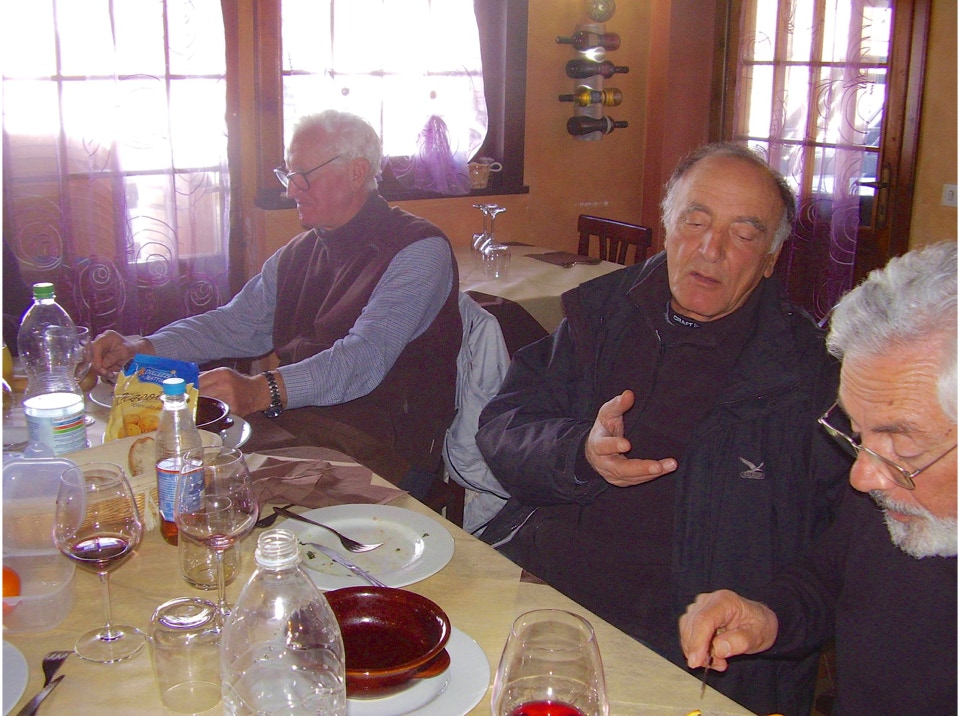 Classico percorso da ciaspole, praticamente pianeggiante, che segue la carrozzabile che congiunge Monte Livata a Campaegli. A causa, però, della scarsità del manto nevoso, si è deciso di non usare le ciaspole. Arrivati abbastanza presto a Campaegli, considerato che l’appuntamento al ristorante “Il Faggio” era per le 13,00, si è proseguito per la “vetta” casalinga (Monte Castell’Amato), dove un ventaccio di tramontana, ci ha costretti ad una frettolosa e freddolosa foto di vetta, e poi, via di corsa verso il tepore del caminetto del ristorante. Qui abbiamo consumato un ottimo pranzo, innaffiato da un buon sangiovese d’Abruzzo e dai soliti intrugli alcoolici di Achille. Il ritorno, all’inizio un po’ intirizzito e barcollante, si è svolto sullo stesso percorso all’andata.