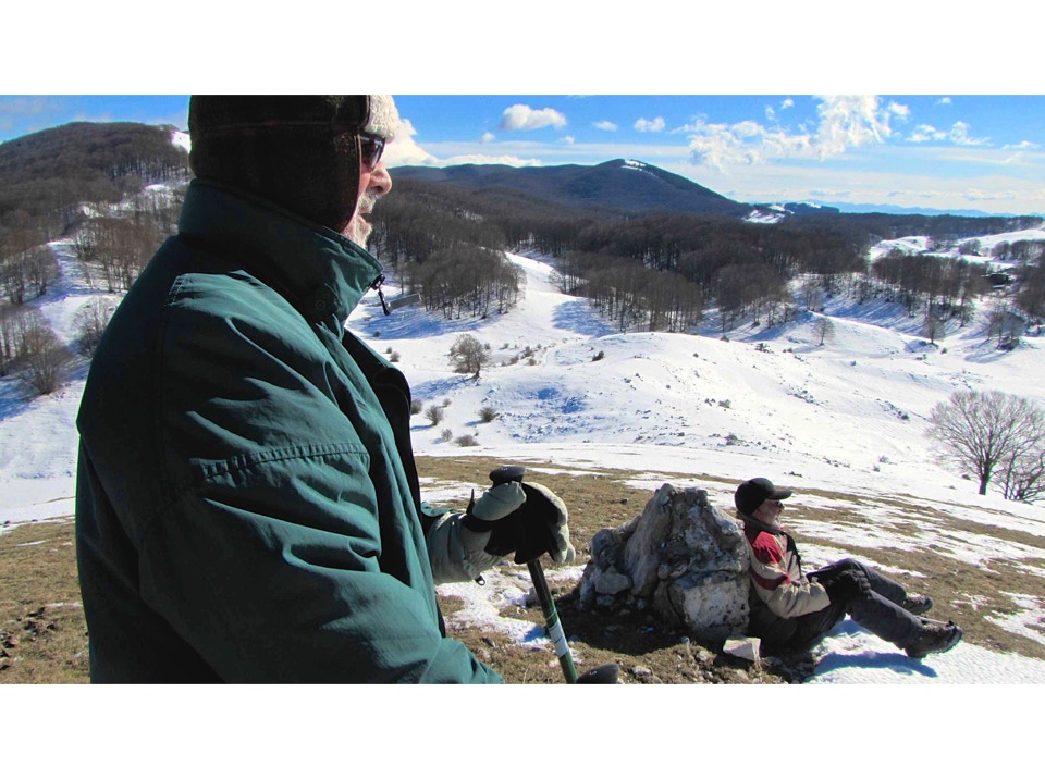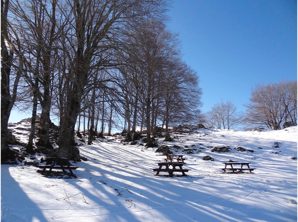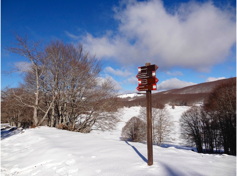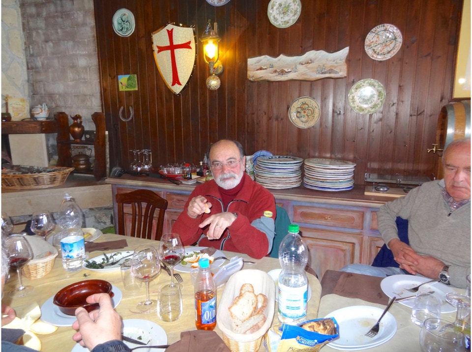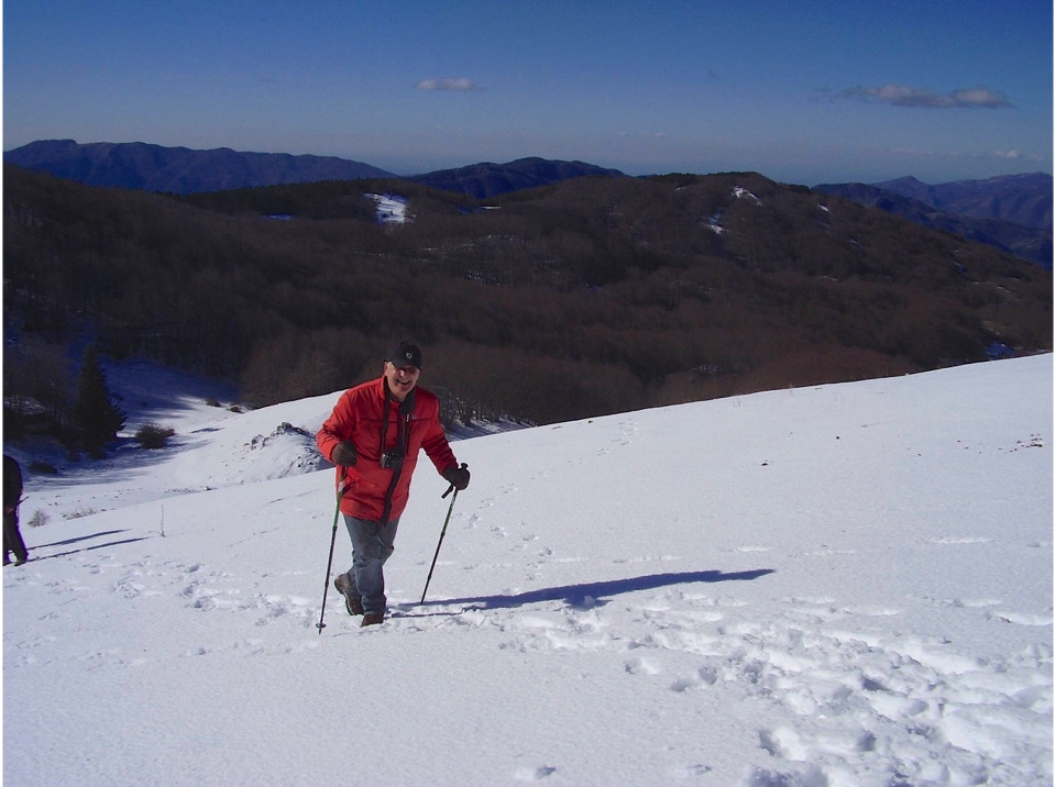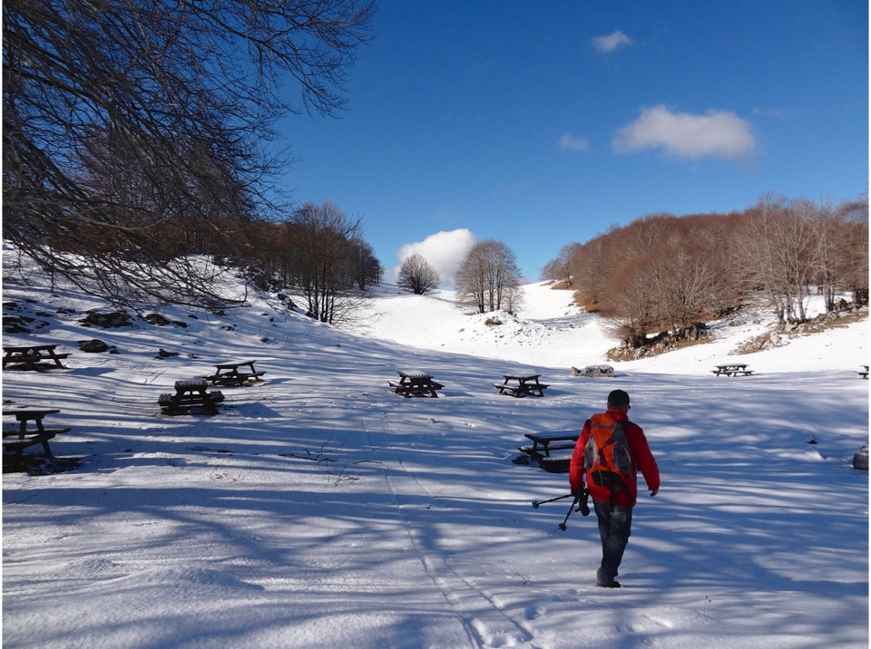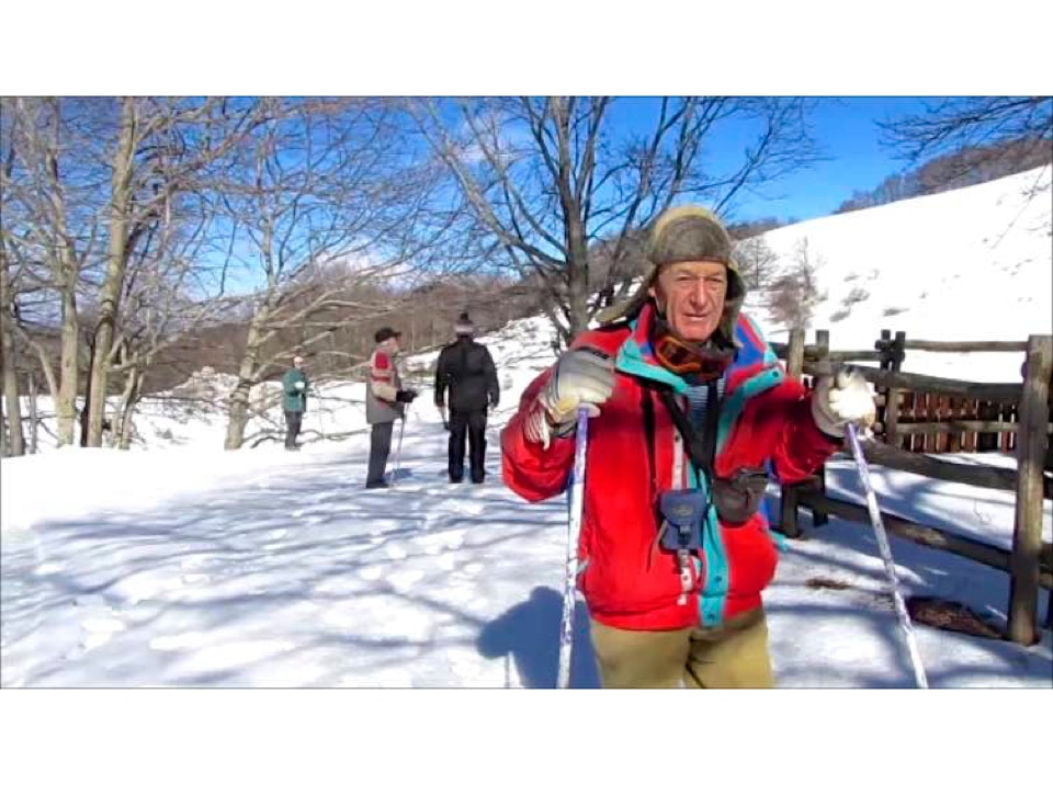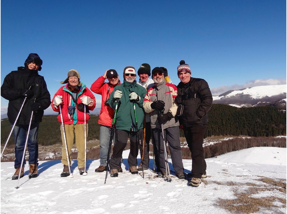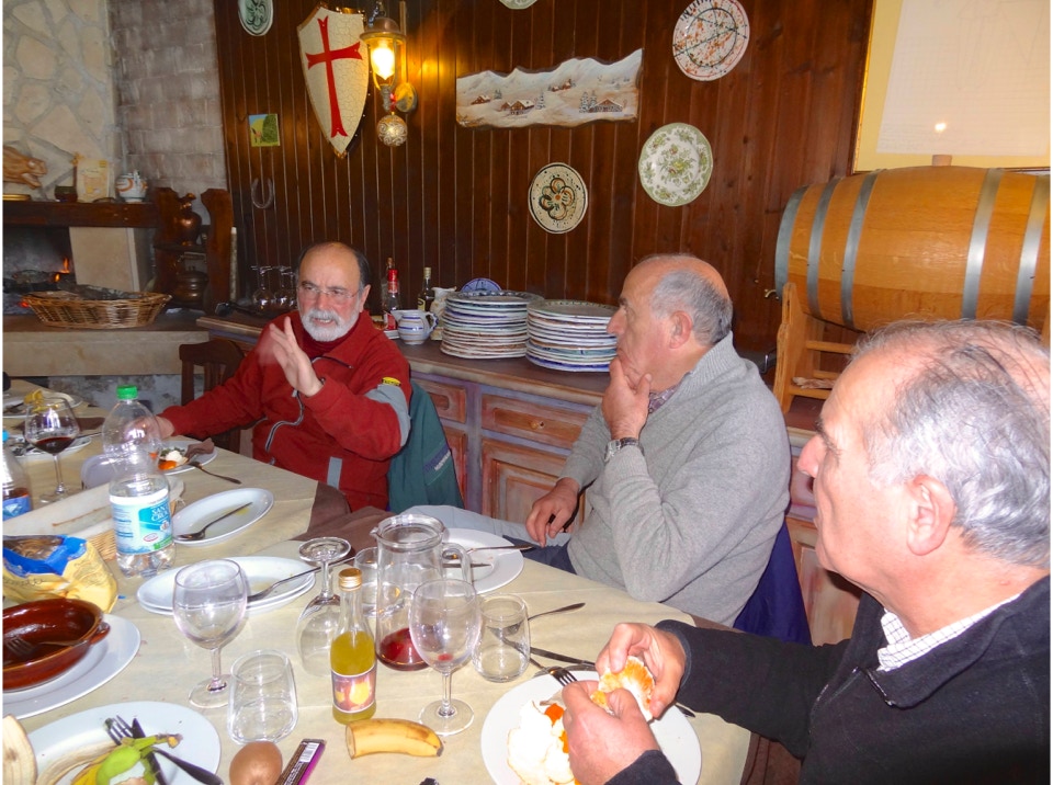Classico percorso da ciaspole, praticamente pianeggiante, che segue la carrozzabile che congiunge Monte Livata a Campaegli. A causa, però, della scarsità del manto nevoso, si è deciso di non usare le ciaspole. Arrivati abbastanza presto a Campaegli, considerato che l’appuntamento al ristorante “Il Faggio” era per le 13,00, si è proseguito per la “vetta” casalinga (Monte Castell’Amato), dove un ventaccio di tramontana, ci ha costretti ad una frettolosa e freddolosa foto di vetta, e poi, via di corsa verso il tepore del caminetto del ristorante. Qui abbiamo consumato un ottimo pranzo, innaffiato da un buon sangiovese d’Abruzzo e dai soliti intrugli alcoolici di Achille. Il ritorno, all’inizio un po’ intirizzito e barcollante, si è svolto sullo stesso percorso all’andata.