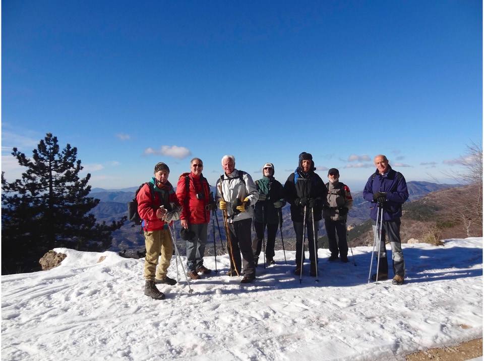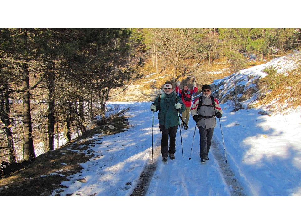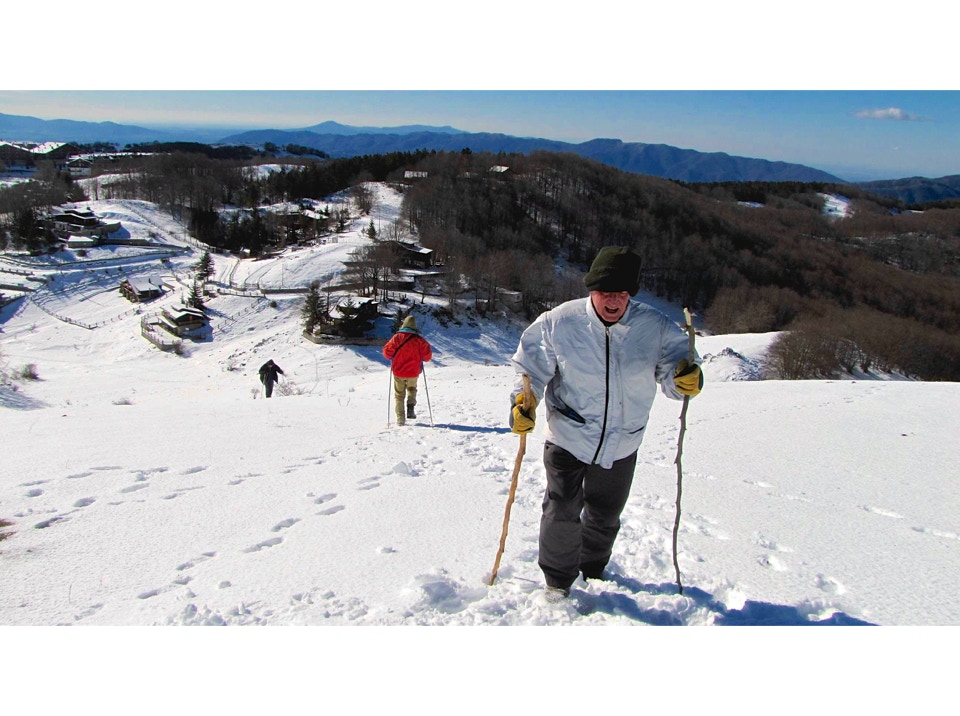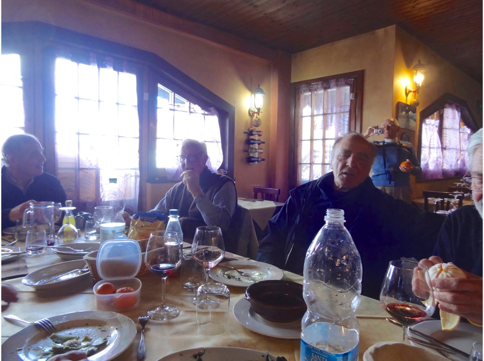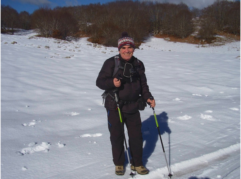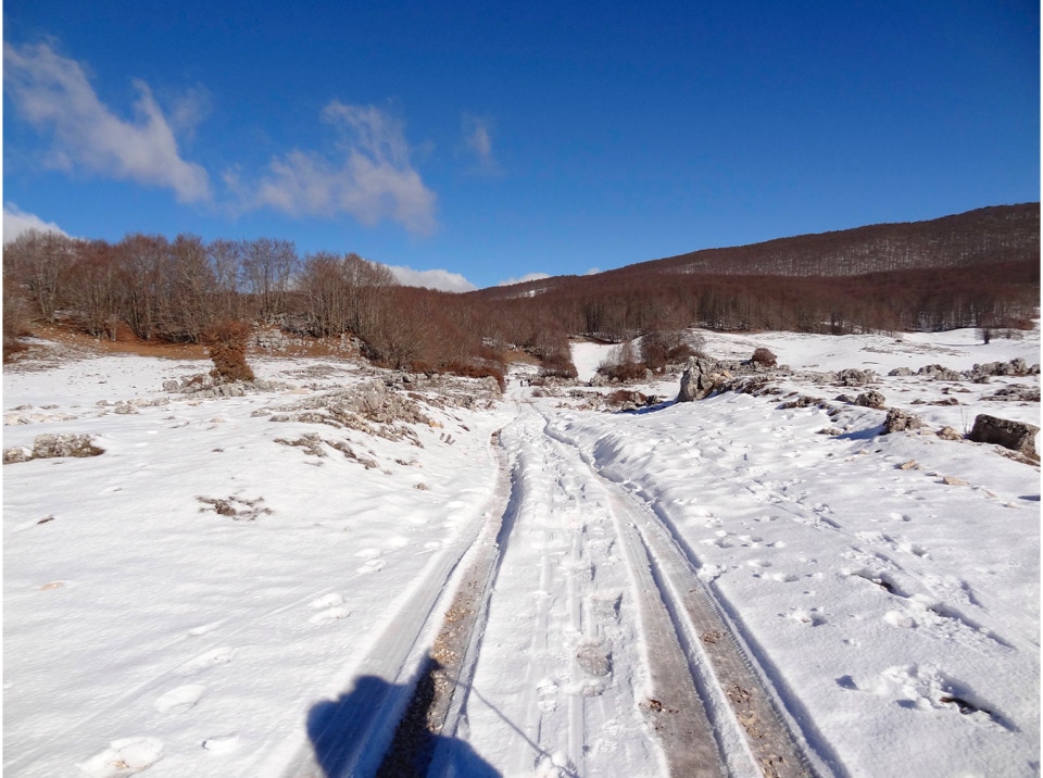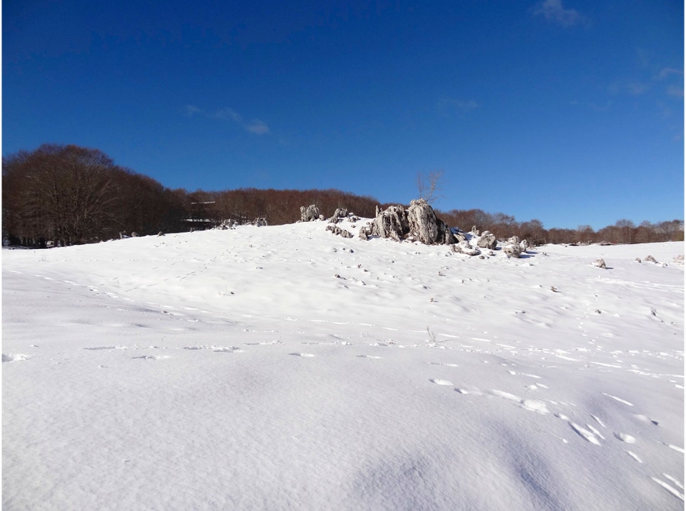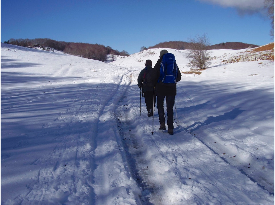 Classico percorso da ciaspole, praticamente pianeggiante, che segue la carrozzabile che congiunge Monte Livata a Campaegli. A causa, però, della scarsità del manto nevoso, si è deciso di non usare le ciaspole. Arrivati abbastanza presto a Campaegli, considerato che l’appuntamento al ristorante “Il Faggio” era per le 13,00, si è proseguito per la “vetta” casalinga (Monte Castell’Amato), dove un ventaccio di tramontana, ci ha costretti ad una frettolosa e freddolosa foto di vetta, e poi, via di corsa verso il tepore del caminetto del ristorante. Qui abbiamo consumato un ottimo pranzo, innaffiato da un buon sangiovese d’Abruzzo e dai soliti intrugli alcoolici di Achille. Il ritorno, all’inizio un po’ intirizzito e barcollante, si è svolto sullo stesso percorso all’andata.