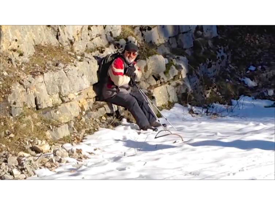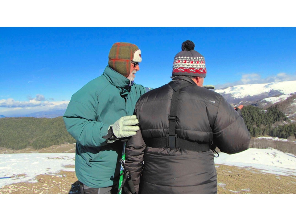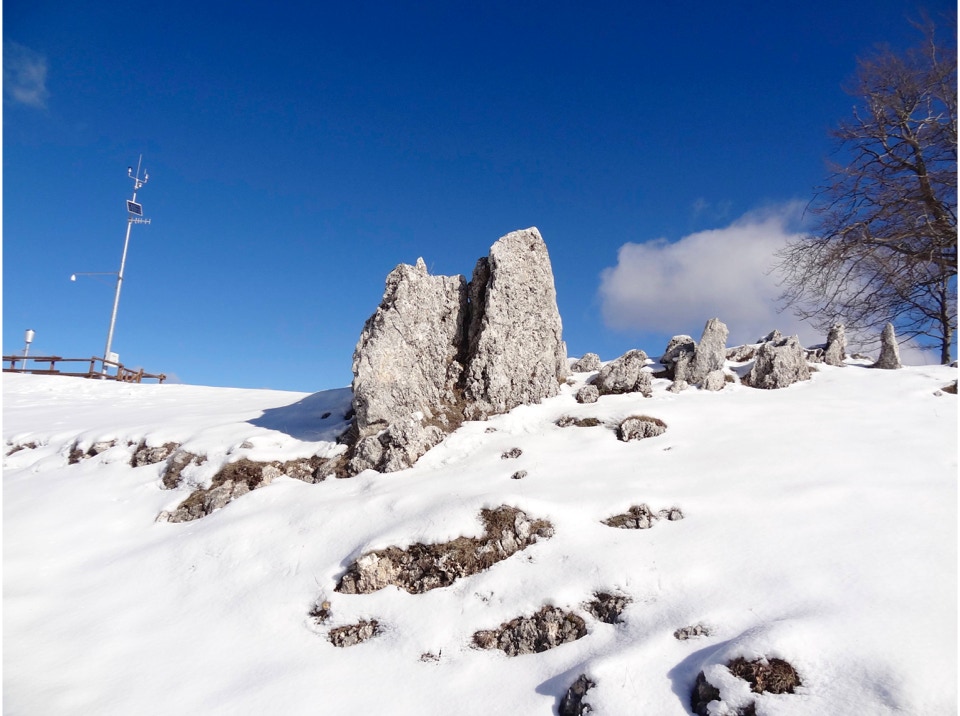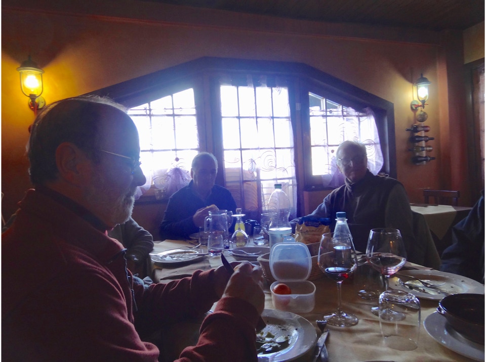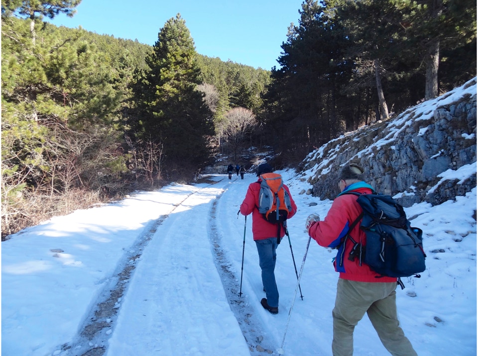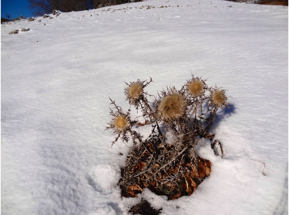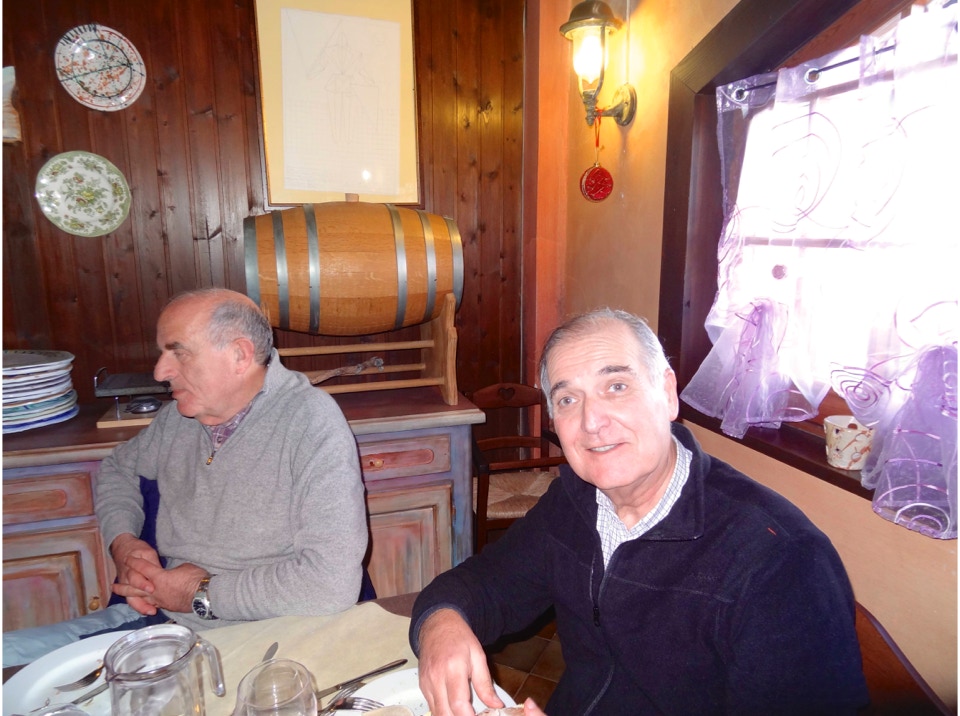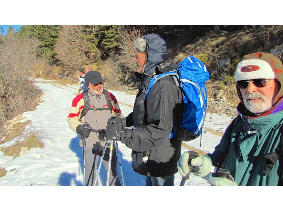 Classico percorso da ciaspole, praticamente pianeggiante, che segue la carrozzabile che congiunge Monte Livata a Campaegli. A causa, però, della scarsità del manto nevoso, si è deciso di non usare le ciaspole. Arrivati abbastanza presto a Campaegli, considerato che l’appuntamento al ristorante “Il Faggio” era per le 13,00, si è proseguito per la “vetta” casalinga (Monte Castell’Amato), dove un ventaccio di tramontana, ci ha costretti ad una frettolosa e freddolosa foto di vetta, e poi, via di corsa verso il tepore del caminetto del ristorante. Qui abbiamo consumato un ottimo pranzo, innaffiato da un buon sangiovese d’Abruzzo e dai soliti intrugli alcoolici di Achille. Il ritorno, all’inizio un po’ intirizzito e barcollante, si è svolto sullo stesso percorso all’andata.