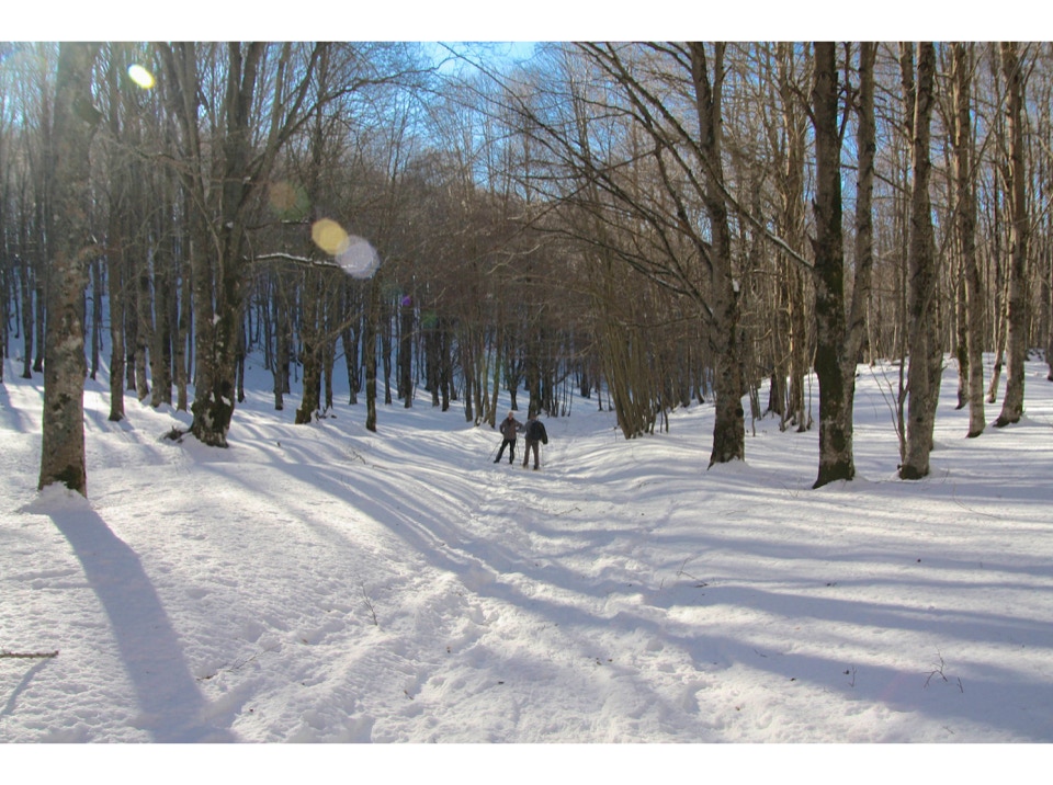 Superato tutto l'abitato di Campaegli, cento metri oltre il bar-ristorante "La Locanda" , ad una netta curva verso sinistra si parcheggia (1.405 m). Si prende Ia carrareccia che si dirige verso sud est che sale ad una sella e poi scende nettamente. Quando questa piega a destra, all'altezza di una bacheca del Parco, si lascia Ia sterrata principale e si prosegue dritti, in direzione est, attraversando un lungo altopiano fino ad arrivare al margine del bosco. Si entra nel bosco e si percorre in salita una poco evidente carrareccia. Si arriva ad una sella (1.496 m). Si scende fino ad uscire dal bosco e incrociare Ia Valle Maiura (1 .450 m circa). Si piega a destra in direzione sud-est, e si percorre tutto il fondo della Valle Maiura in salita. Si rientra nel bosco attorno a quota 1.500 m e da qui Ia carrareccia si fa nuovamente più evidente. Dopo due netti tornanti si arriva alla strada asfaltata (1.580 m circa) che collega il piazzale di Campo dell'Osso a destra, agli impianti di risalita di Monna dell'Orso a sinistra. II ritorno è per lo stesso itinerario di andata.