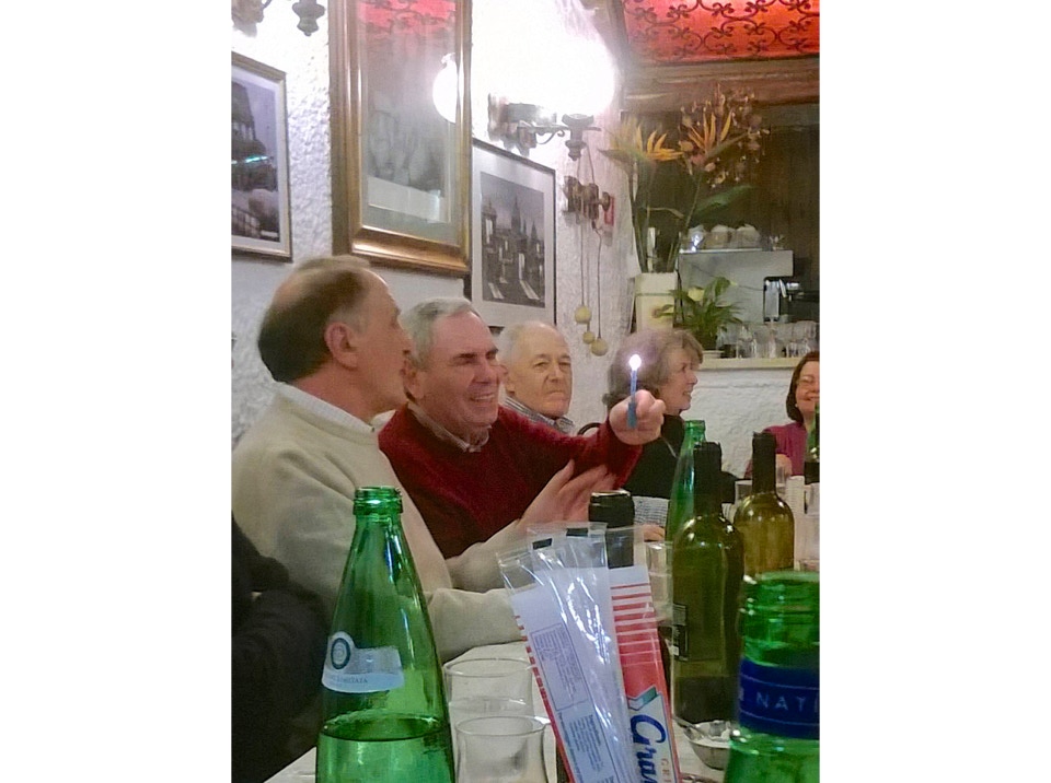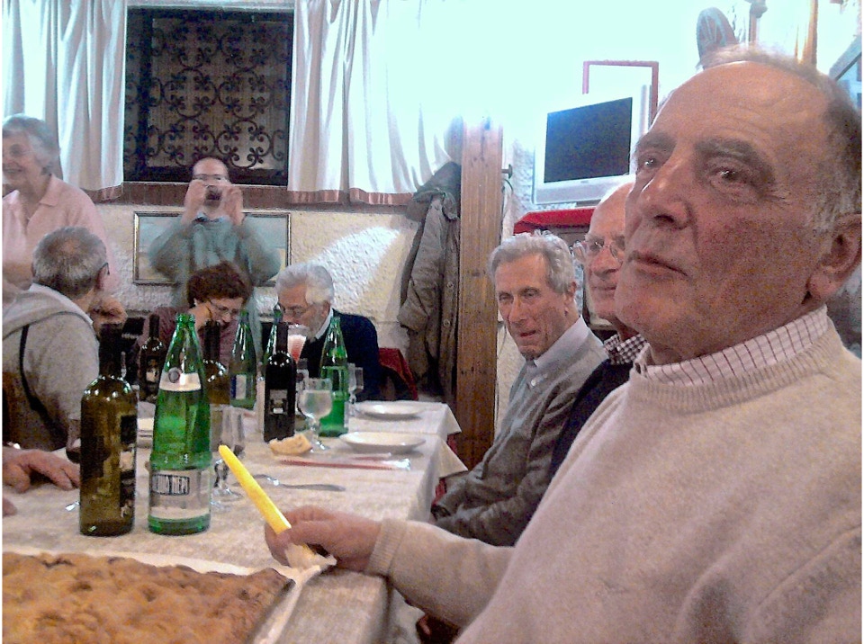 Ottimo il menu, comprendente antipasto variato (con la sorpresa veramente gradita dei famosi carciofini di Luigi), due primi, arrosto e ... trippa, annaffiati da un altrettanto ottimo Sangiovese d’Abruzzo. A seguire due squisite crostate preparate da Carla, accompagnate dallo spumante offerto gentilmente dal festeggiato Luigi, che proprio oggi ha compiuto il suo “bip, bip” genetliaco! A chiudere l’immancabile e sempre più buona “Genziana” di Achille.