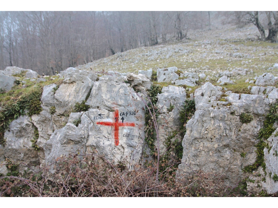 Dal paese di Carpineto Romano si raggiunge Pian delle Faggeta (m. 840), dove si lasciano le auto. Già alla partenza risultano evidenti le caratteristiche dell'ambiente in cui si sviluppa il percorso e che caratterizzano tutta la catena dei Lepini: rocce calcaree ed evidenti fenomeni di carsismo con grotte e doline. Dopo un breve tratto scoperto, il sentiero si inoltra in un bellissimo bosco di alti faggi, risalendo la valle di Acqua Mezzavalle. Il bosco, percorso nelle varie stagioni dell'anno, conserva sempre un'aria di favola incantata. Oltrepassata la sorgente di Acqua Mezzavalle a quota 1225 m., il sentiero giunge ad una sella erbosa, crocevia di sentieri che portano al vicino Semprevisa ed al paese di Bassiano. Si continua il percorso salendo a destra lungo la cresta del Monte Capreo. Raggiunta una ulteriore selletta, si sale ancora a destra per raggiungere, con percorso di cresta, la vetta del monte. Proseguendo si raggiunge una vicina elevazione, dove sorge imperiosa una croce di ferro, eretta nel 1901 in onore di Papa Leone XIII, cittadino di Carpineto. Da qui, la vista si allarga sulle vette principali dei Lepini. Si prosegue quindi in discesa lungo la stessa via dell'andata.