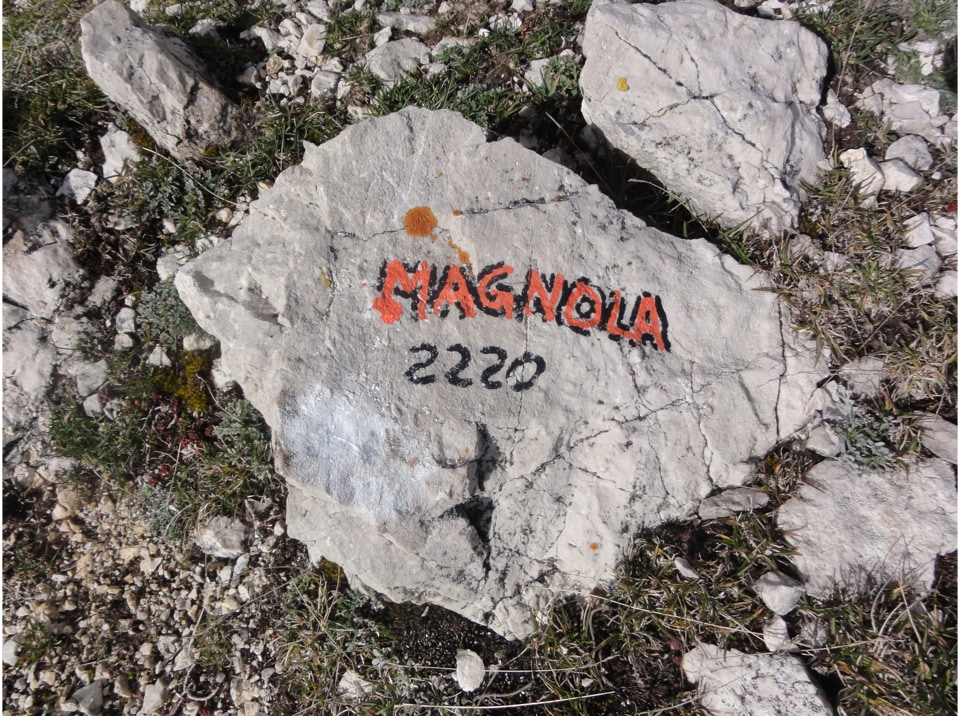 Ora si piega a Sud seguendo una carrareccia percorsa in estate dai fuoristrada utilizzati per la manutenzione degli impianti o “Pista Panoramica”, in corrispondenza dell’arrivo delle seggiovie di Montefreddo, fino a raggiungere la cresta Est della Magnola (1980 m), poco al di là c’è il Rifugio Telespazio del CAI di Avezzano. Si continua a seguire la sterrata che porta al Rif. Panei, fino a raggiungere, con una breve traversata in salita, la croce di vetta del Monte Magnola (2220 m).