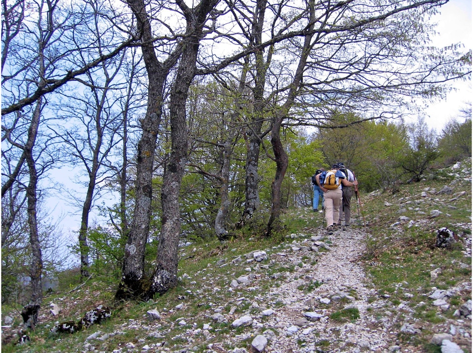 Continuando il percorso, pianeggiante fino a Colle Vistuni, si inizia a salire raggiungendo a quota 725 m il fontanile degli Schifi, da dove è possibile osservare in lontananza i Monti Simbruini, laziali e abruzzesi, e più in basso la pianura che precede i Lagustelli di Percile. Proseguendo si attraversa la loc. il Piano, l’Ara delle Schiazze sino al termine della strada sterrata ai piedi del Pellecchia. Da qui un sentiero segnalato conduce (in circa 20 minuti) al Pizzo di Pellecchia (1321 m), da cui la vista (in caso di buona visibilità, che purtroppo è mancata) può spaziare dal massiccio del Gran Sasso fino alla cupola della Basilica di San Pietro a Roma.
