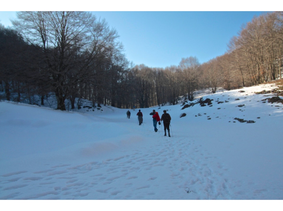 Dal paese di Gorga, il più alto dei Monti Lepini (766 m), in corrispondenza di una statua, si imbocca sulla destra una strada che porta nei pressi del Fosso delle Cannavine. Giunti alla conca del Monte Pietracquare si parcheggia l’automobile e da qui inizia il percorso CAI n. 20, uno dei più suggestivi che si possono effettuare in questo territorio. La strada sterrata prosegue attraversando il fondovalle della Valle dei Canali e arriva alla Fonte San Marino (1143 m). Proseguendo in direzione est, in prossimità della valle fra Monte Alto e Monte Pisciarello, si incontra, prima una sorgente, e quindi diversi pianori erbosi, dove sono presenti diversi fenomeni carsici (doline), fino all’incrocio con il sentiero CAI n. 17 che porta al Monte Malaina. Il sentiero prende quindi la direzione est e, attraversando un bosco di faggi, arriva ai pianori del Londro (1245 m) caratteristici per la presenza di alcuni rifugi. Una volta attraversato il pianoro si arriva ai piedi dello Sprone Maraoni, dalla cui vetta (1328 m) si può ammirare un affascinante panorama sulla Valle del fiume Sacco e sui Monti Simbruini. La presenza di nebbia nel fondovalle non ha permesso di vedere la valle, ma solo le più alte cime innevate dei Simbruini. Il ritorno è stato effettuato sul percorso dell’andata. Presenza inaspettata di una notevole copertura nevosa, condizioni meteo ottime.