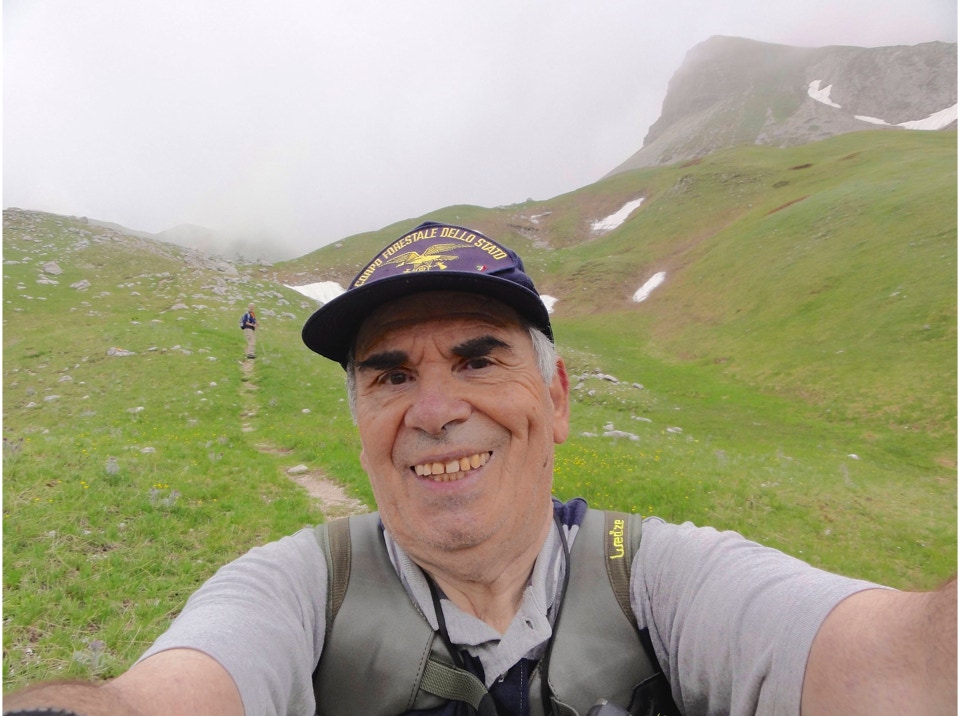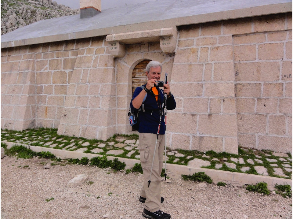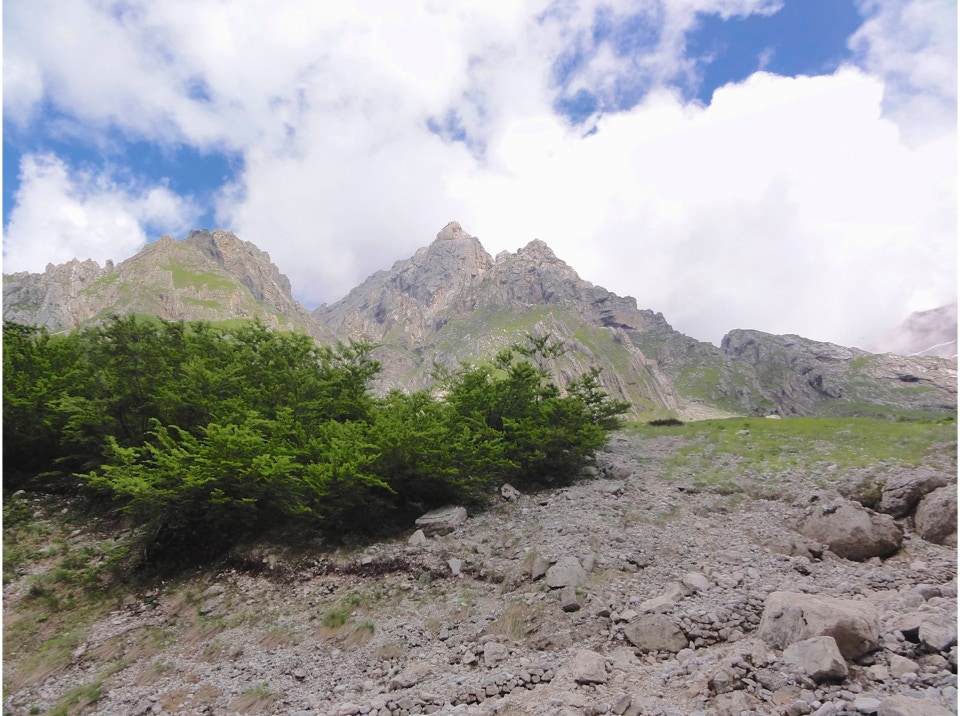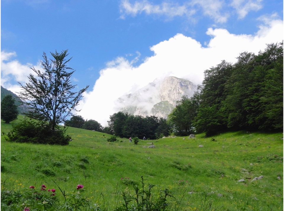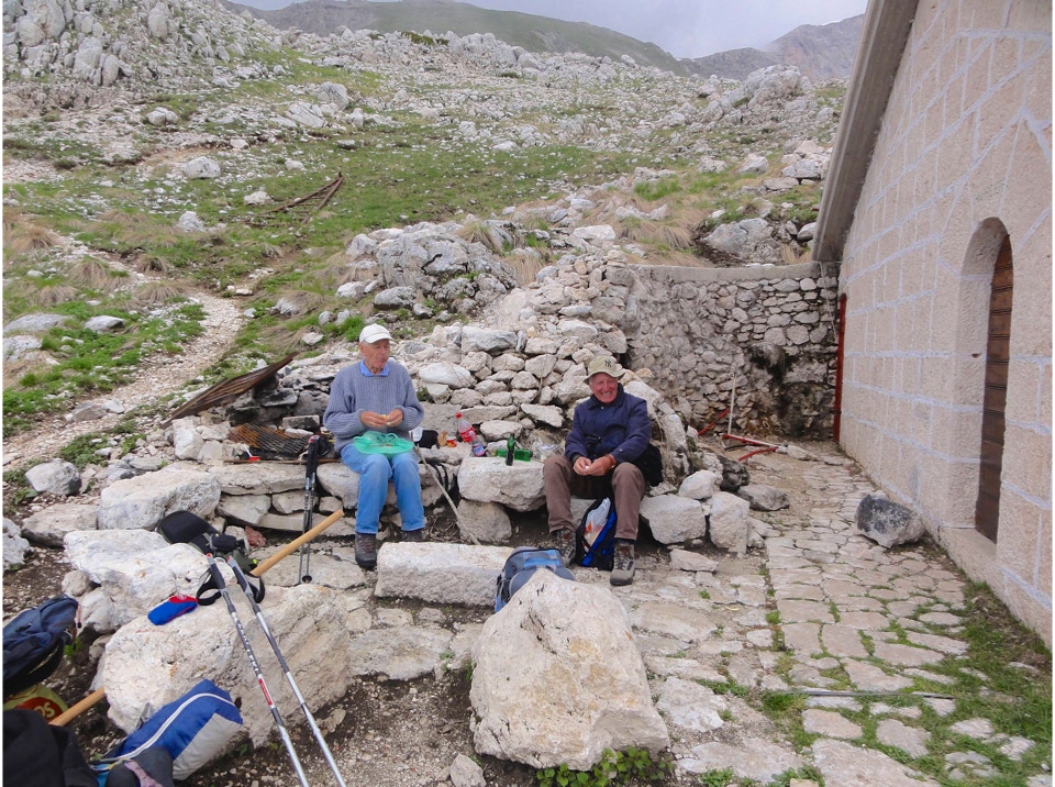 La stradaprosegue in salita e, dopo la presa dell'acquedotto, all'uscita dal bosco, si trasforma in sentiero (sentiero CAI 2). Ripercorre la bellissima piana sotto le pareti del Pizzo d’Intermesoli con la grotta dell'Oro a destra e il vallone dei Ginepri a sinistra. Continuando, la valle Maone si espande verso est nei vasti, morbidi e ondulati rilievi di Campo Pericoli (anticamente si chiamava Campo Aprico - campo aperto).Si prosegue sul fondo della concae dopo aver superato il bivio del sentiero che porta alla Sella dei Grilli,si giungeairesti di antichi ricoveri per pastori, le Capanne (m 1957). Qui si è stabilito il “campo base”. Quattro del gruppo (i primi quattro in foto) hanno proseguito verso il Rifugio Garibaldi.