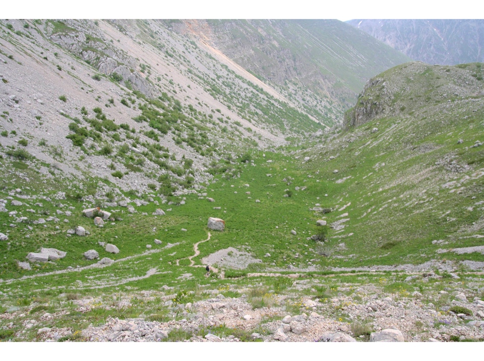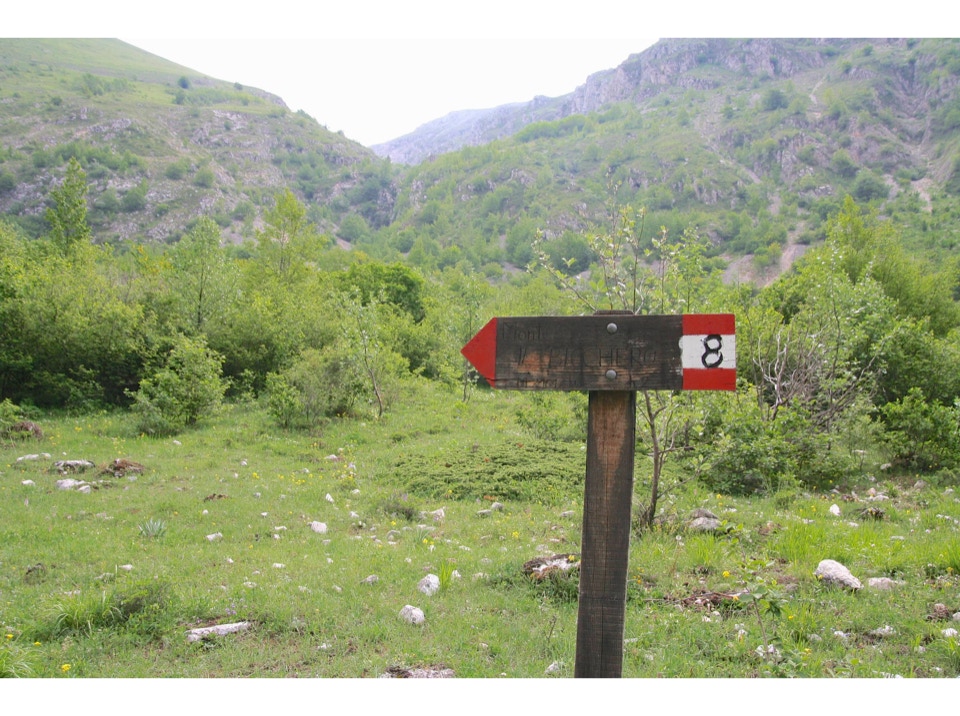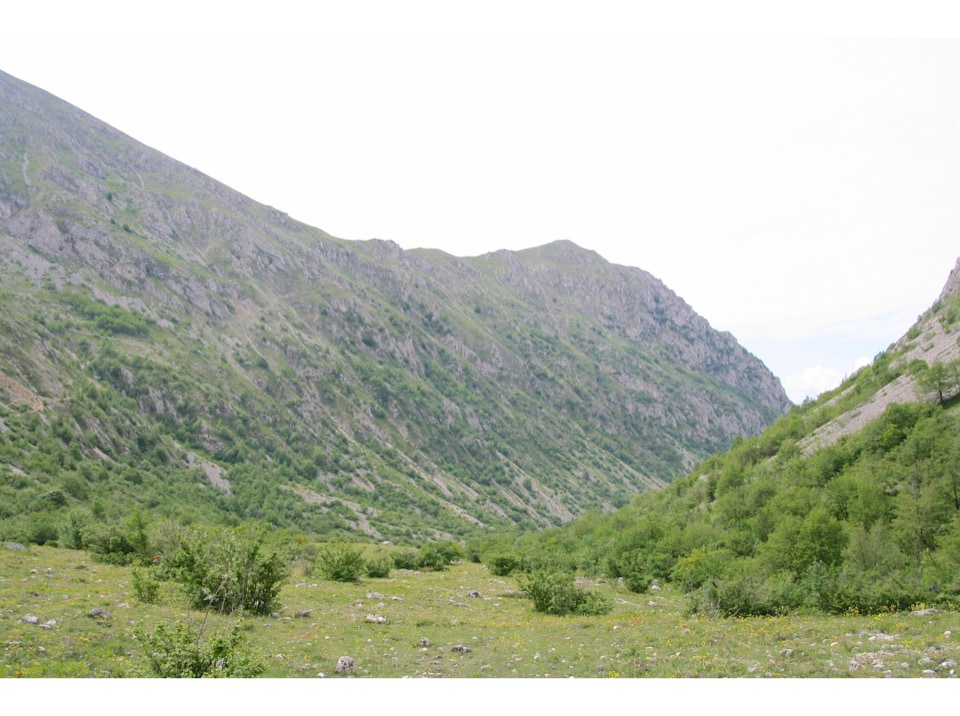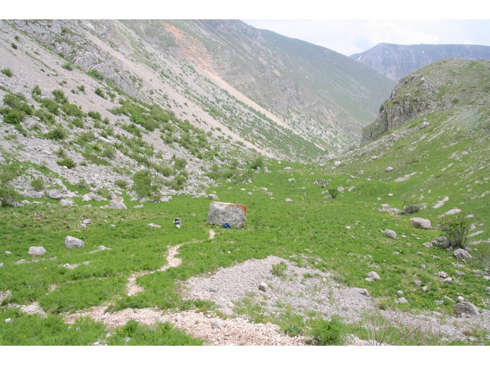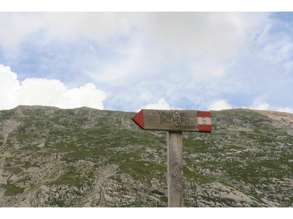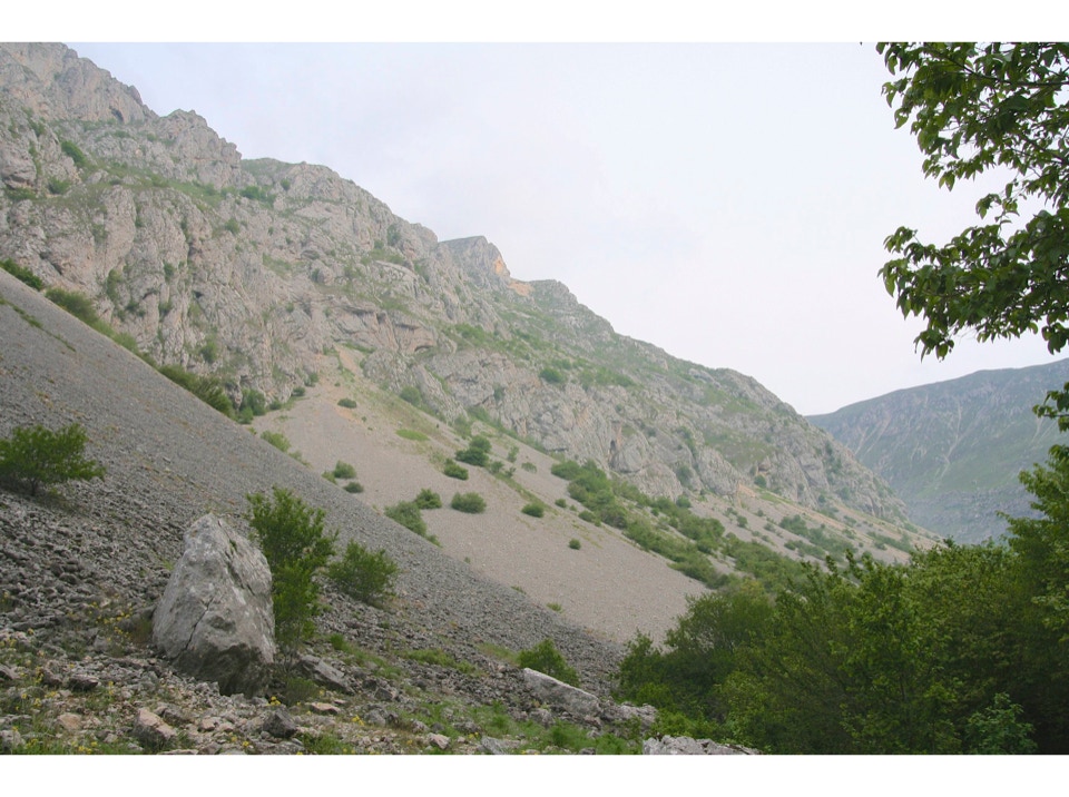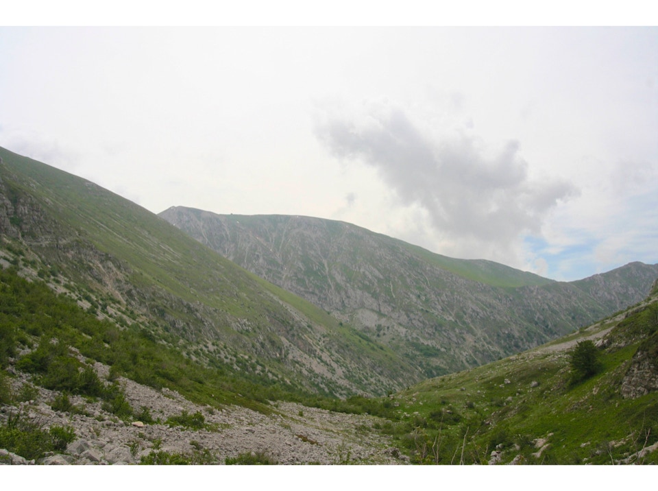 Dal Rifugio Casale da Monte si prende la carrareccia in direzione Forme di Massa d’Albe, si prosegue per pochi minuti fino a Peschio Rovicino m 1133 riconoscibile dalla bacheca della Forestale e da un cippo di pietra a memoria di due escursionisti . Da qui il sentiero su traccia evidente percorre tutta la Valle Majellama (ore 1) fino a piegare a sn ed immettersi nel Vallone del Bicchero che tra le pareti di Costa Stellata a ds e il versante nord dei Pratoni di Cafornia a sn, giunge al Colle del Bicchero m 2075.