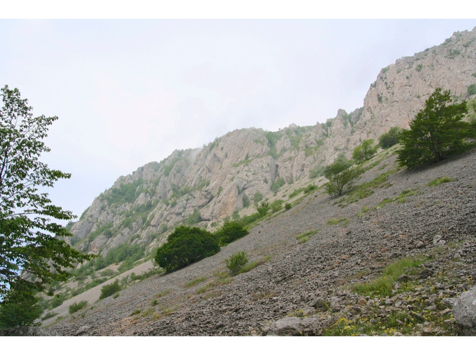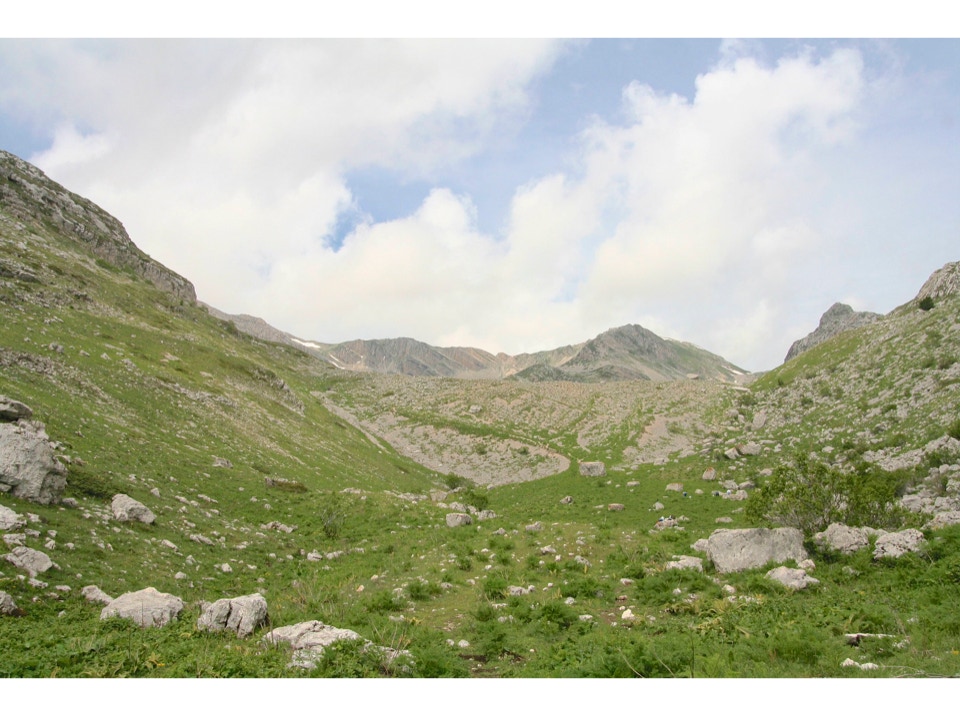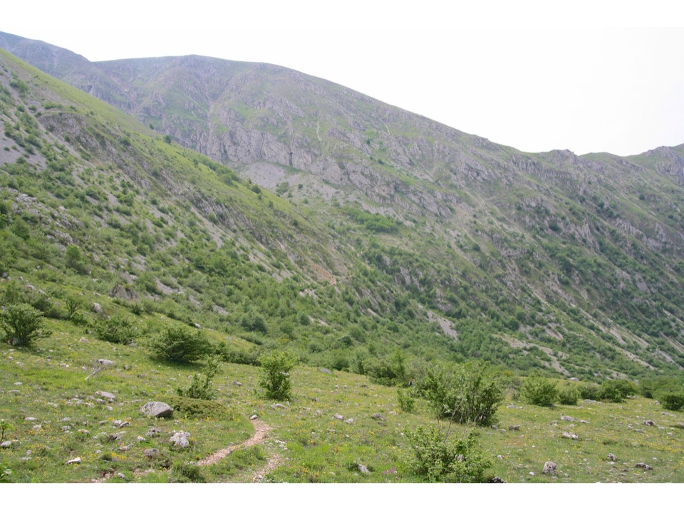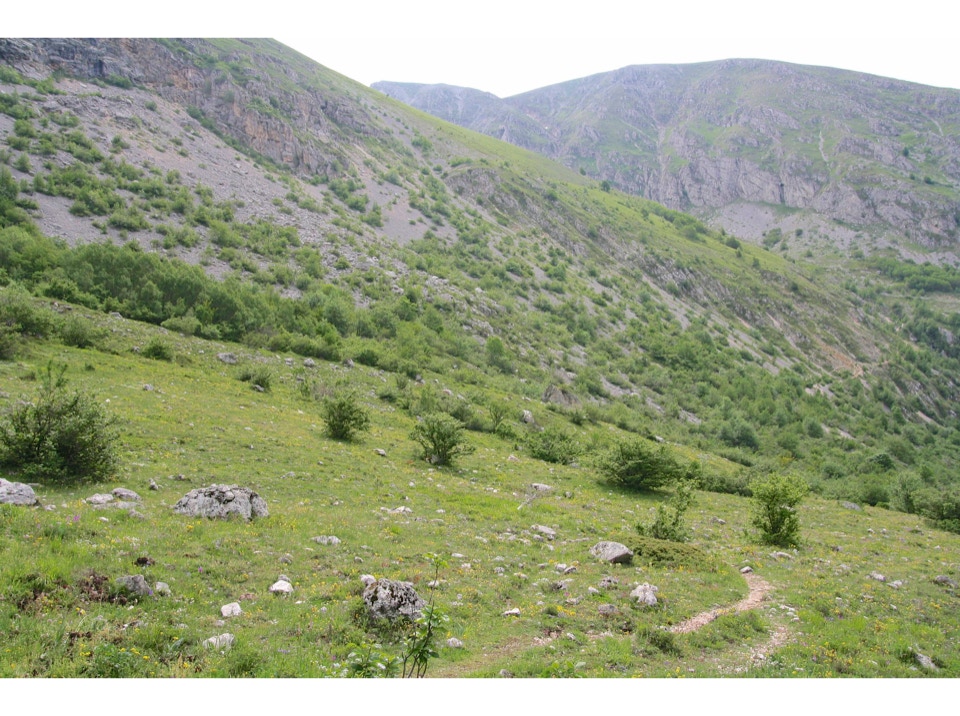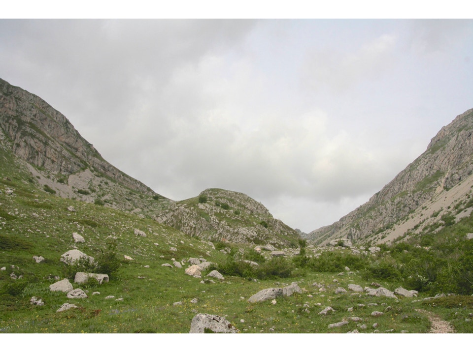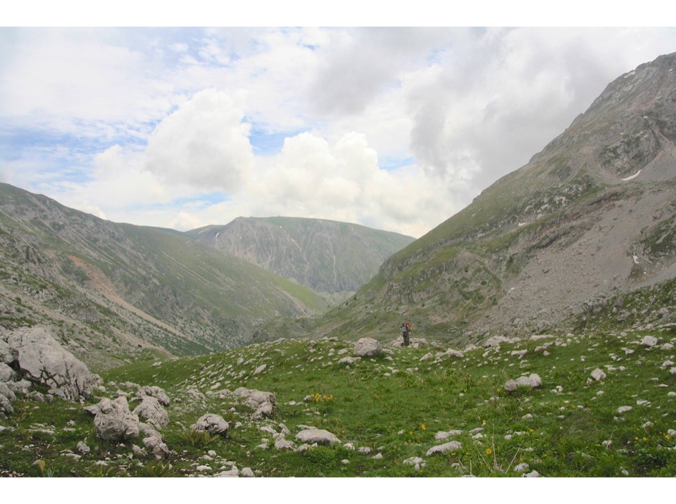 Dal Rifugio Casale da Monte si prende la carrareccia in direzione Forme di Massa d’Albe, si prosegue per pochi minuti fino a Peschio Rovicino m 1133 riconoscibile dalla bacheca della Forestale e da un cippo di pietra a memoria di due escursionisti . Da qui il sentiero su traccia evidente percorre tutta la Valle Majellama (ore 1) fino a piegare a sn ed immettersi nel Vallone del Bicchero che tra le pareti di Costa Stellata a ds e il versante nord dei Pratoni di Cafornia a sn, giunge al Colle del Bicchero m 2075.
