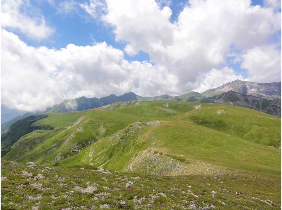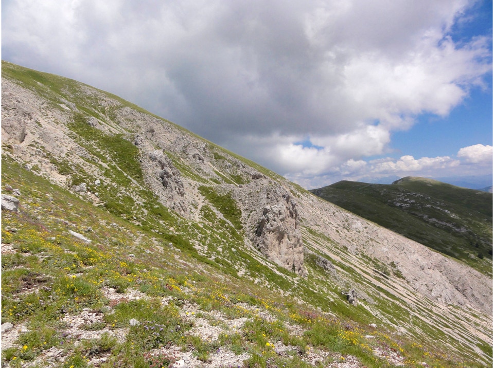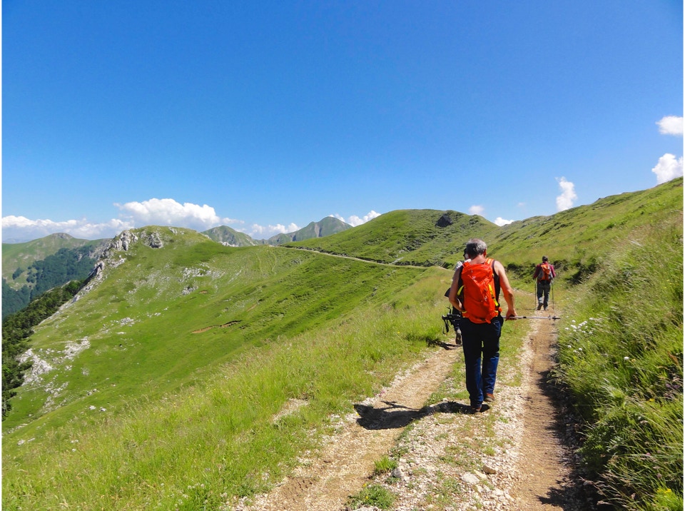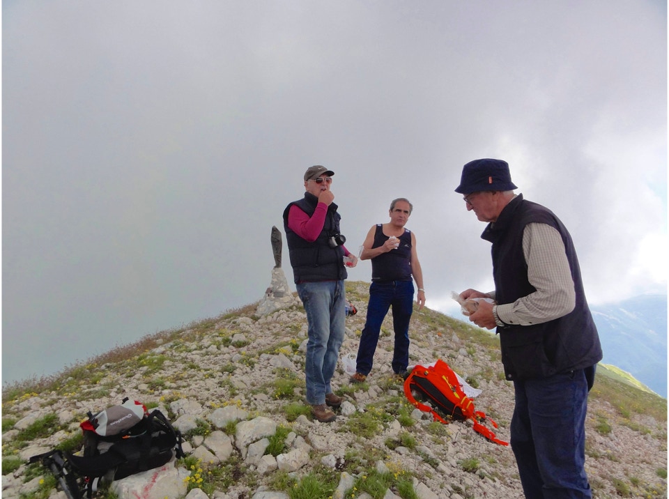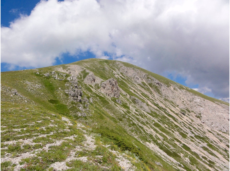 Percorso a piedi: all’andata si è seguita la sterrata che con ripidi tornanti raggiunge un bivio, dal quale si diparte un sentiero (CAI 440). Questo attraversa con modesta pendenza la Costa Ghiaiosa, aggira la pendice nord del Monte I Porcini (CAI 441), in vista del Rif. Maiolica e più avanti si ricongiunge con la sterrata che proviene dal Buco del Merlo. Successivamente la strada scende leggermente verso i pascoli del versante sud-ovest del Monte di Cambio, aggira una modesta elevazione e dirige verso est al Colle delle Pozze, arrivando alla sella sotto l’edificio sommitale del Monte di Cambio; da qui, sempre in direzione nord, si salgono gli ultimi 150 m di dislivello, fino a giungere in vetta. Il ritorno è stato effettuato seguendo per il primo tratto la linea di crinale verso il Colle delle Pozze (CAI 429), fino a raggiungere la sterrata che passando sotto il monte I Porcini (lato est), raggiunge il Buco del Merlo e i tornanti che riconducono alla SP Vallonina.