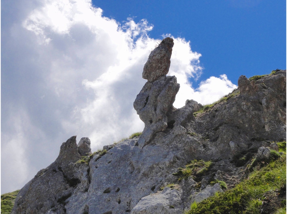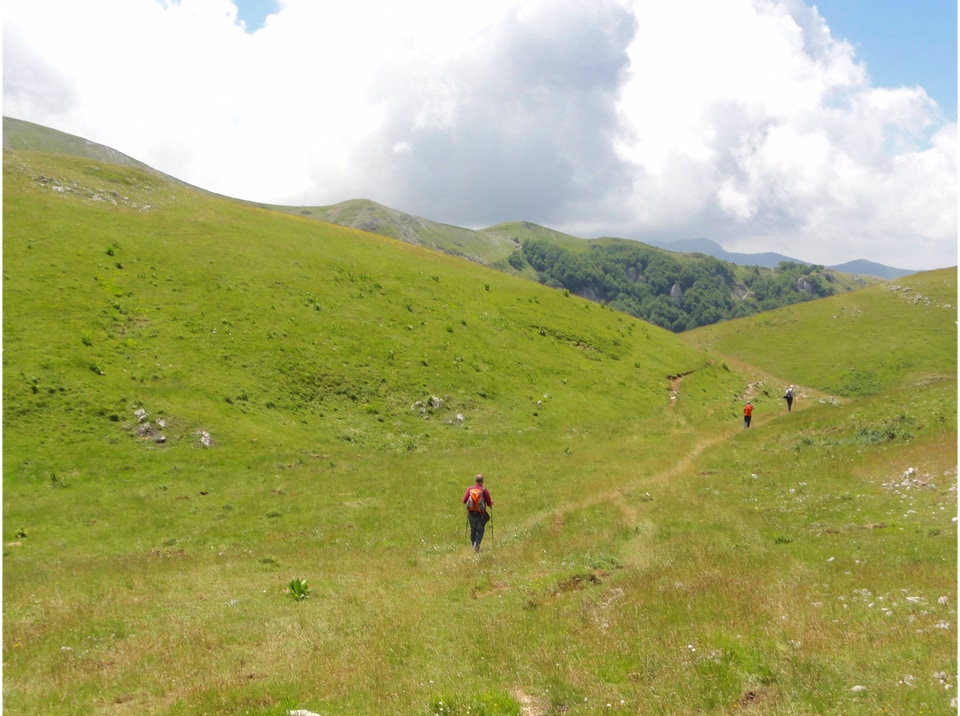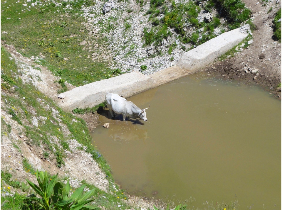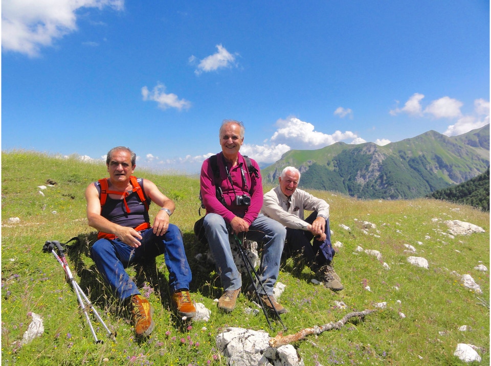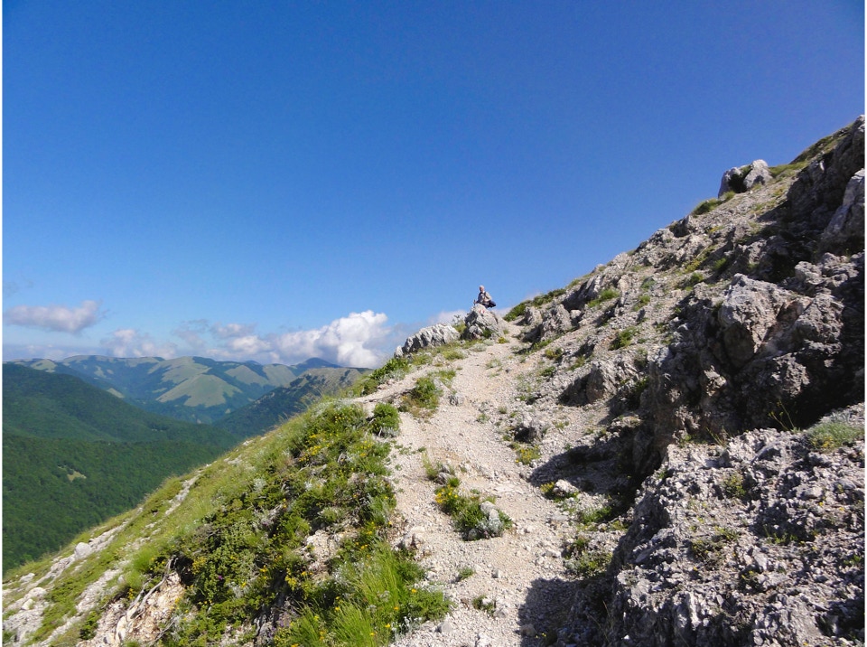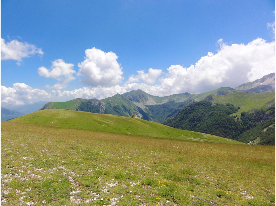 Percorso a piedi: all’andata si è seguita la sterrata che con ripidi tornanti raggiunge un bivio, dal quale si diparte un sentiero (CAI 440). Questo attraversa con modesta pendenza la Costa Ghiaiosa, aggira la pendice nord del Monte I Porcini (CAI 441), in vista del Rif. Maiolica e più avanti si ricongiunge con la sterrata che proviene dal Buco del Merlo. Successivamente la strada scende leggermente verso i pascoli del versante sud-ovest del Monte di Cambio, aggira una modesta elevazione e dirige verso est al Colle delle Pozze, arrivando alla sella sotto l’edificio sommitale del Monte di Cambio; da qui, sempre in direzione nord, si salgono gli ultimi 150 m di dislivello, fino a giungere in vetta. Il ritorno è stato effettuato seguendo per il primo tratto la linea di crinale verso il Colle delle Pozze (CAI 429), fino a raggiungere la sterrata che passando sotto il monte I Porcini (lato est), raggiunge il Buco del Merlo e i tornanti che riconducono alla SP Vallonina.