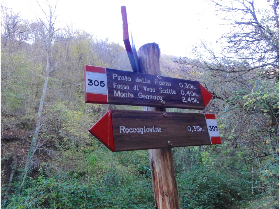 Dalla piazza principale di Roccagiovine si percorre Via della Fonte e Via Core Tondo fino al termine della strada asfaltata, dove si parcheggia e si continua per la carrareccia (n. 305). Si oltrepassano degli edifici e si raggiunge il bosco del Fosso Canepine; si prosegue in salita, e giunti in corrispondenza di due tornanti, si lascia a sinistra il vallone della Stretta Vallicina, e si raggiunge in breve il Prato delle Forme. Si continua svoltando decisamente a sud e, seguendo il sentiero n. 305A e successivamente il 305B, si giunge sulla cima di Monte Follettoso (m 1004), dove si apre un bellissimo panorama sui monti Lucretili e sui lontani Gran Sasso e Velino.
