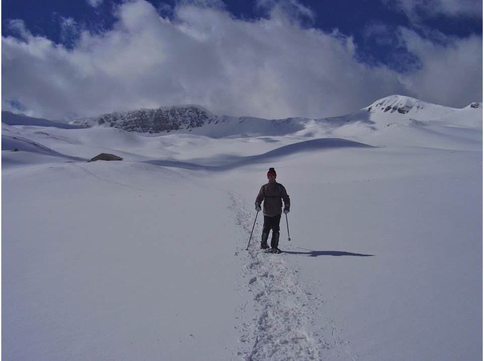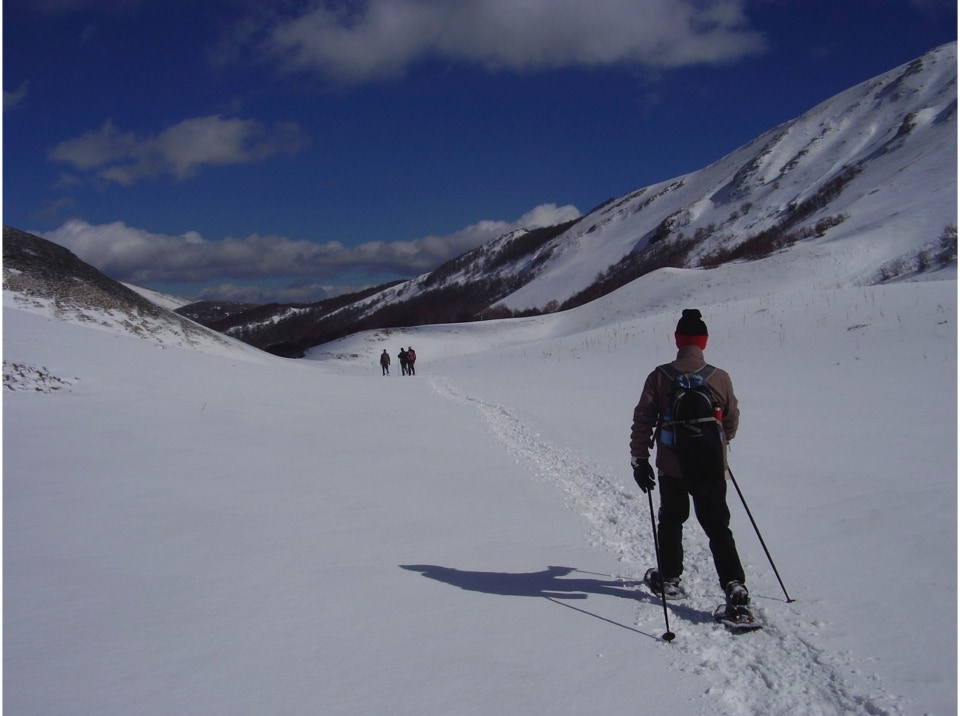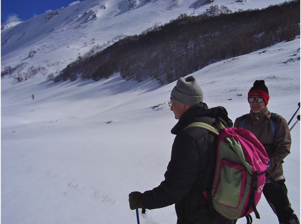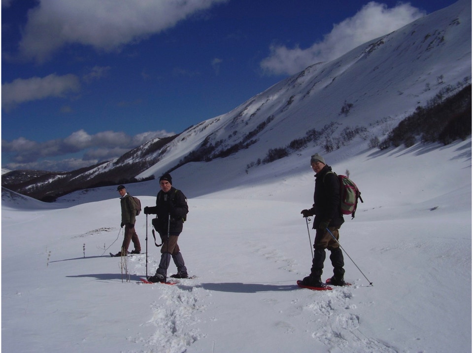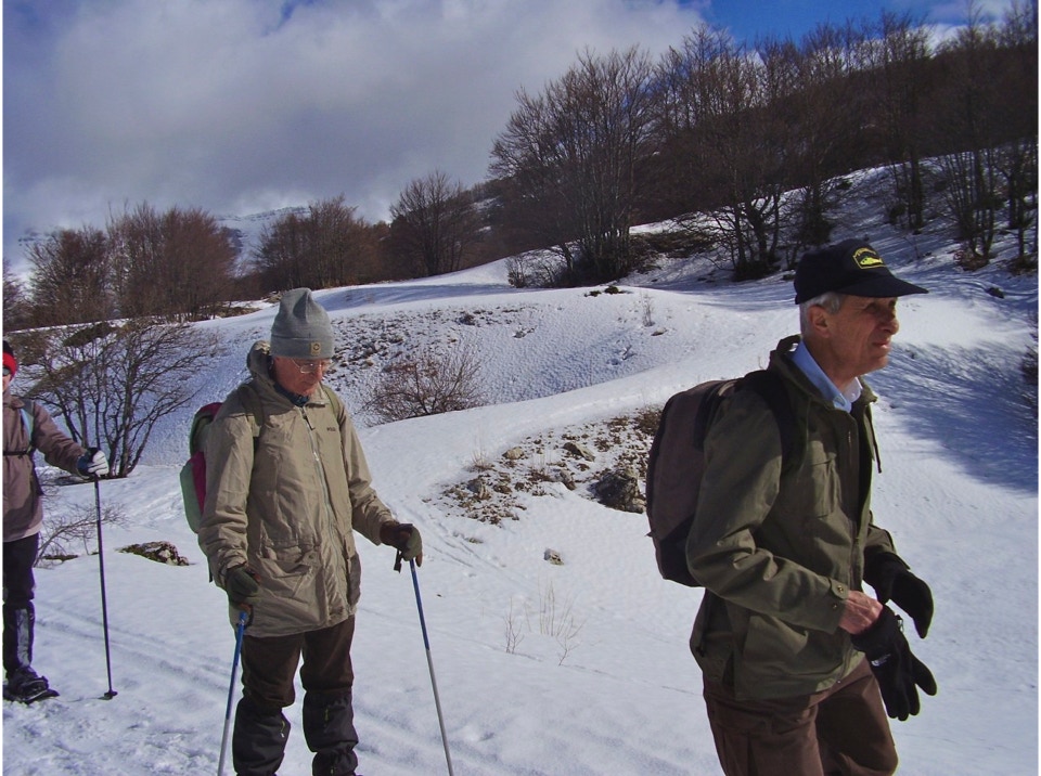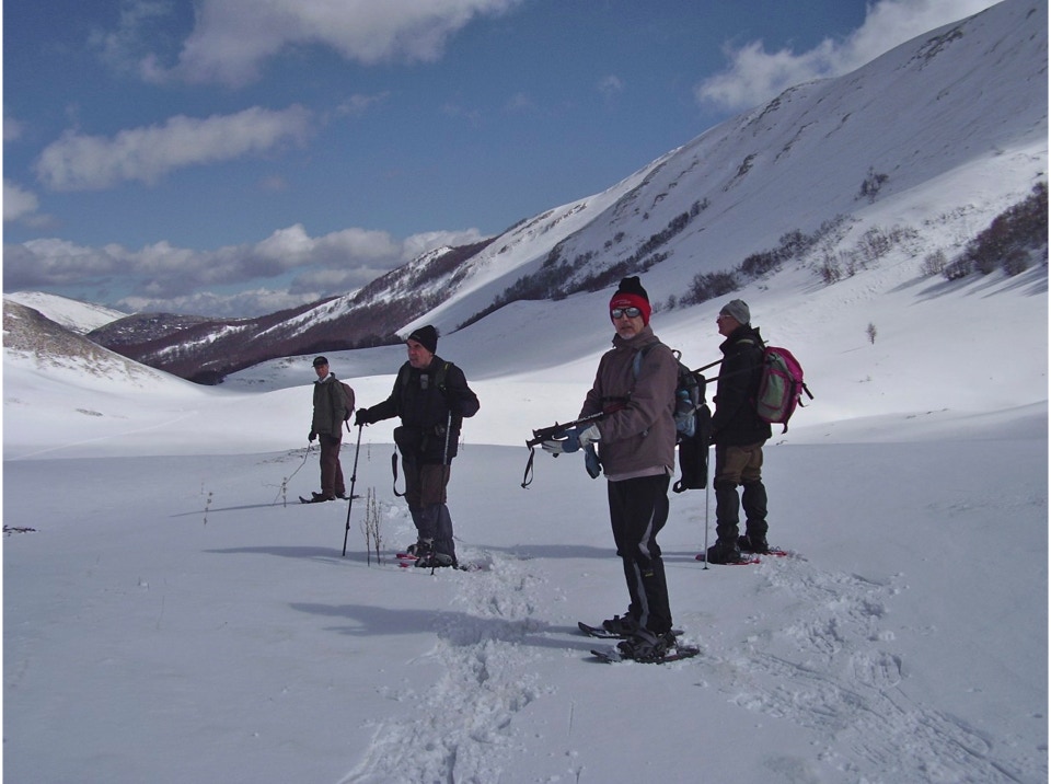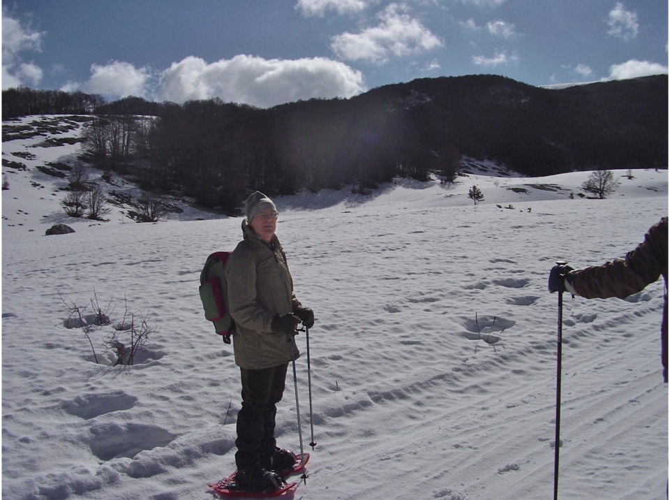 Ennesima ripetizione di una classica “ciaspolata”, con una giornata splendida, con discreto innevamento e con neve piuttosto sfatta a causa della temperatura abbastanza elevata, anche se inizialmente era presente una leggera spolverata notturna. Per un lungo tratto ci hanno accompagnato le tracce di due lupi piuttosto grossi, diretti verso la parte alta della Valle Leona.