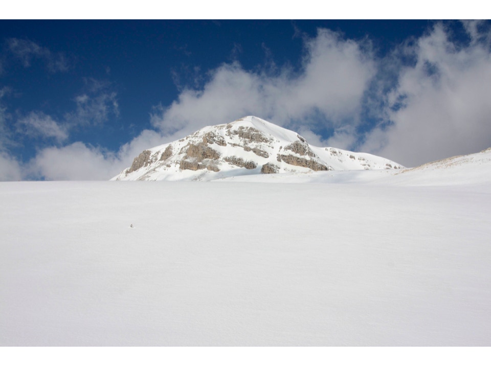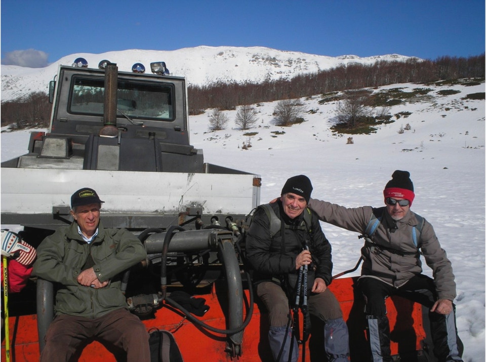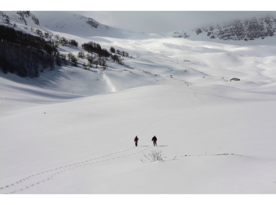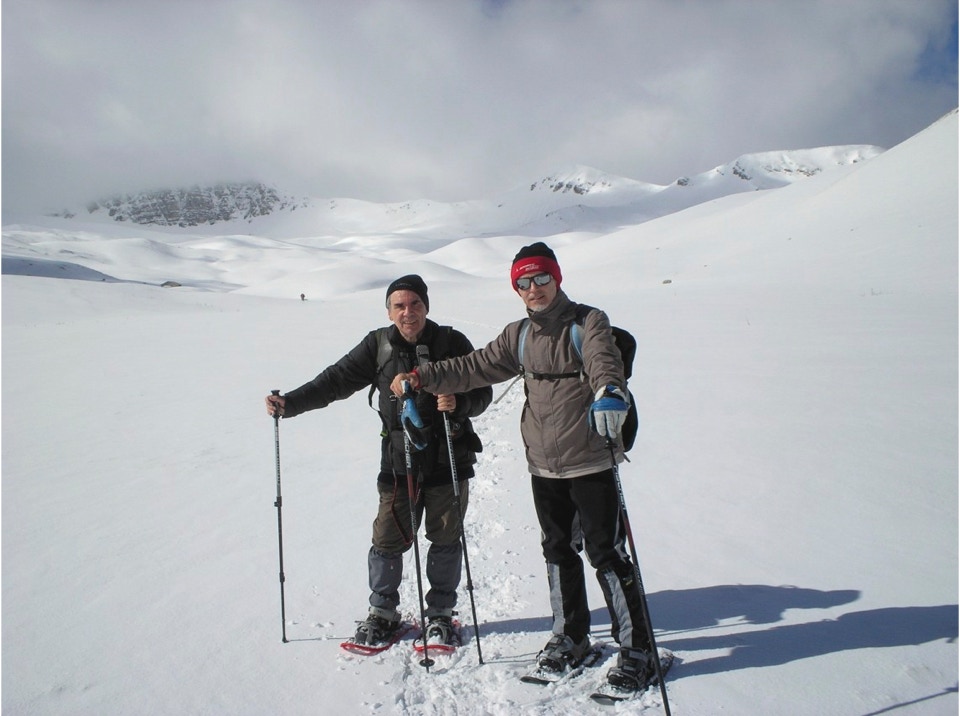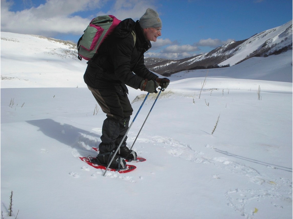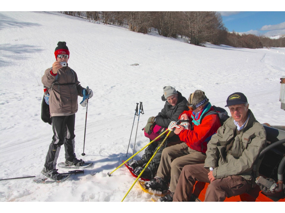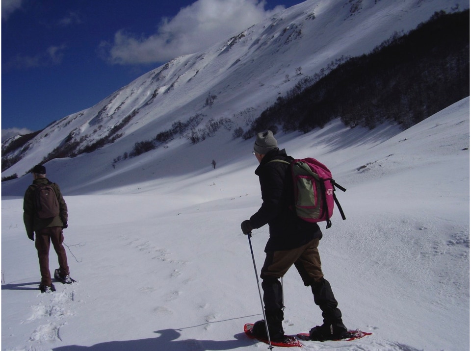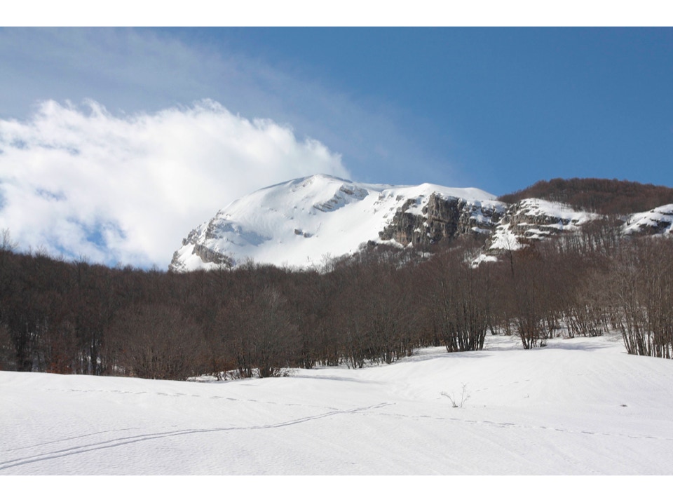 Ennesima ripetizione di una classica “ciaspolata”, con una giornata splendida, con discreto innevamento e con neve piuttosto sfatta a causa della temperatura abbastanza elevata, anche se inizialmente era presente una leggera spolverata notturna. Per un lungo tratto ci hanno accompagnato le tracce di due lupi piuttosto grossi, diretti verso la parte alta della Valle Leona.